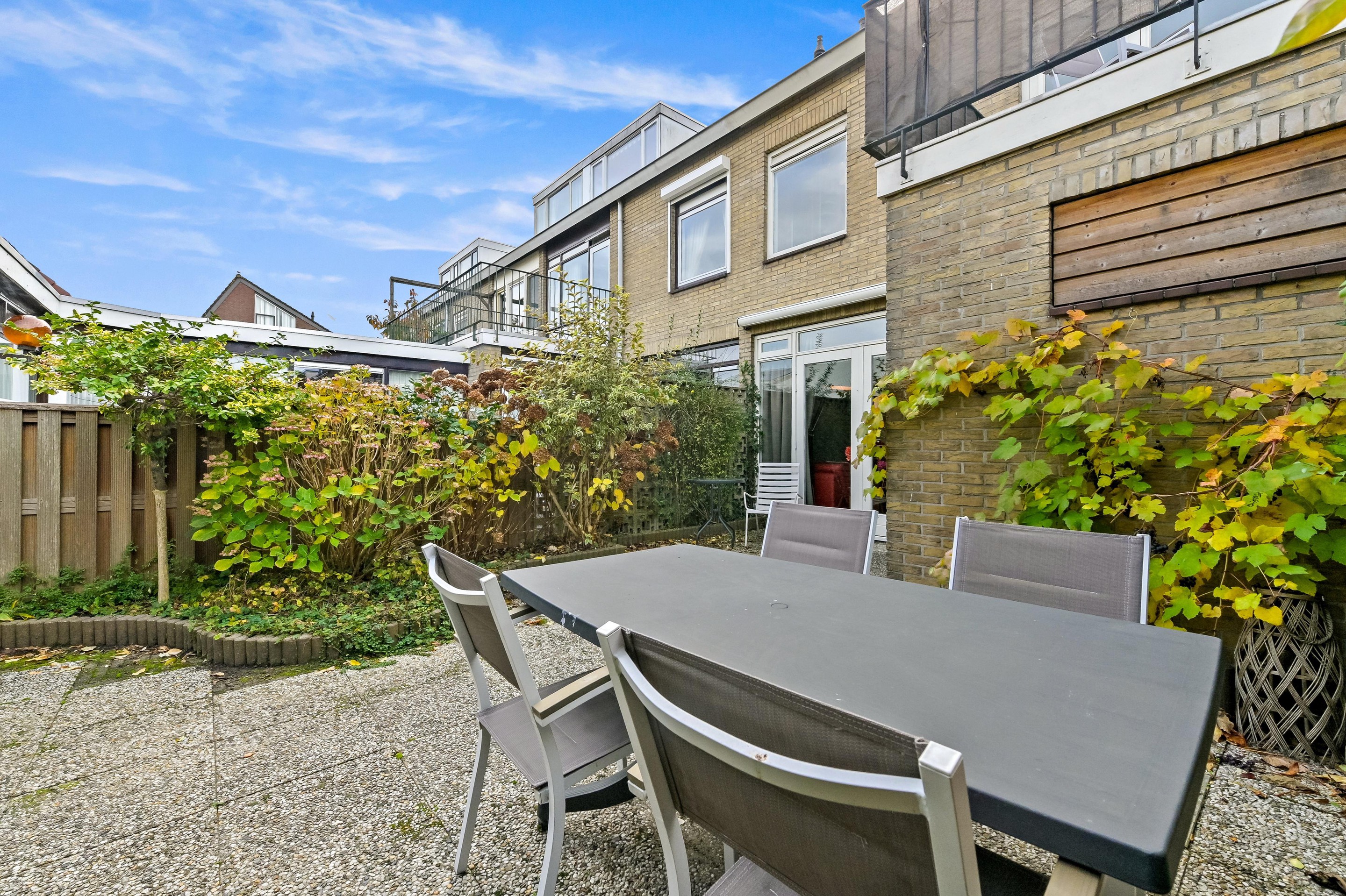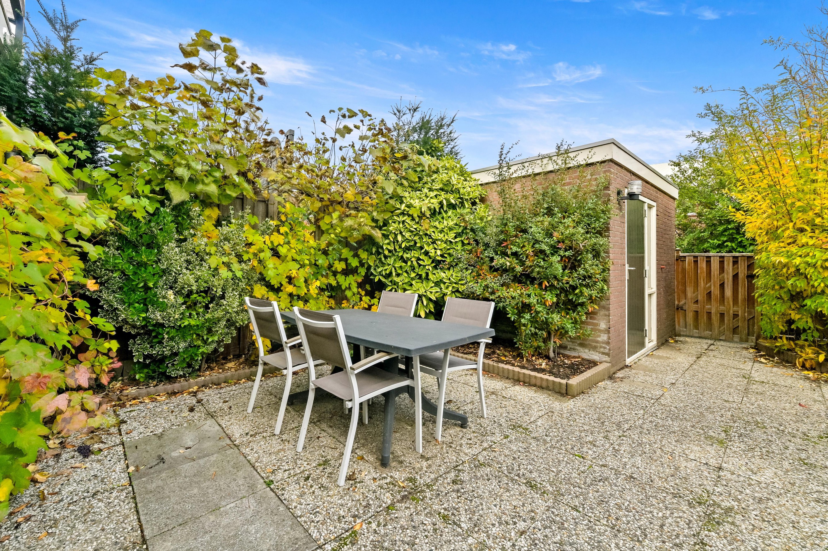 De achtertuin wordt op dit moment gebruikt als buitenruimte voor het begane grond. Aan de achtergevel is een elektrisch bedienbaar zonnescherm gemonteerd. Achterin de tuin bevindt zich een stenen fietsenberging, deze wordt nu gedeeld. De achtertuin is tevens toegankelijk via de achterom.