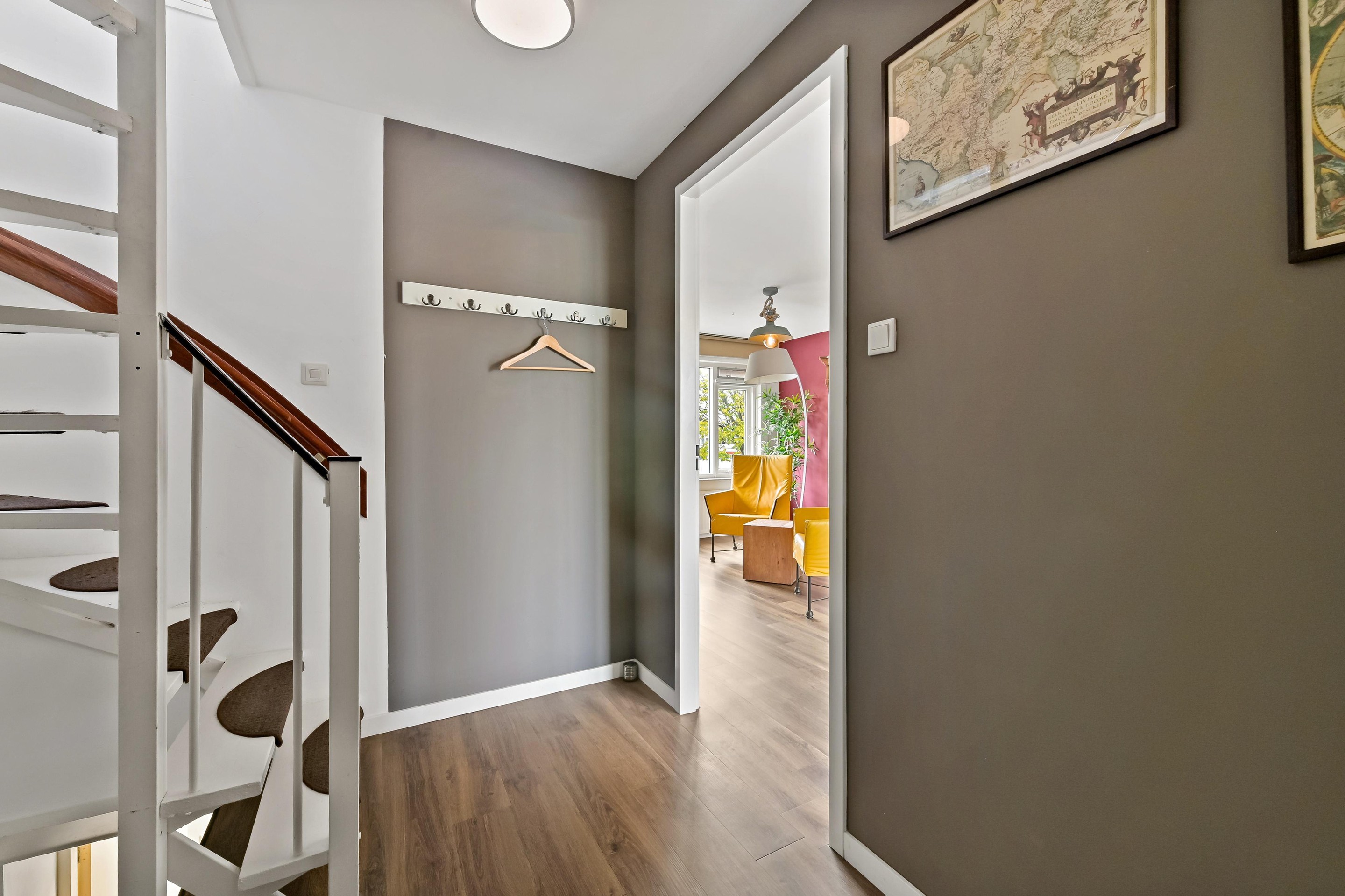 Via de voortuin kom je bij de entree van de woning. In de hal is de meterkast aanwezig met twee compleet vernieuwde groepenkasten. Vervolgens zijn er in de hal twee tussendeuren aanwezig, welke beide toegang bieden tot een woonruimte op de begane grond en de andere deur geeft toegang tot woonruimte op de eerste en tweede verdieping. De inrichting biedt nu een grote mate van zelfstandigheid aan de twee woonruimten. Twee keukens, twee badkamers, twee CV installaties en door de tussendeuren privacy in de eigen woon- en slaapruimten. Maar uiteraard kan het ook weer als eengezinswoning gebruikt worden.
