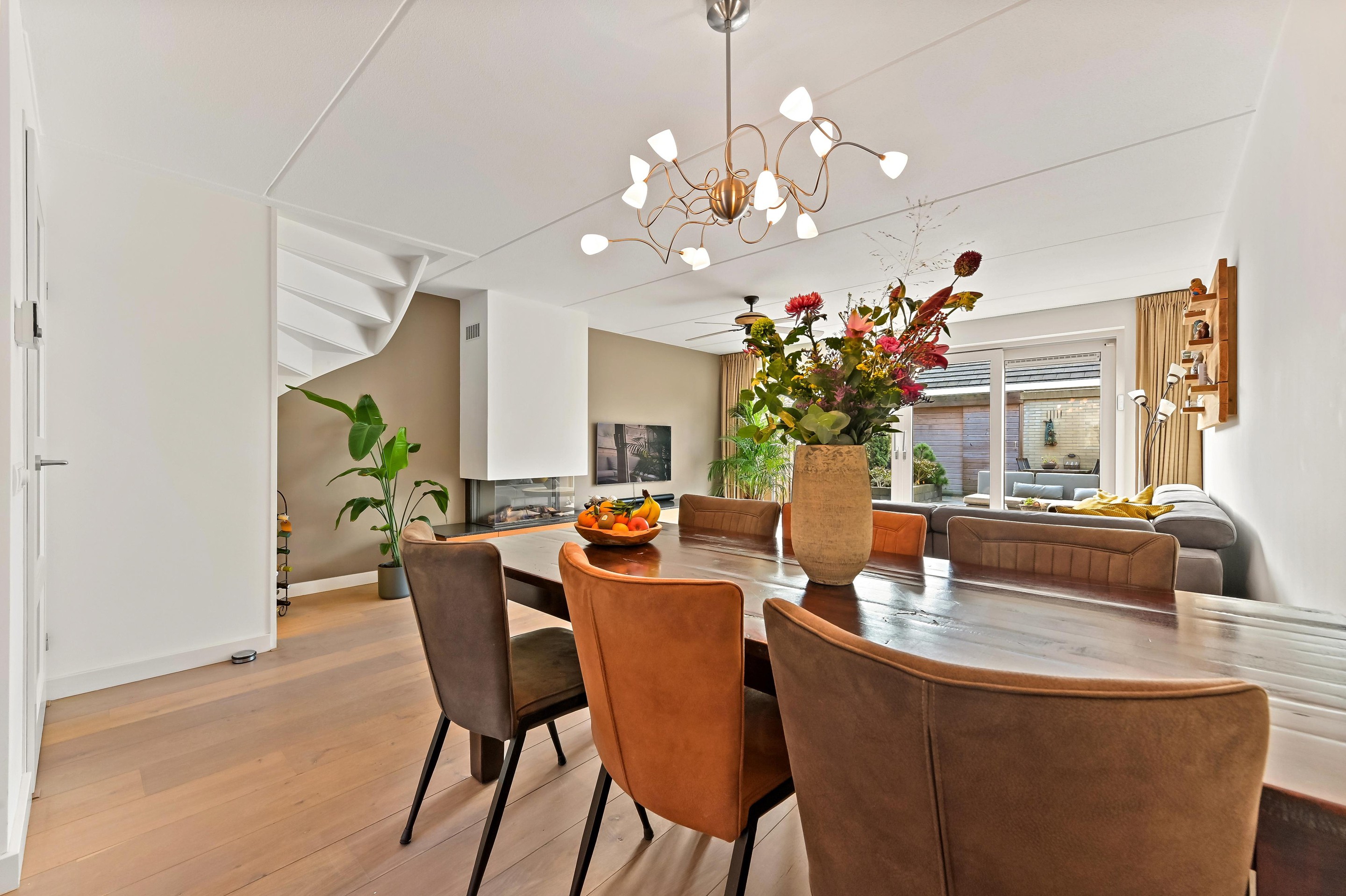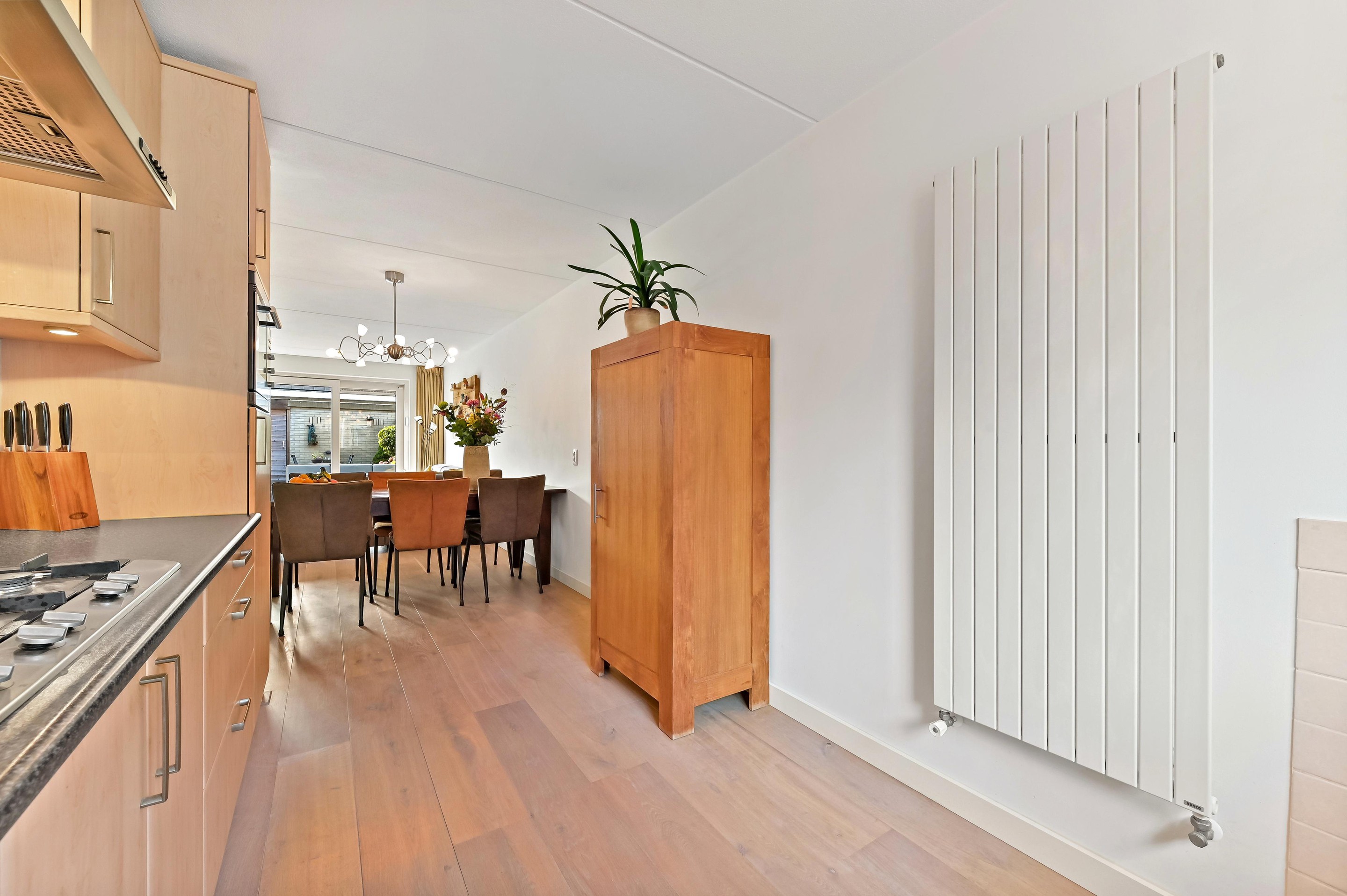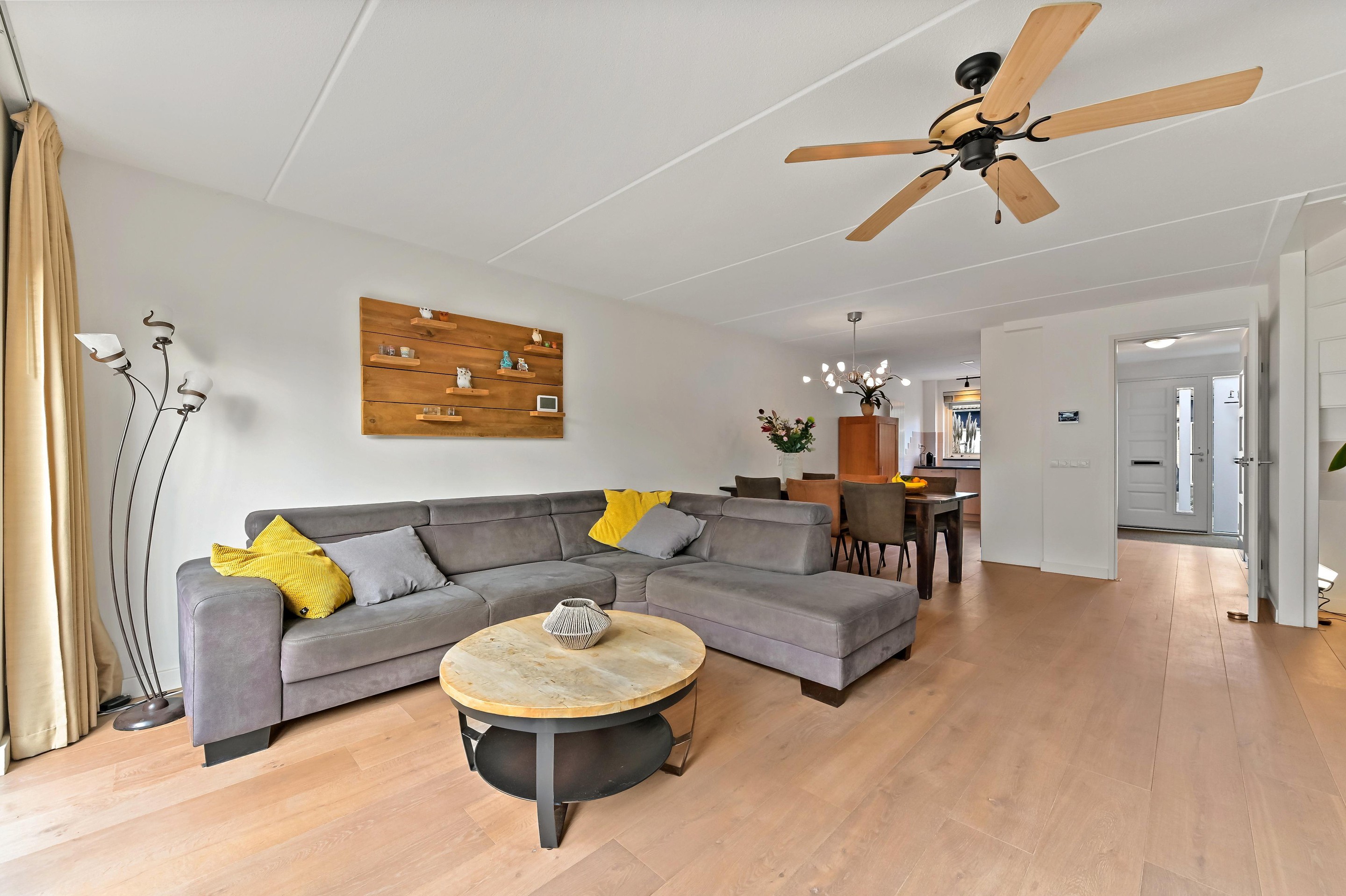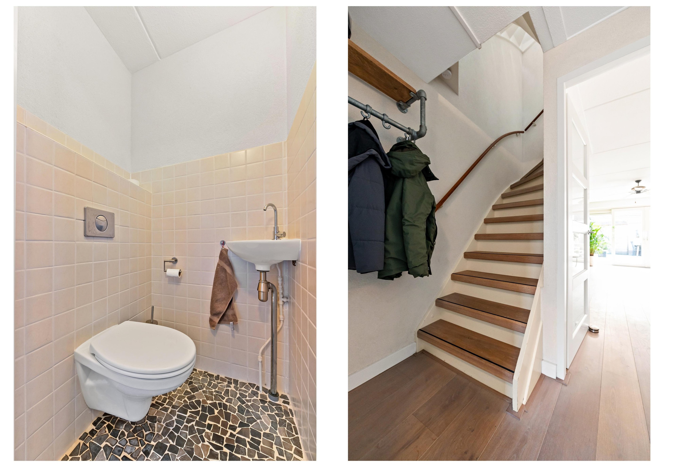 Via de voortuin met eigen oprit en buitenkraan bereikt u de entree van de woning. In de ruime hal vindt u de meterkast, trapopgang naar de eerste verdieping en een bergkast met de verdeler van de vloerverwarming. De toiletruimte is voorzien van wandcloset en fonteintje. Vanuit de hal bereikt u de tuingerichte woonkamer met dubbele schuifpui naar de zonnige achtertuin op het zuidwesten. De woonkamer is sfeervol ingericht en voorzien van een wandmeubel met gashaard, welke in de woning achterblijft. De eethoek grenst aan de keuken welke aan de voorzijde van de woning te vinden is. De keuken in L-opstelling is ruim van formaat en voorzien van diverse inbouwapparatuur, waaronder een 5 pits gaskookplaat, RVS afzuigkap, koelkast met vriesvak, combi-magnetron en vaatwasser. Ook is er een 10 liter boiler aanwezig waardoor u snel beschikt over warm water. Op de begane grond is een houten lamel vloer aanwezig welke indien gewenst nog meerdere keren kan worden opgeschuurd. De zonnige tuin is verzorgd aangelegd en gelegen op het zuidwesten, deze is bereikbaar vanuit de woning en via het achterom waar tevens plek is voor het stallen van de afvalcontainers. In de achtertuin is een stenen berging aanwezig en aangrenzende overkapping; perfect voor bijvoorbeeld het stallen van de fietsen. Aan de achtergevel is een elektrisch bedienbaar zonnescherm en buitenkraan gemonteerd.