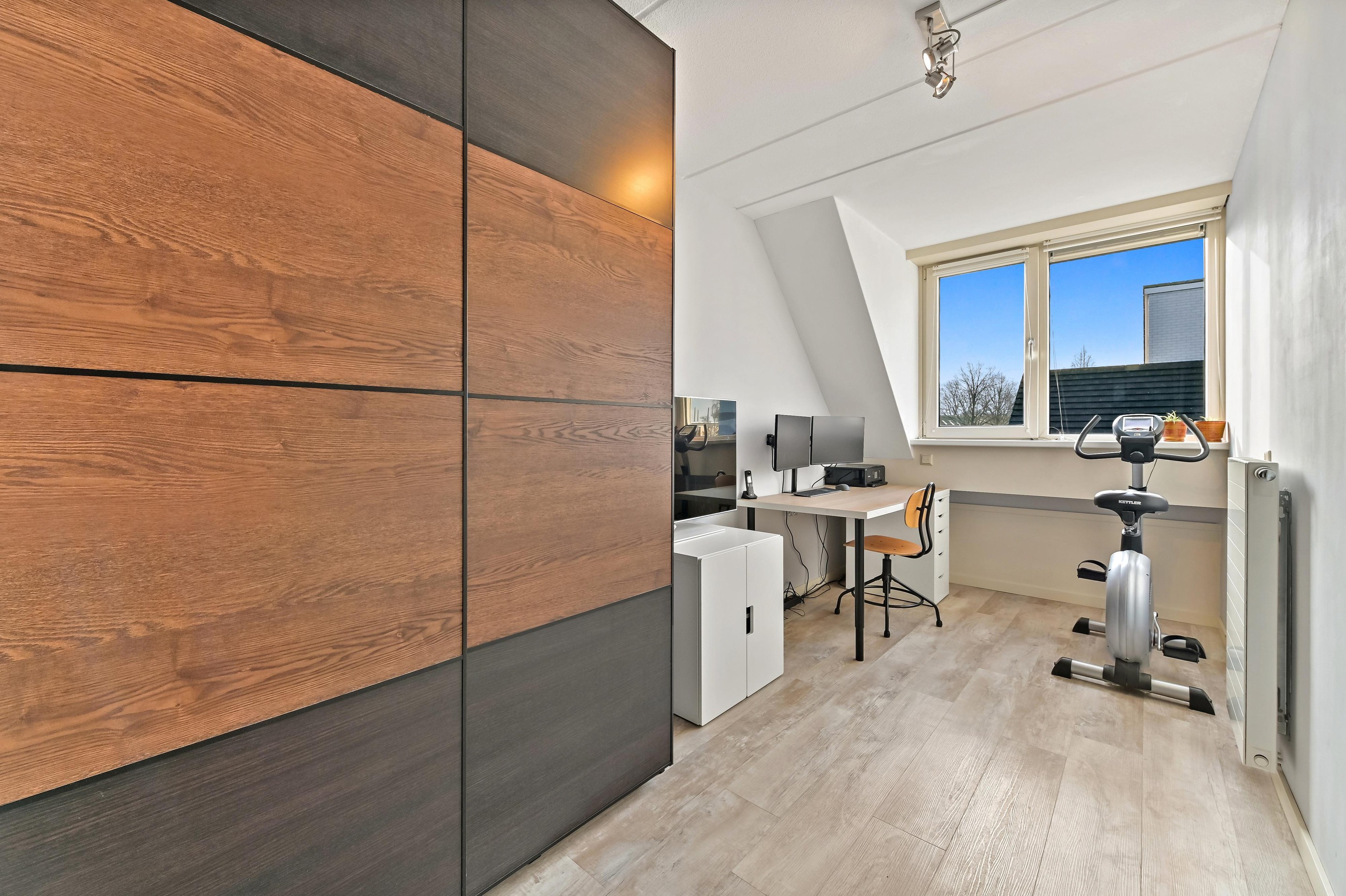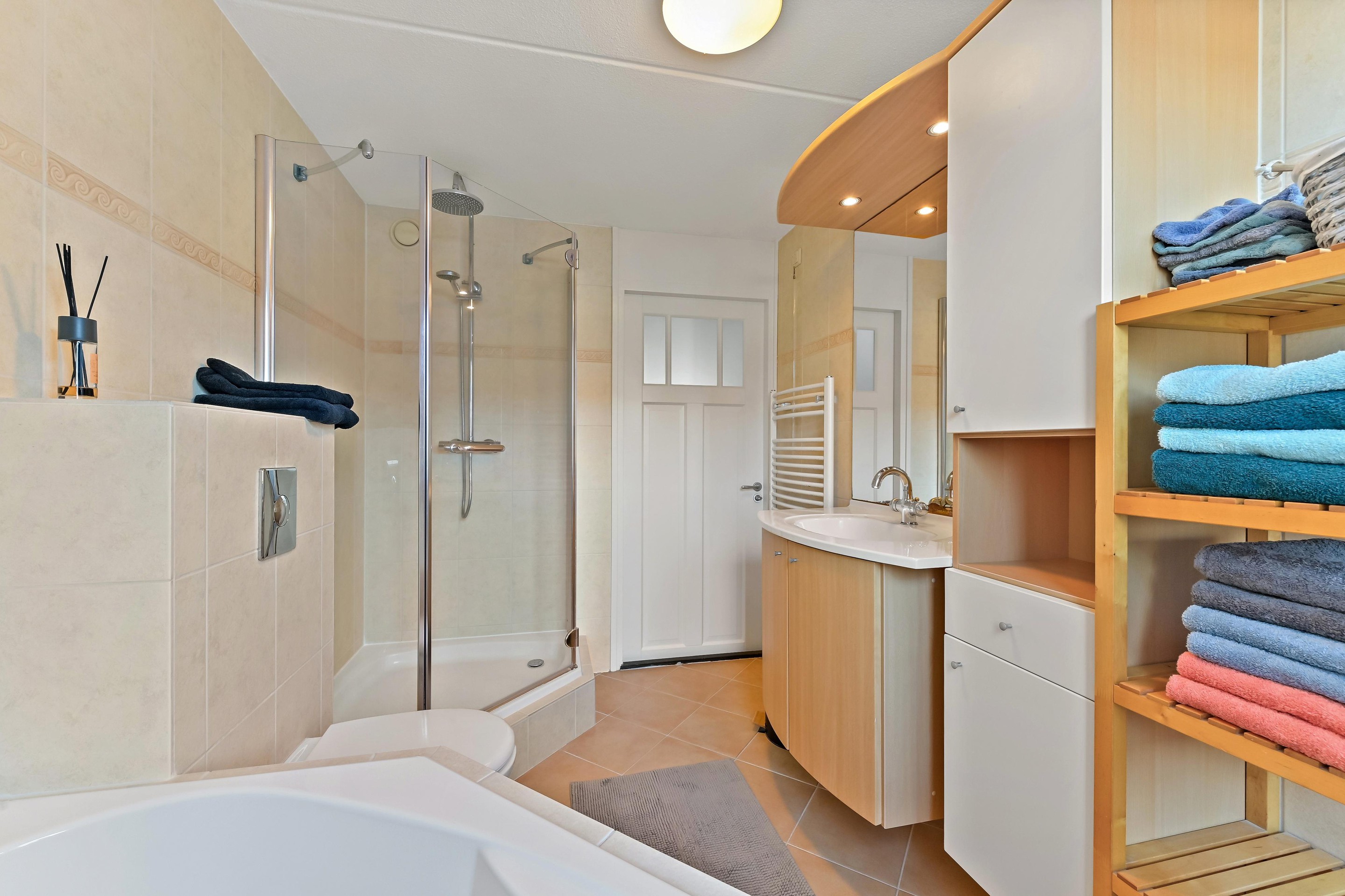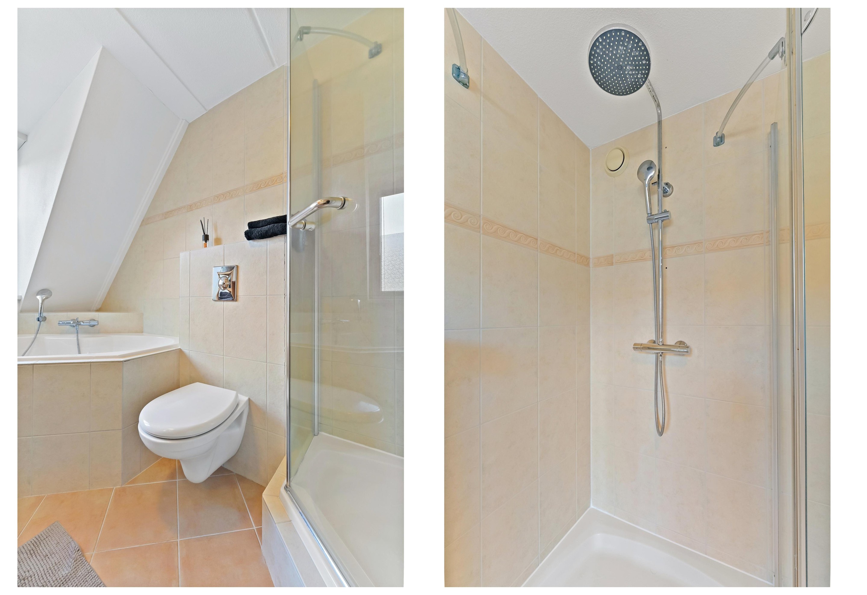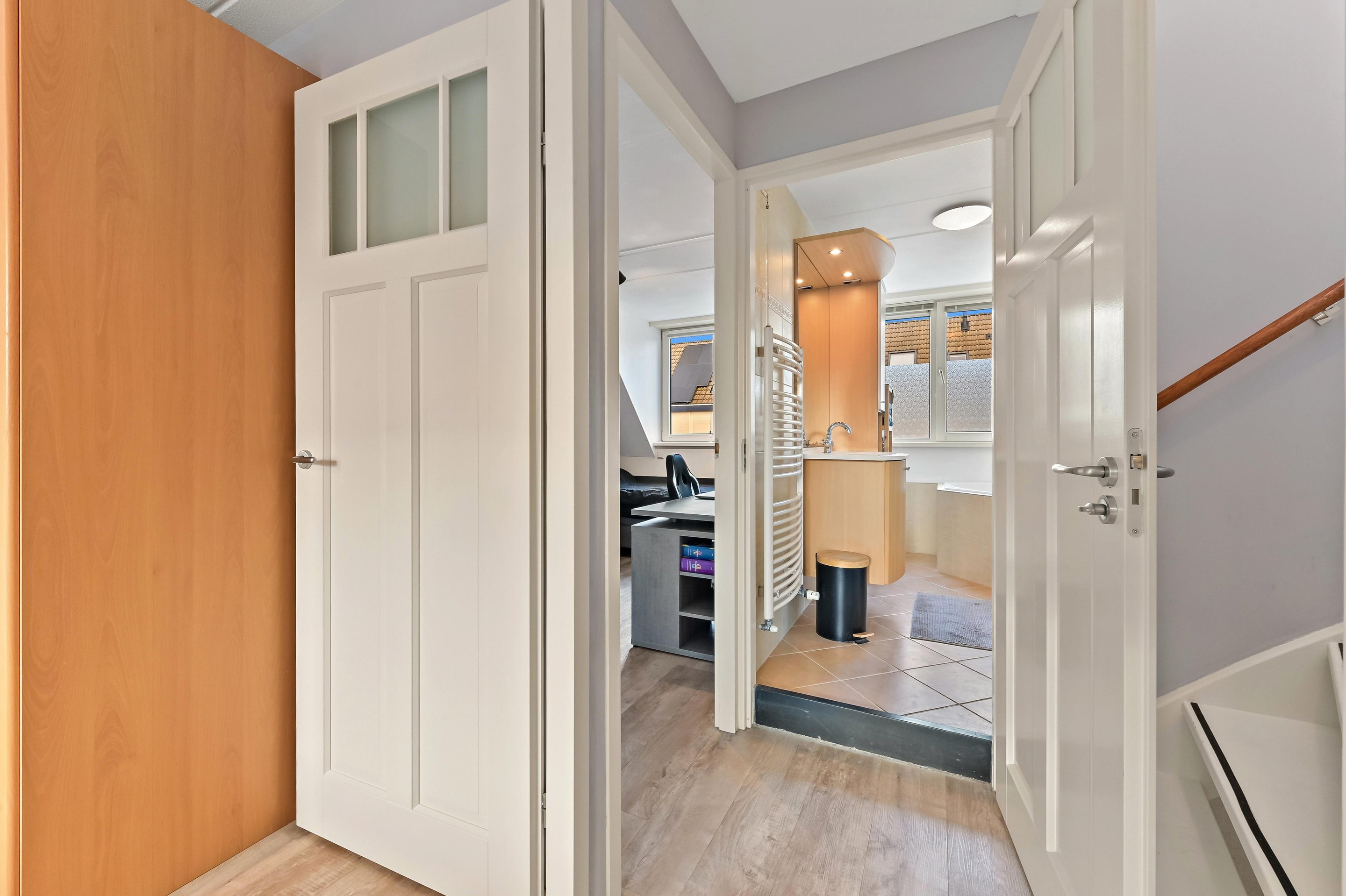 De eerste verdieping met trapopgang naar de zolderetage biedt toegang tot drie ruime slaapkamers en de badkamer. De hoofdslaapkamer bevindt zich aan de achterzijde evenals de tweede slaapkamer welke op dit moment wordt gebruikt als kantoorruimte aan huis. Aan de voorzijde van de woning is de derde slaapkamer te vinden. De badkamer is compleet uitgerust met ligbad, douchecabine met rainshower, tweede toilet en wastafelmeubel. De eerste verdieping is (met uitzondering van de badkamer) voorzien van een nette PVC vloer en gestucte wanden. Dankzij de grote dakkapellen welke zijn voorzien van elektrisch bedienbare rolluiken is de eerste verdieping heerlijk ruim.