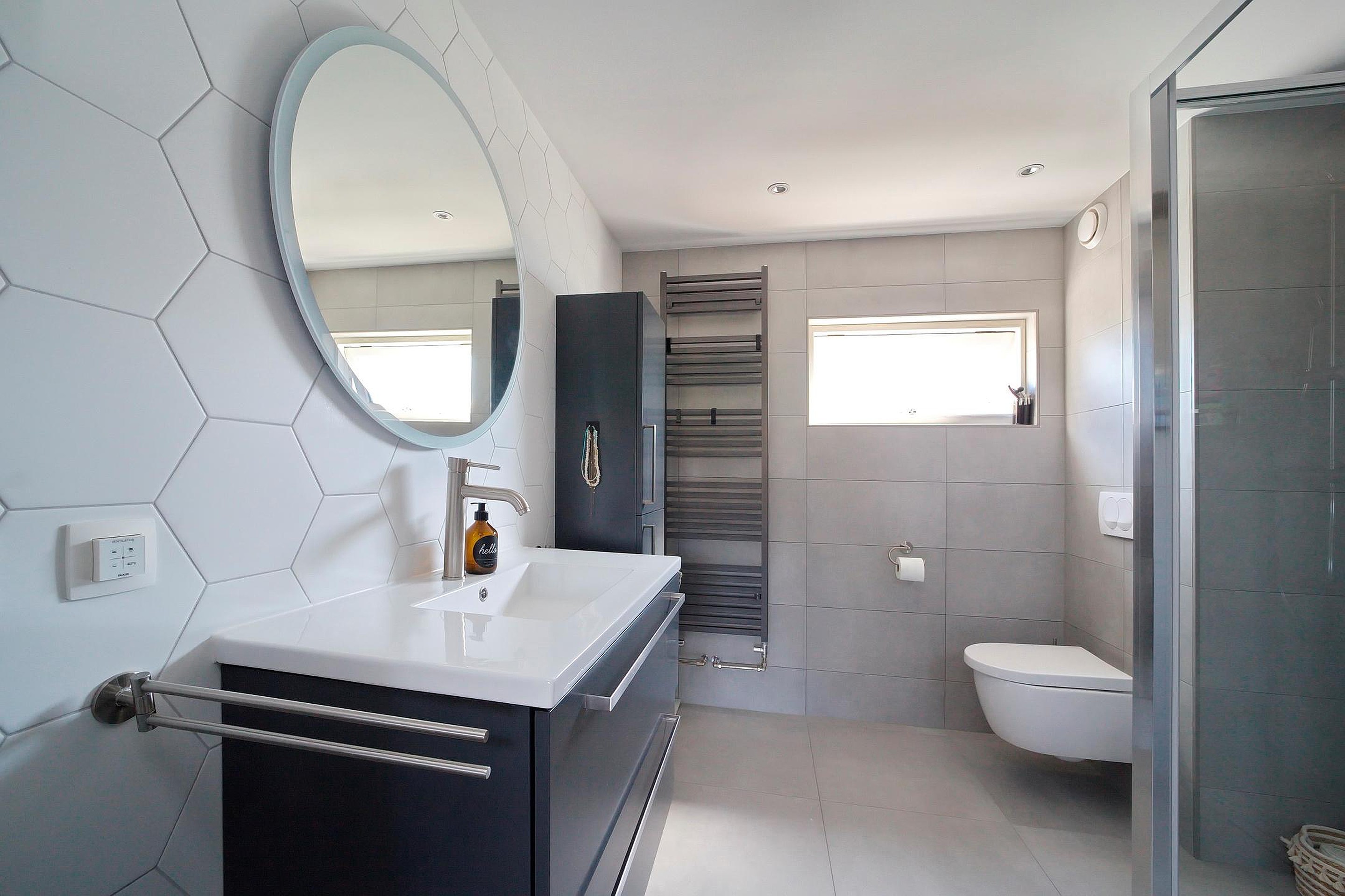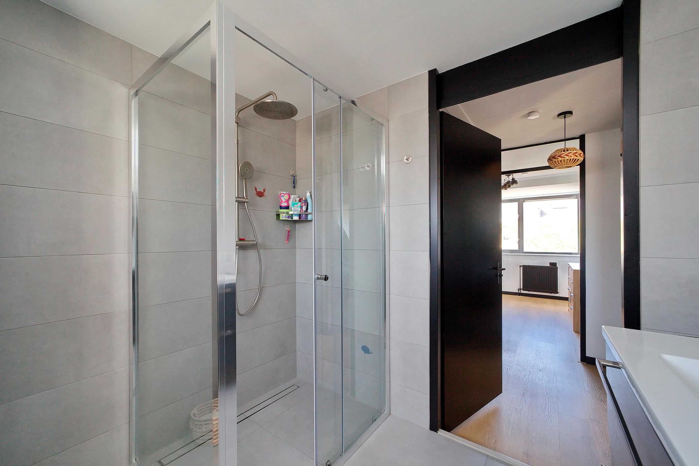 De fraaie badkamer heeft een ruime glazen douchecabine met regendouche, hangend toilet, wastafelmeubel, spiegel met indirecte verlichting en verwarming, handdoeken radiator en mechanische ventilatie.