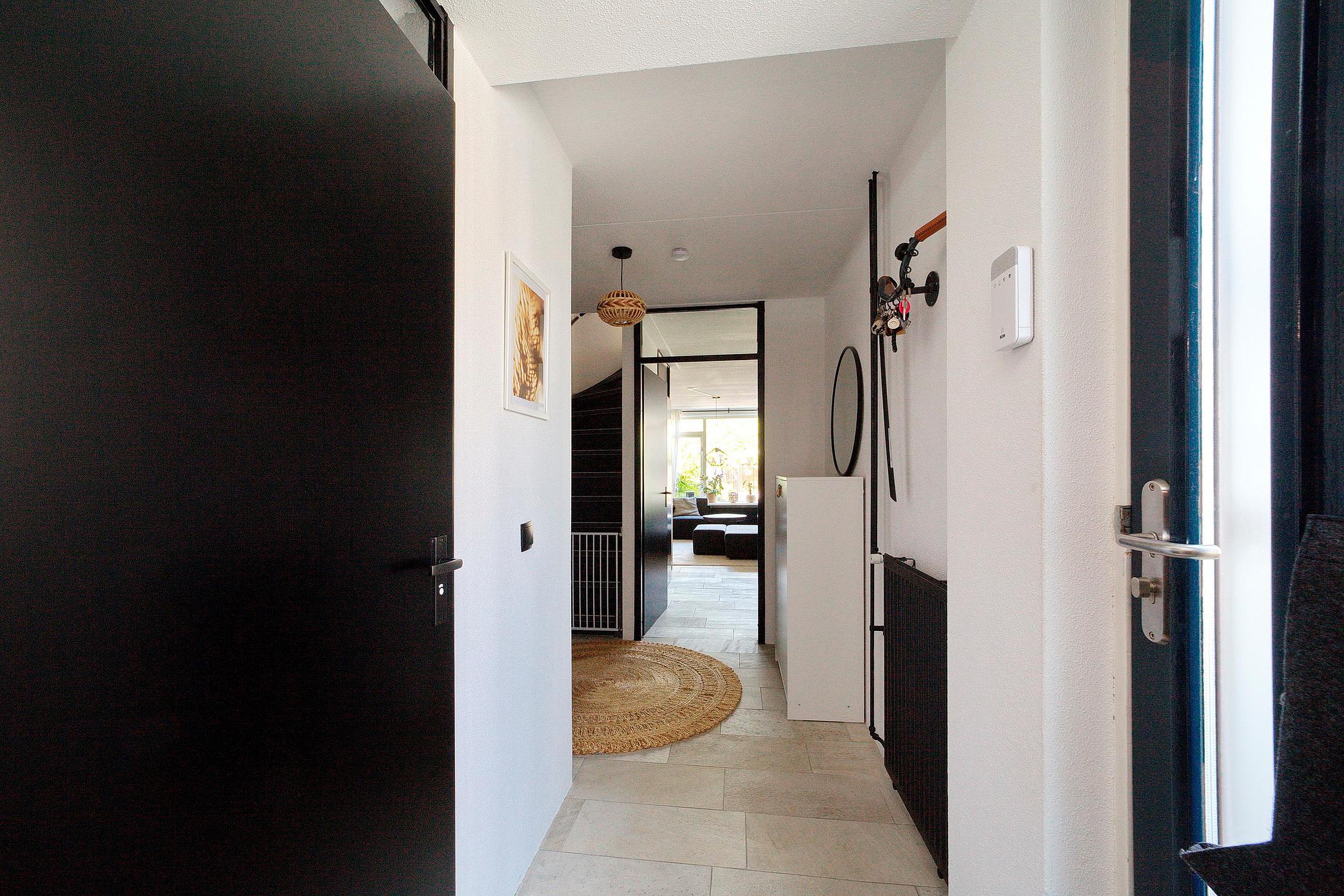 Entreehal met meterkast, volledig betegelde toiletruimte met hangend closet en fonteintje, garderobe en toegang naar de ruime stenen berging aan de voorzijde van de woning, die ook via de voortuin toegankelijk is. De tegelvloer is doorgelegd naar de woonkamer en keuken.