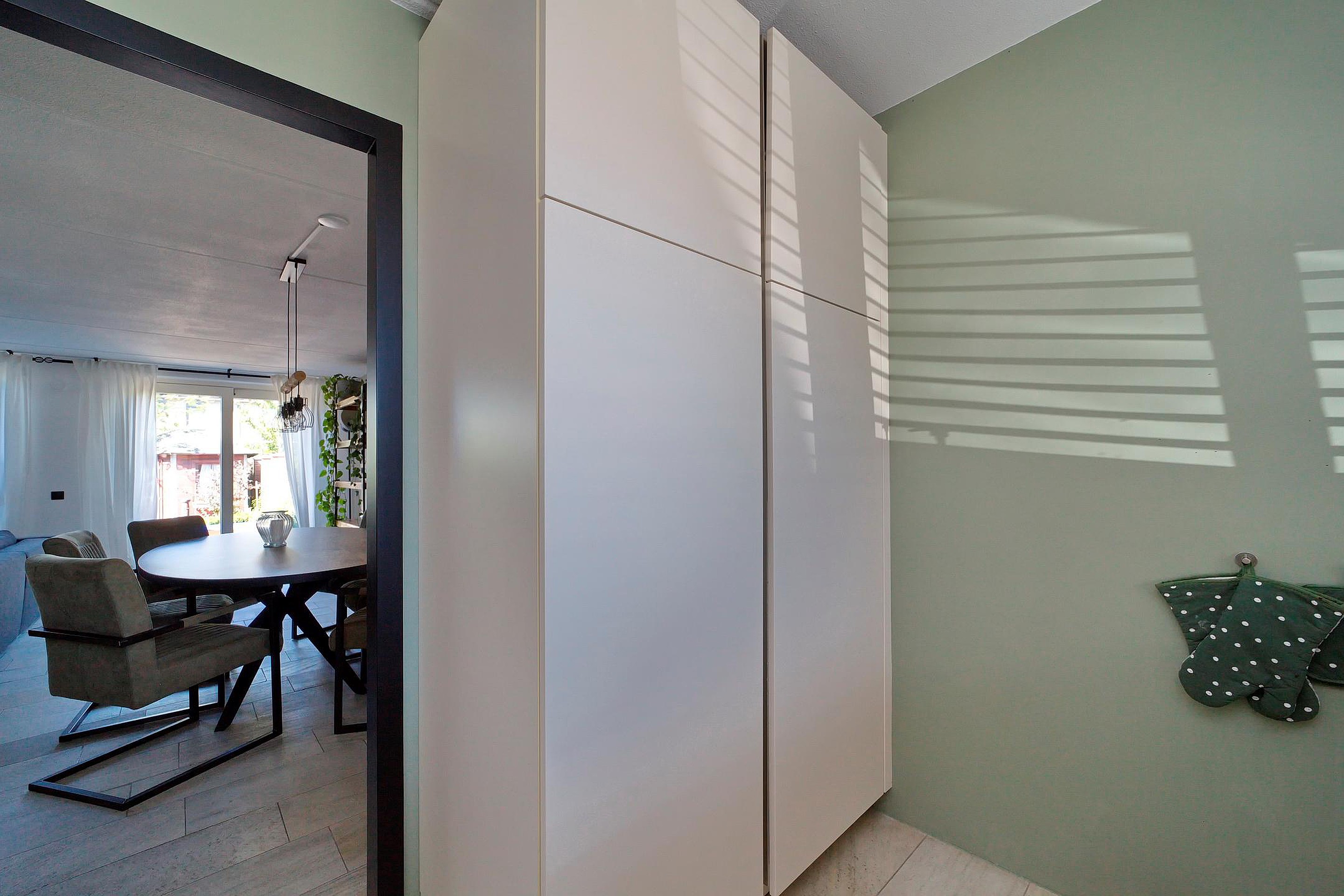 De ruim bemeten lichte woonkamer is voorzien van vloerverwarming. Aan de voorzijde bereik je via een glazen deur de strakke witte keuken met daarin de volgende apparatuur: inductiekookplaat met afzuiging, vaatwasser, grote koelkast en grote vriezer, grill/bakoven.