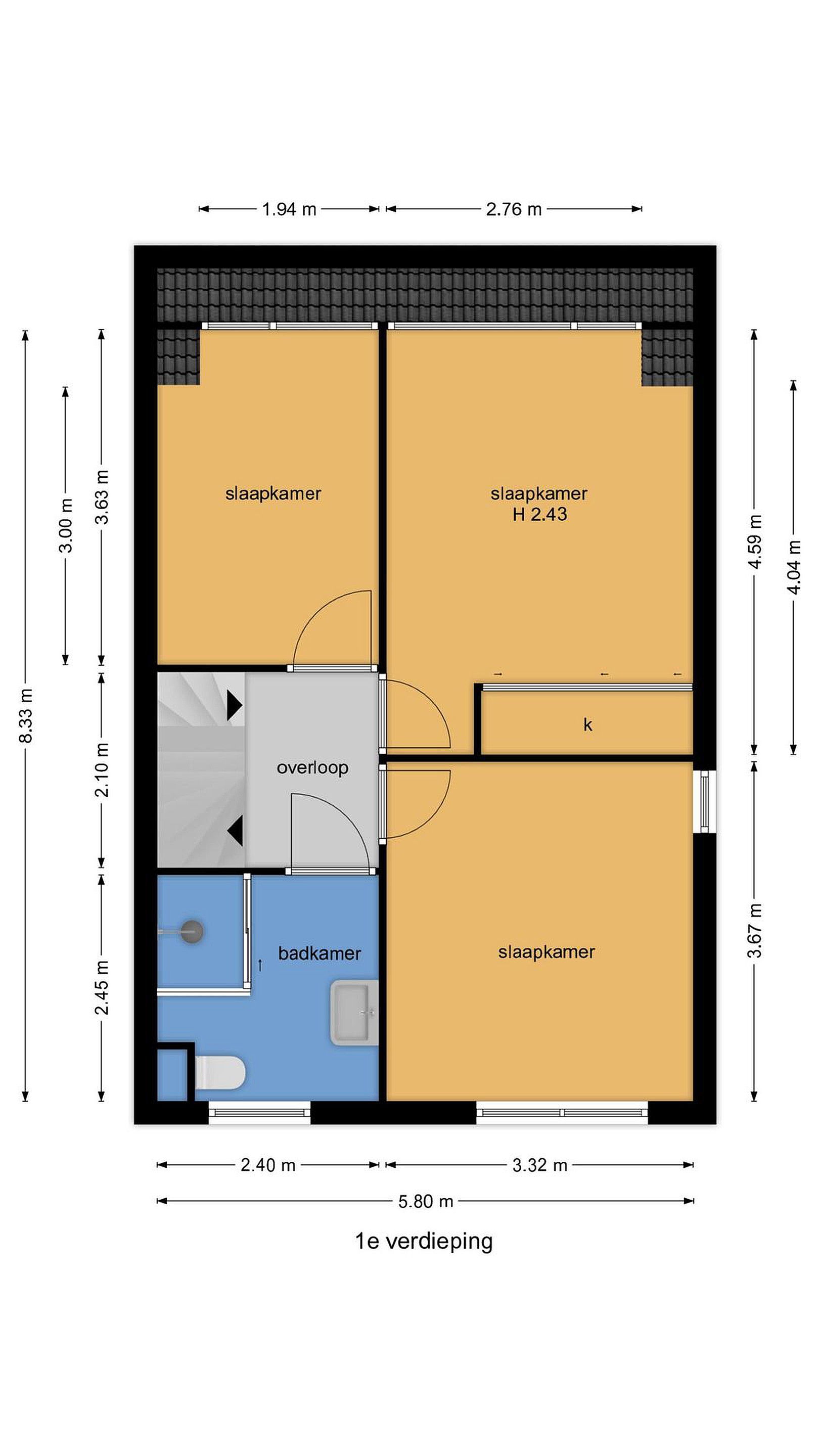 De overloop biedt toegang tot drie ruime slaapkamers en de in 2022 gerenoveerde badkamer.