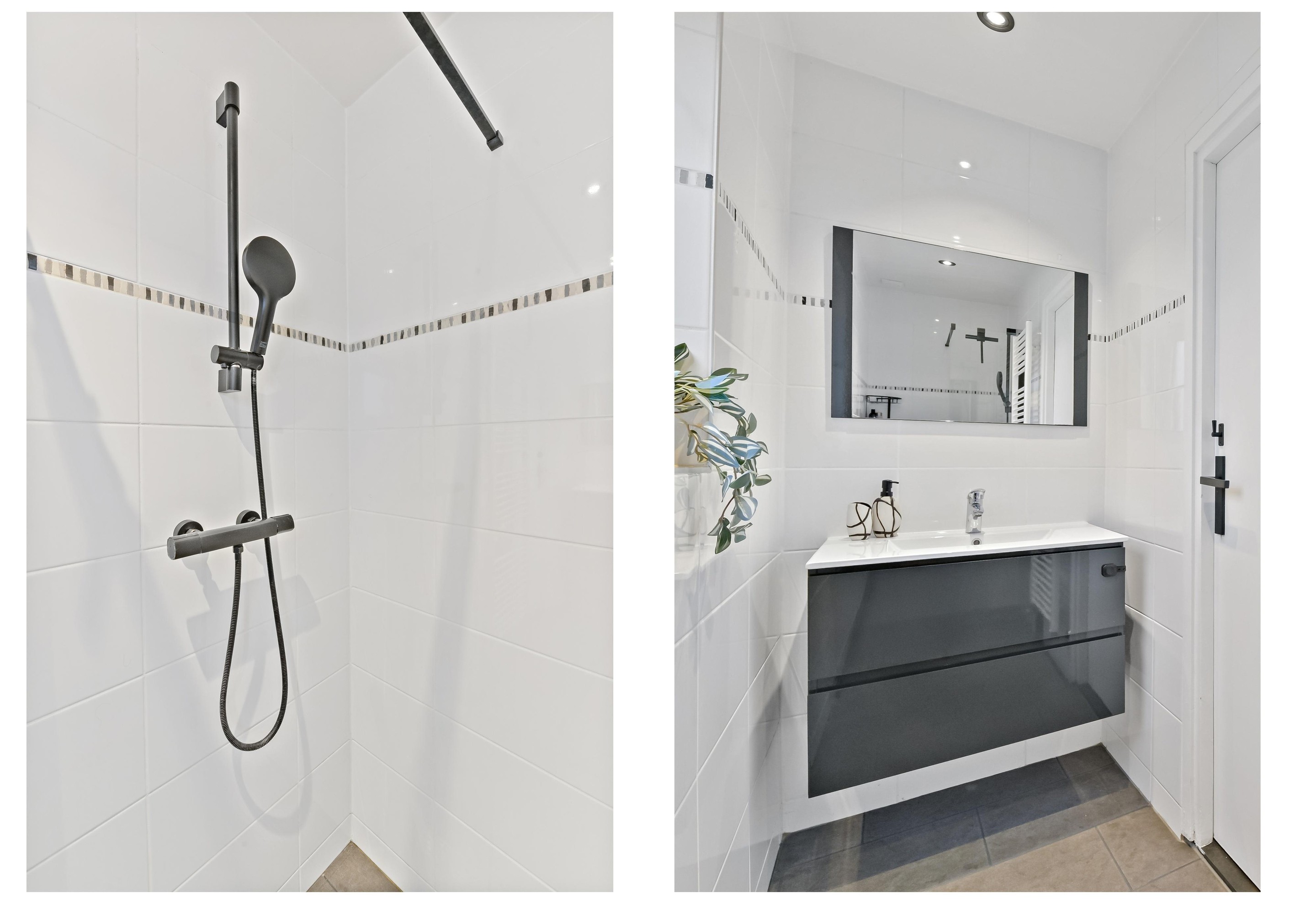 Op de eerste verdieping kom je via de overloop bij drie fijne slaapkamers, allemaal voorzien van nette laminaatvloeren. De master bedroom aan de achterzijde is ruim en beschikt over een rolluik. De tweede slaapkamer ligt ook aan de achterzijde, ideaal te gebruiken als kinderkamer of kantoor aan huis. Ook deze kamer is voorzien van een rolluik. De derde slaapkamer aan de voorzijde is voorzien van elektrisch bedienbaar screen en biedt uitzicht op de fraaie voortuin en de groenstrook langs de Huis te Veldelaan. De moderne badkamer aan de voorzijde is voorzien van een inloopdouche met rainshower, een stijlvol wastafelmeubel en spiegel.