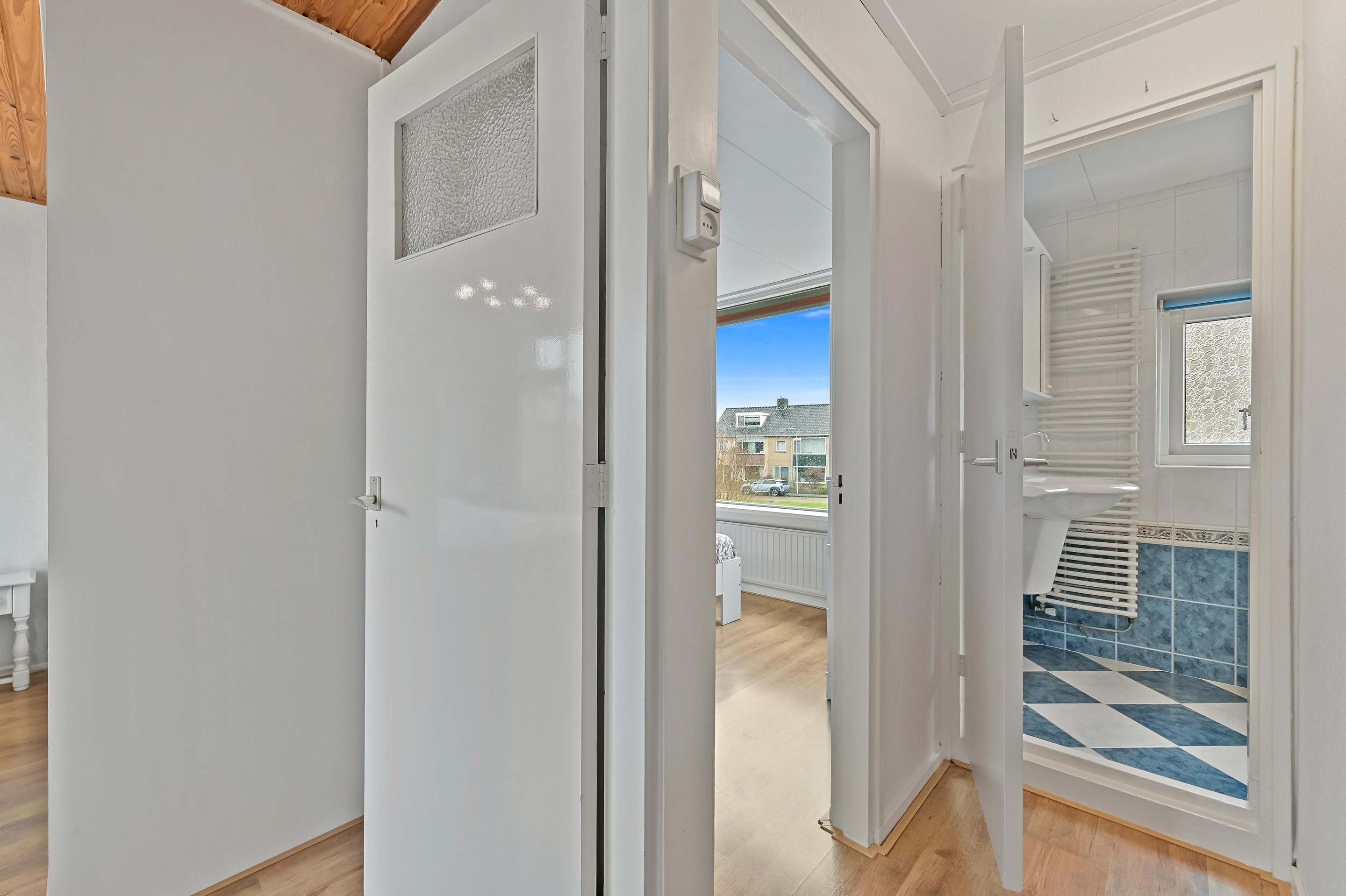 Overloop met toegang tot drie slaapkamers en de badkamer. Aan de achterzijde bevinden zich twee slaapkamers. De grootste kamer is in gebruik als hoofdslaapkamer en beschikt over een vaste kast met schuifdeuren. De kleinere kamer wordt gebruikt als hobbyruimte/werkplek. Aan de voorzijde bevinden zich de derde slaapkamer en de badkamer. De badkamer is compact maar functioneel ingericht. Er is een inloopdouche en een wastafelmeubel aanwezig.