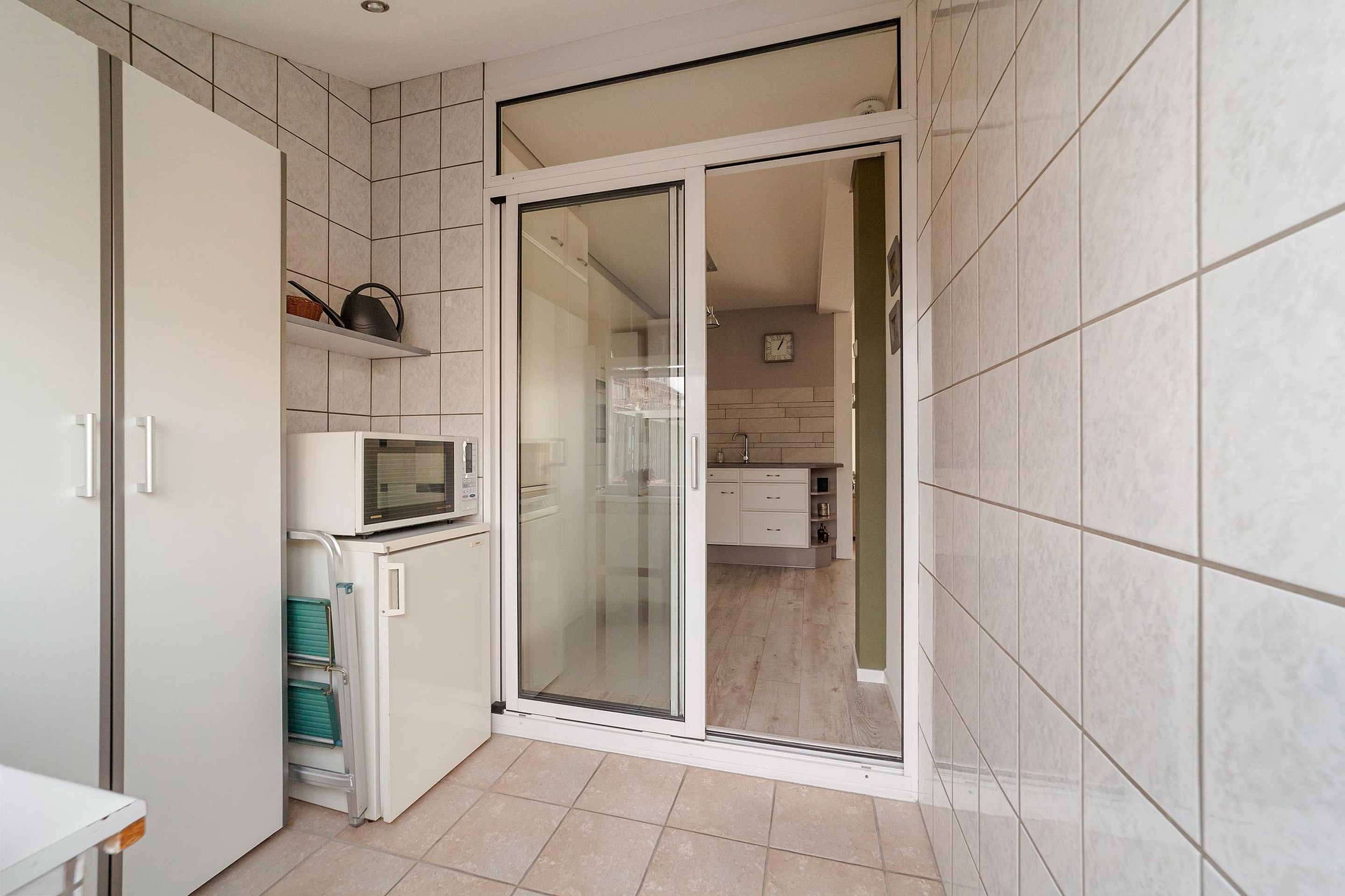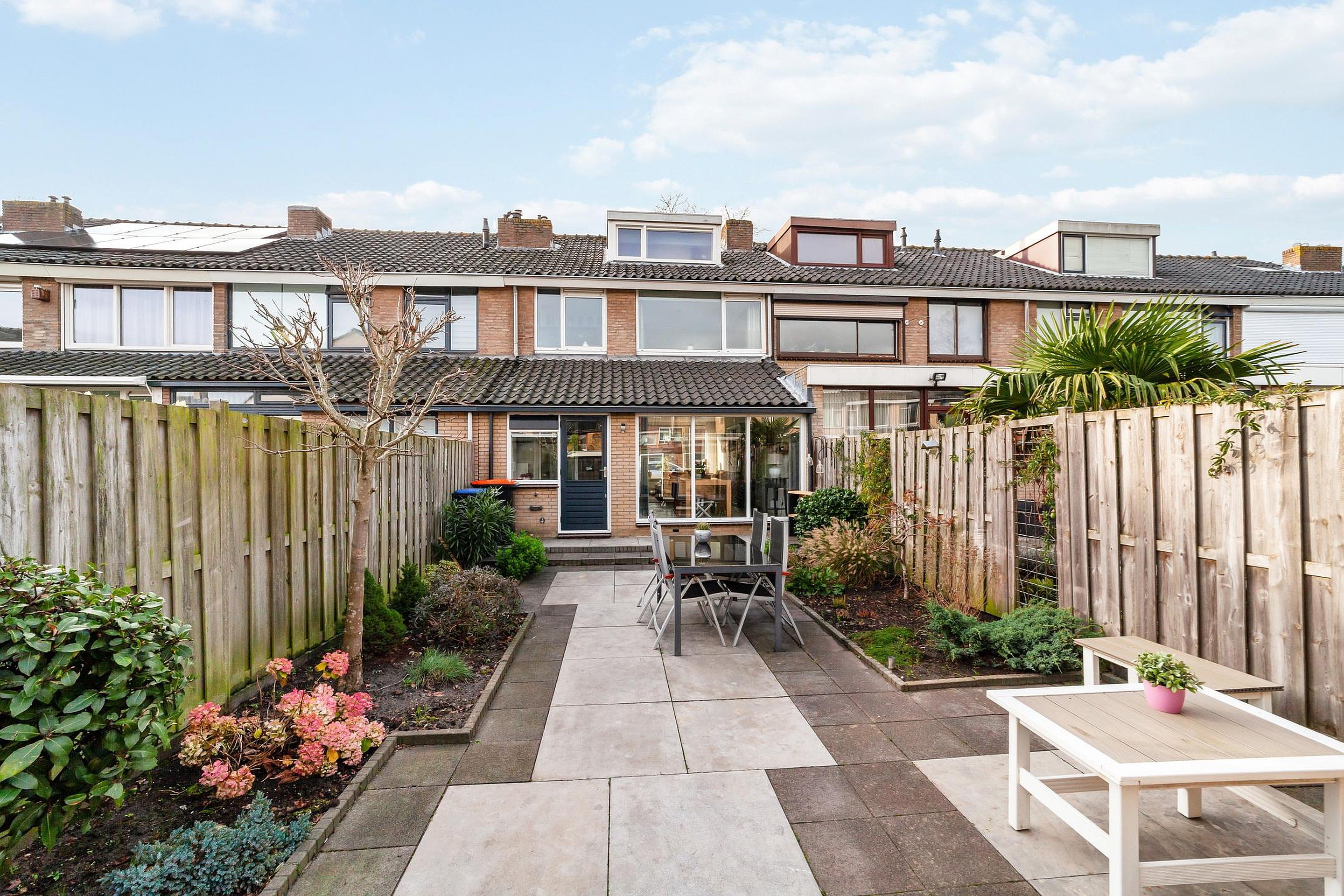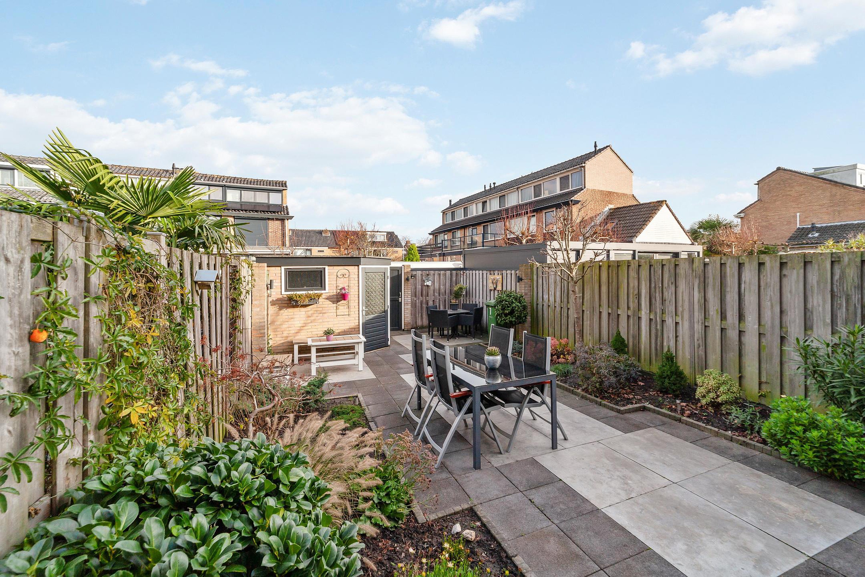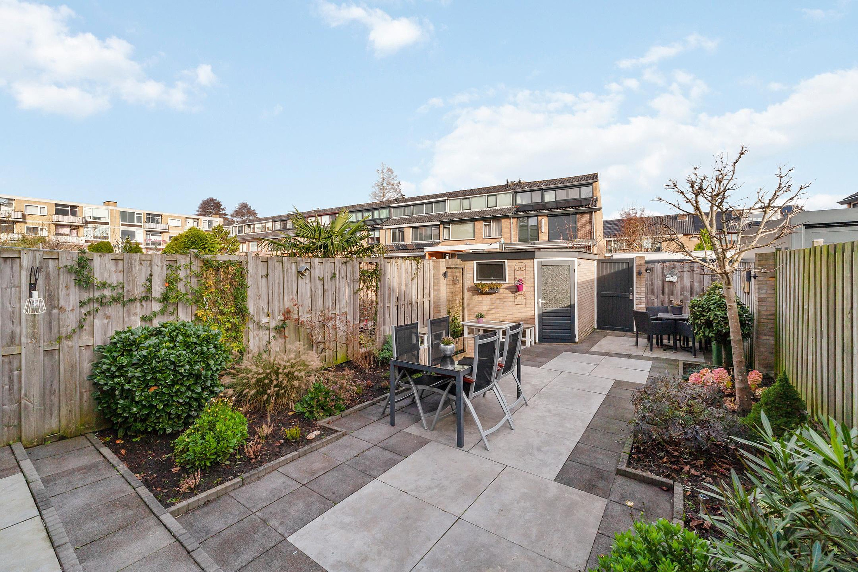 Via de bijkeuken bereik je de ruim 11 meter diepe achtertuin, voorzien van een stenen berging met verlichting. Er is tevens een achteruitgang.