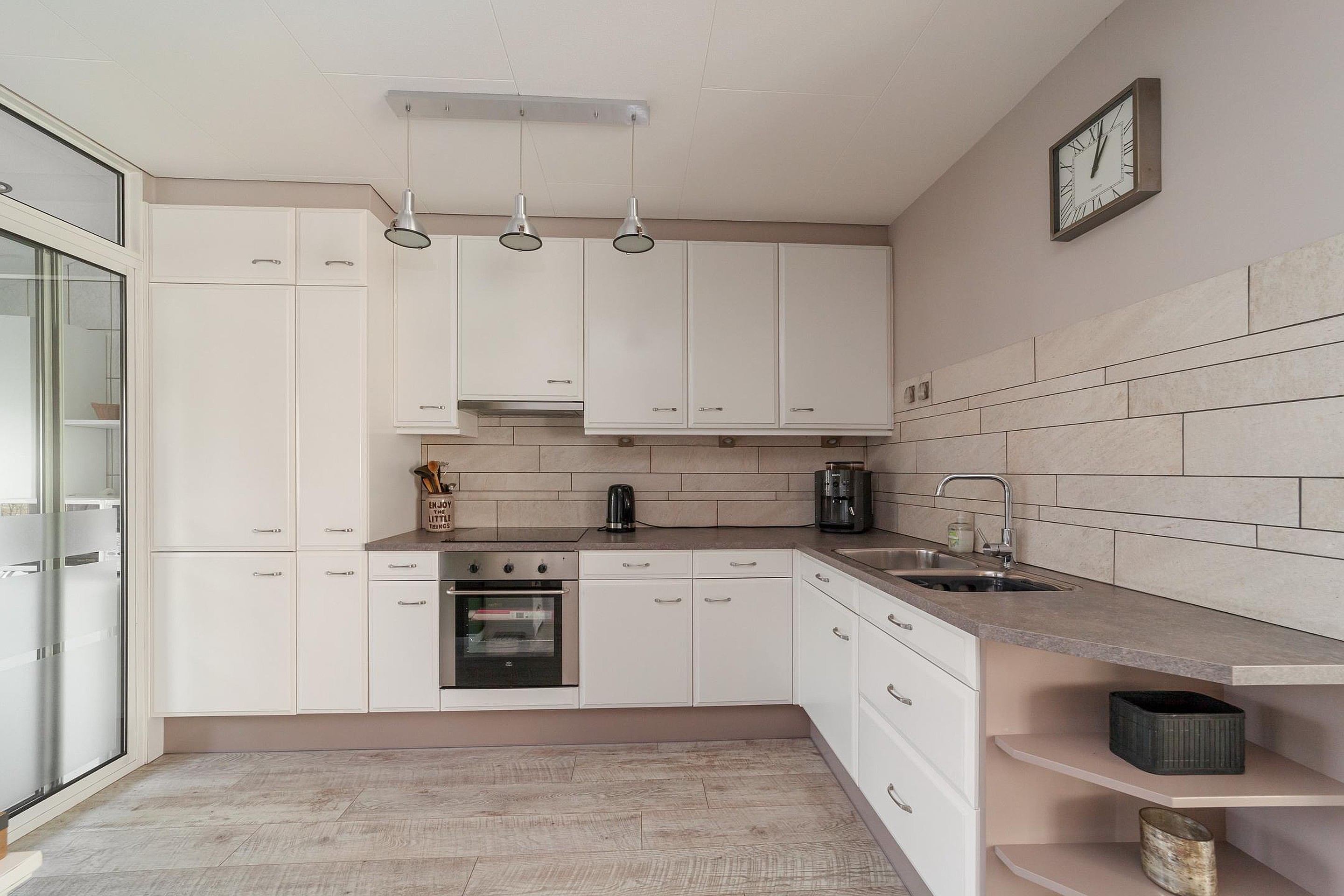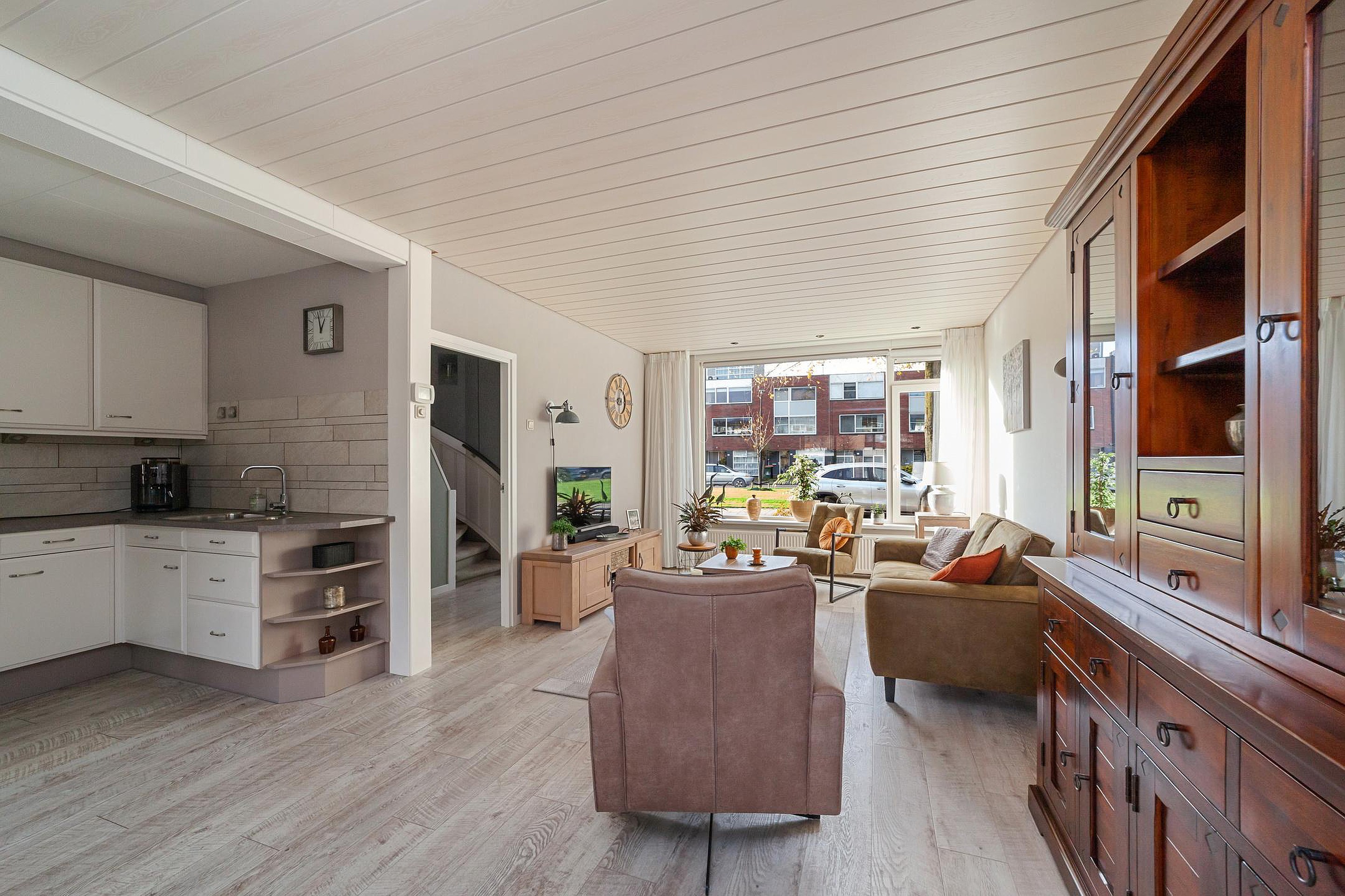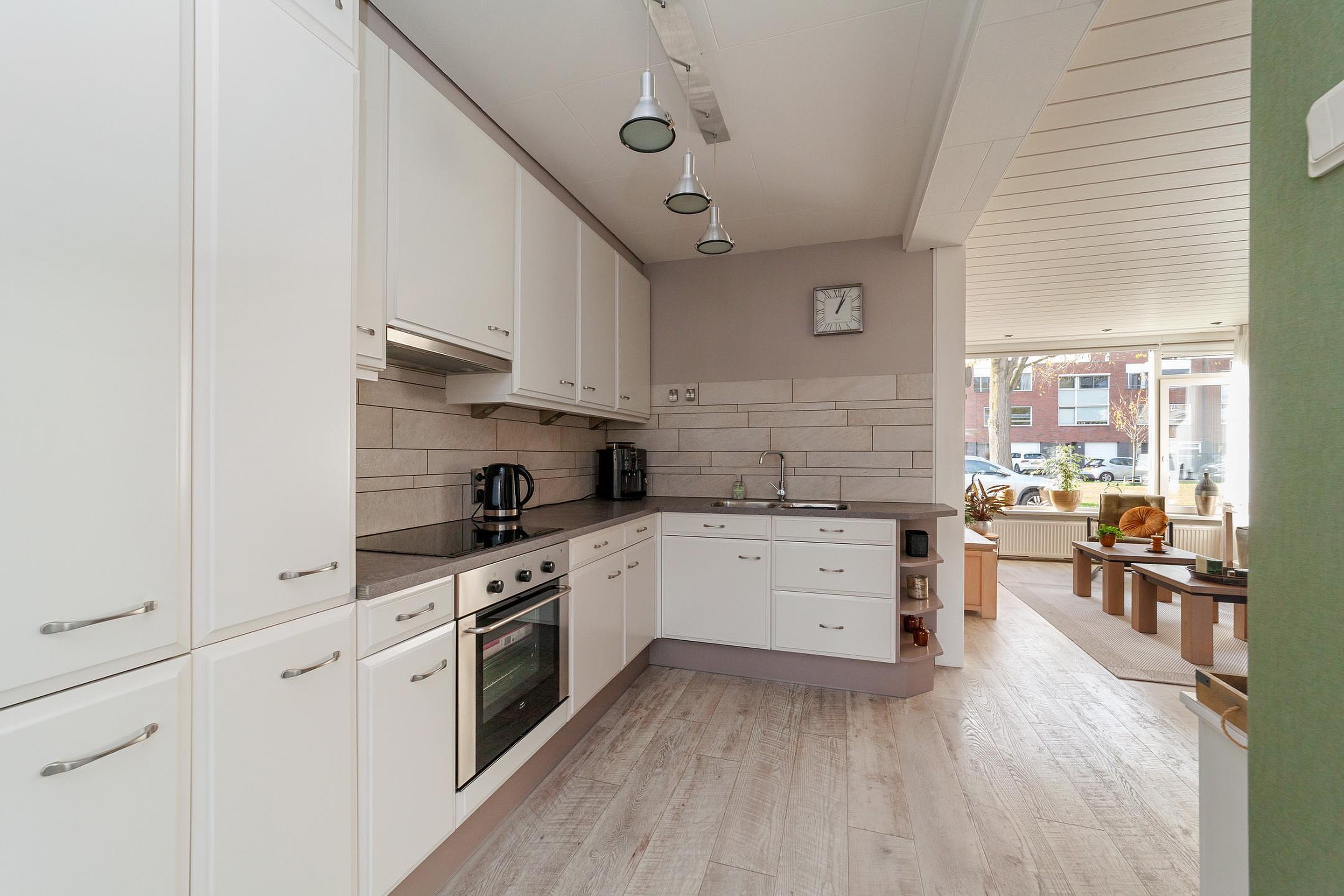 Entree, hal, modern zwevend toilet met fonteintje, trapkast, uitgebouwde woonkamer met PVC-vloer en vloerverwarming, open hoekkeuken met inbouwapparatuur, bijkeuken.