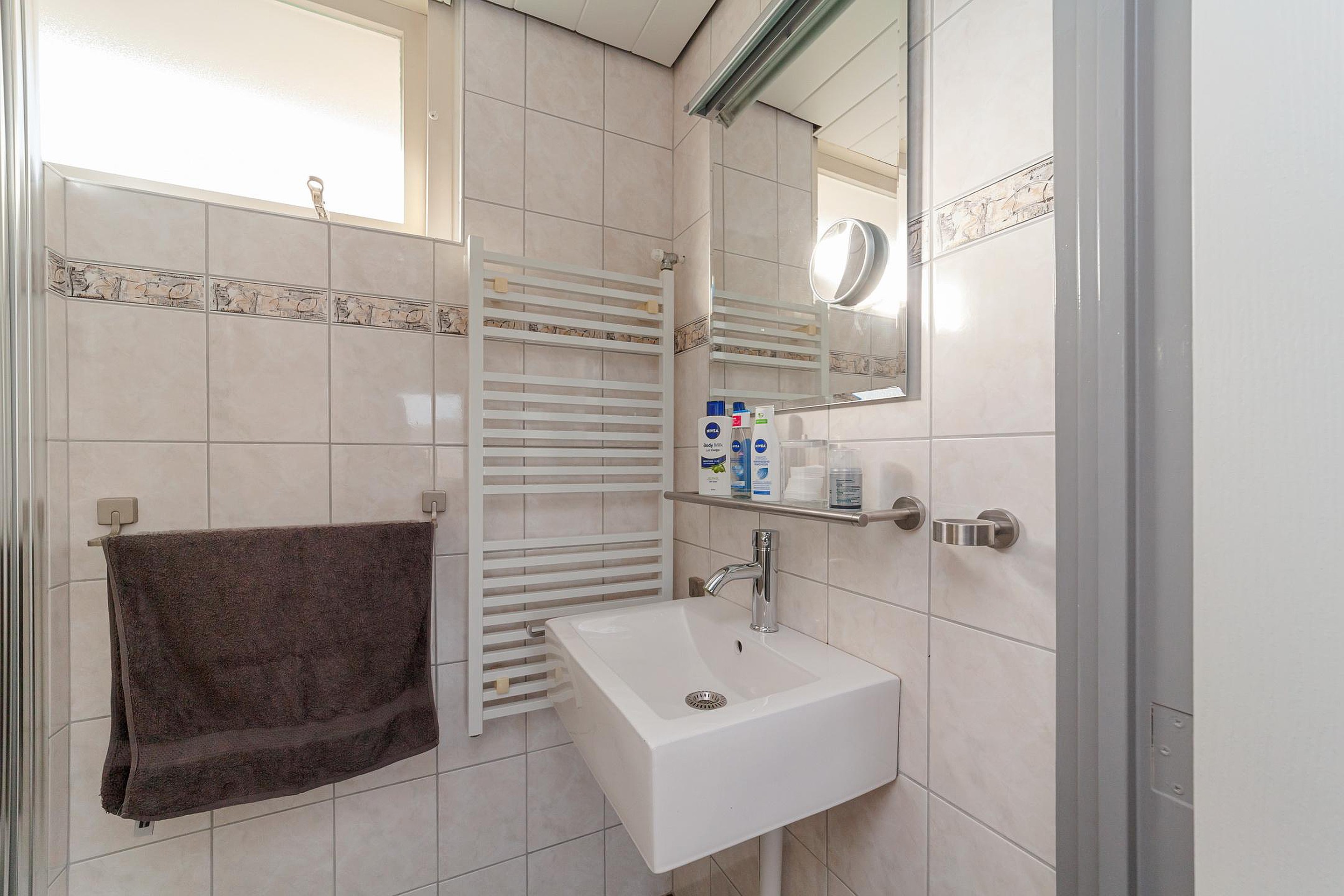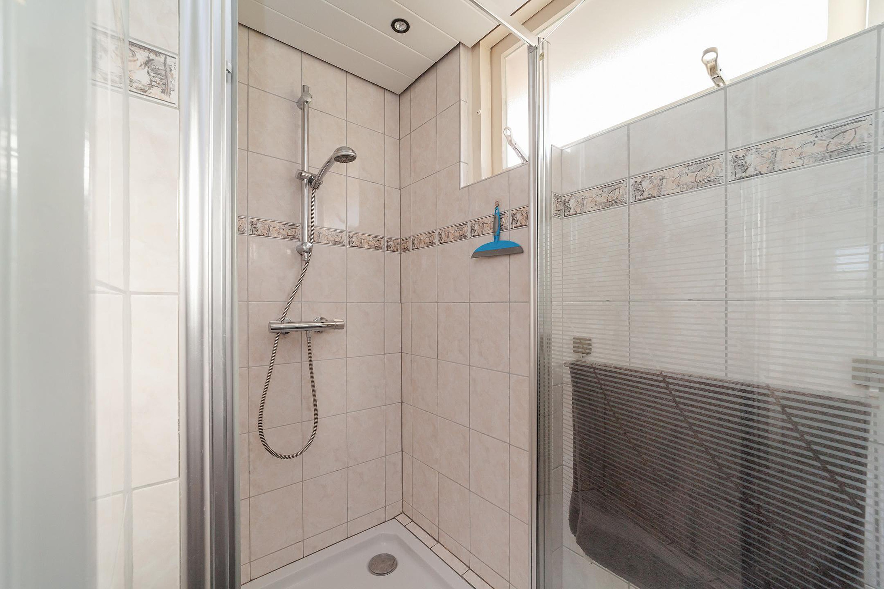 Overloop, 3 slaapkamers, kast met aansluiting wasmachine, geheel betegelde badkamer met douchecabine en wastafelmeubel. De verdieping heeft laminaatvloeren.