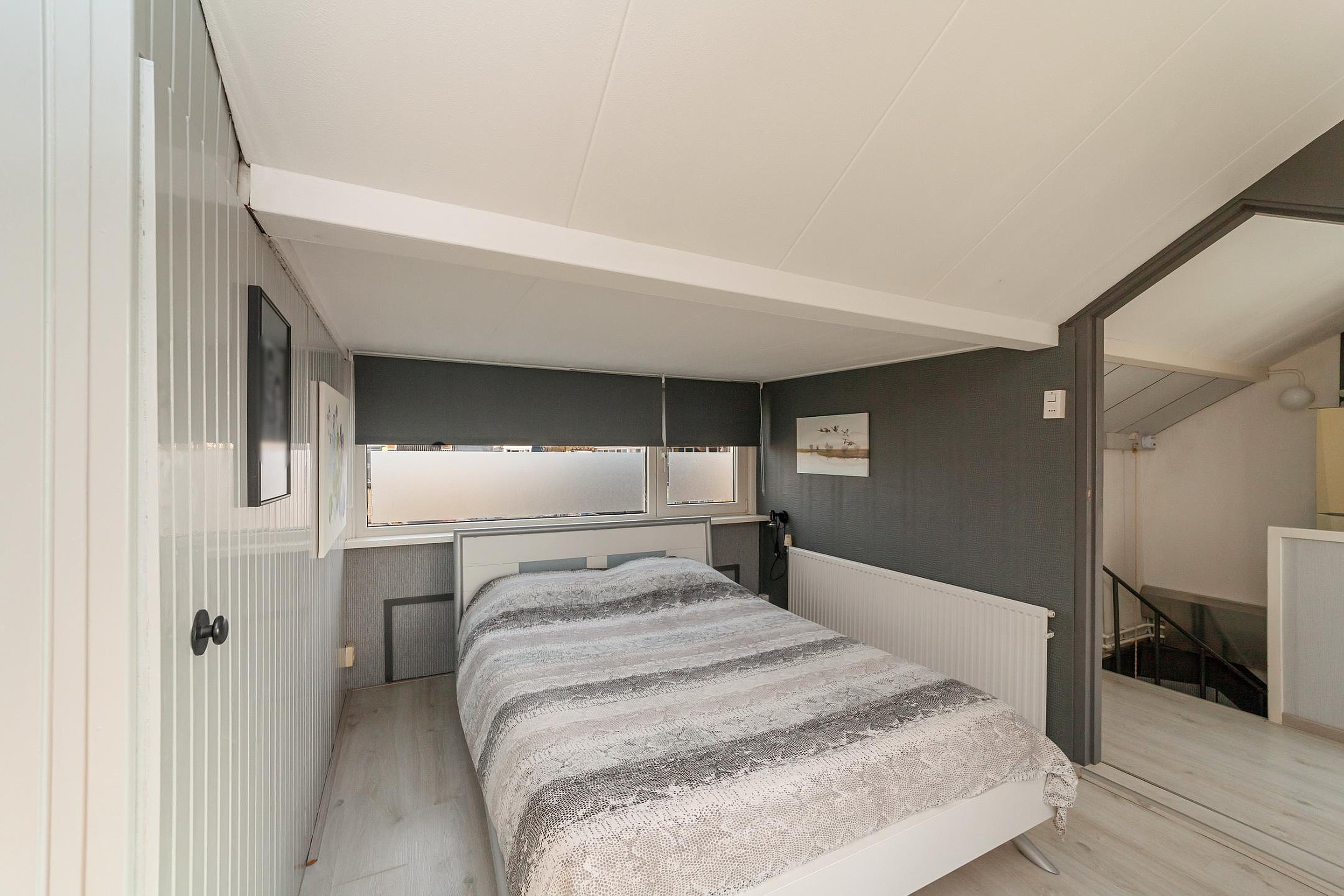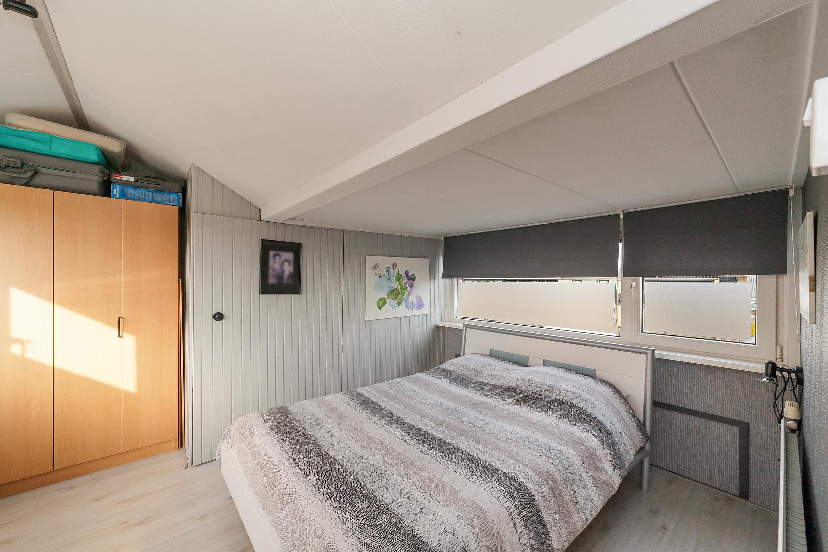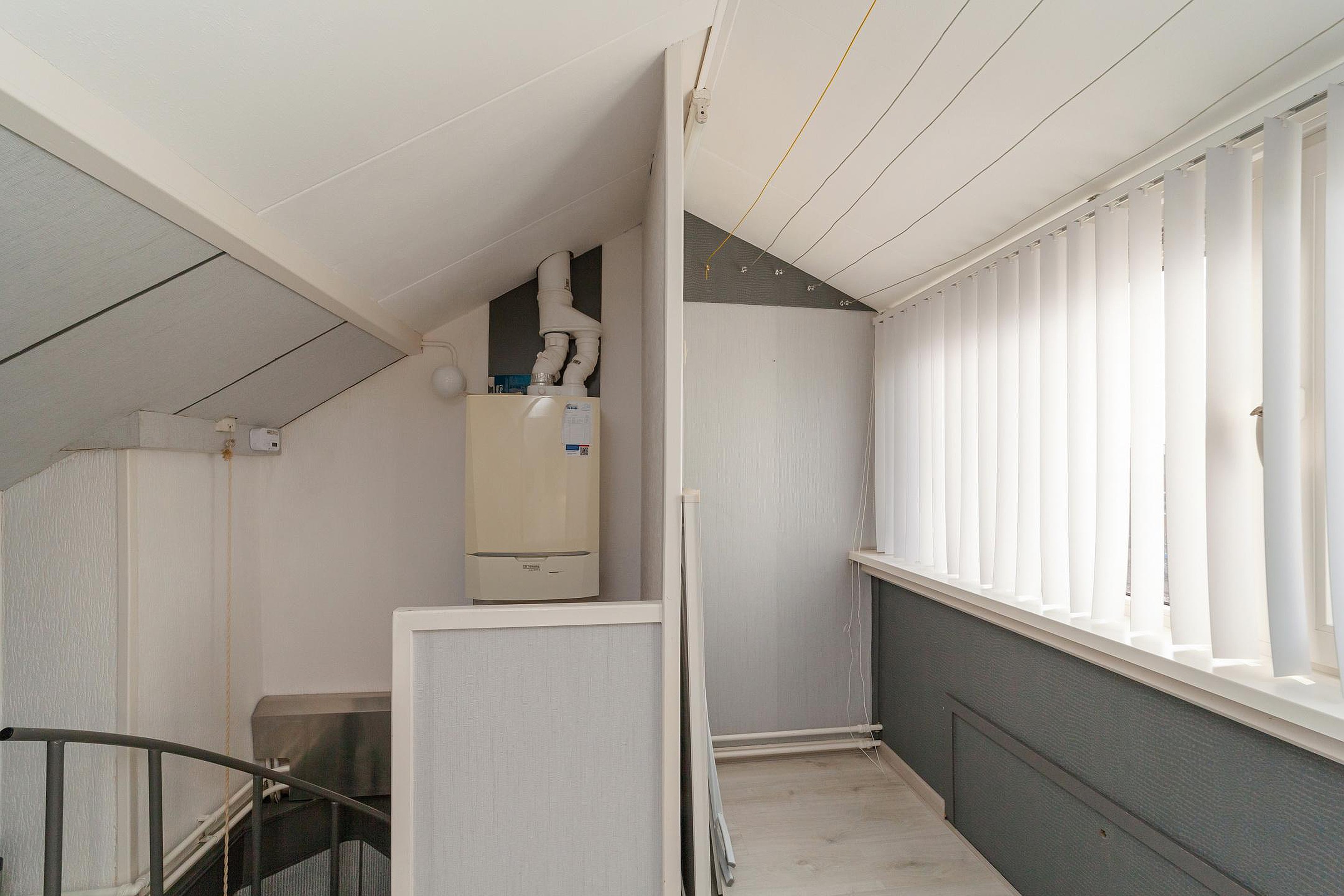 Via spiltrap bereikbare zolderverdieping met een nokverhoging, overloop met opstelling Cv-ketel en bergruimte, slaapkamer met bergruimtes achter de knieschotten.