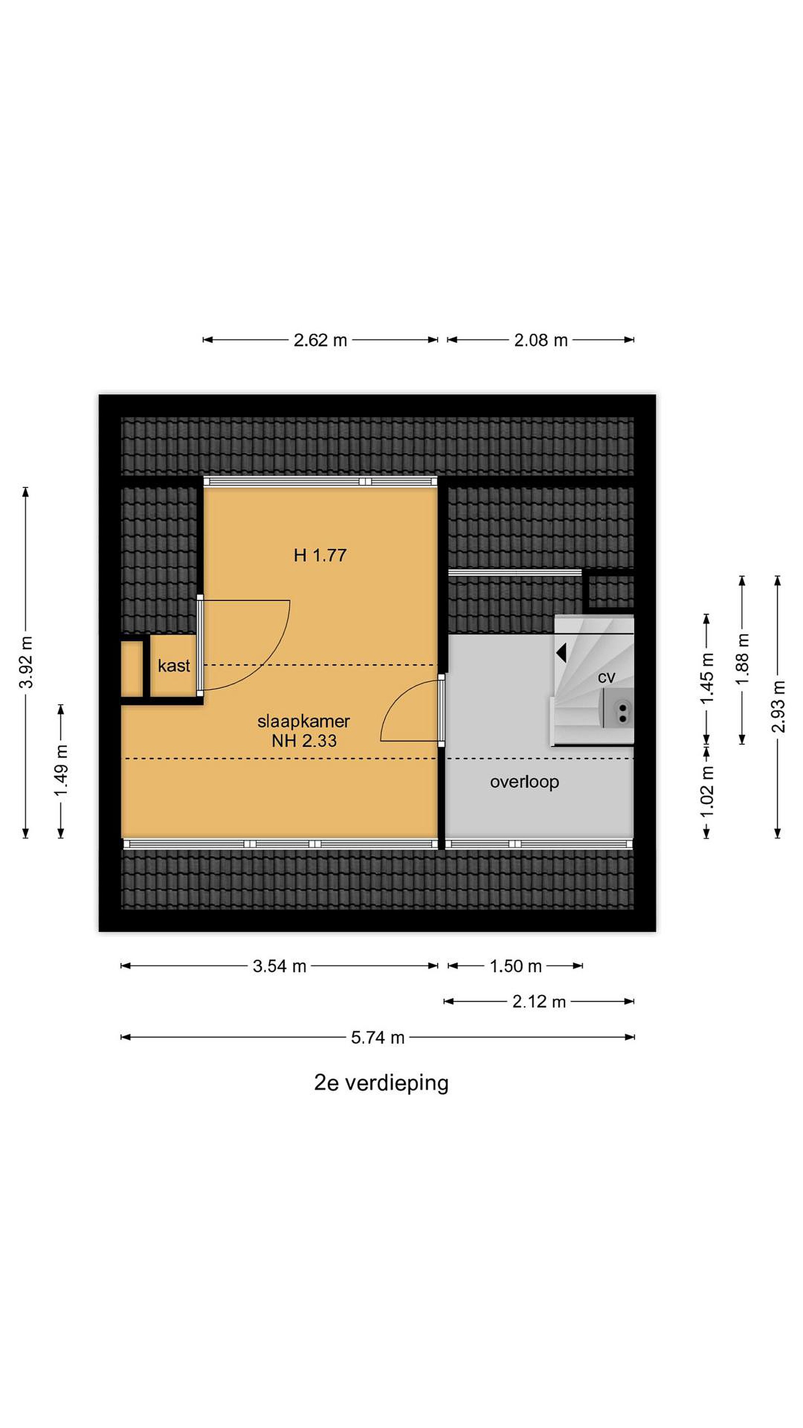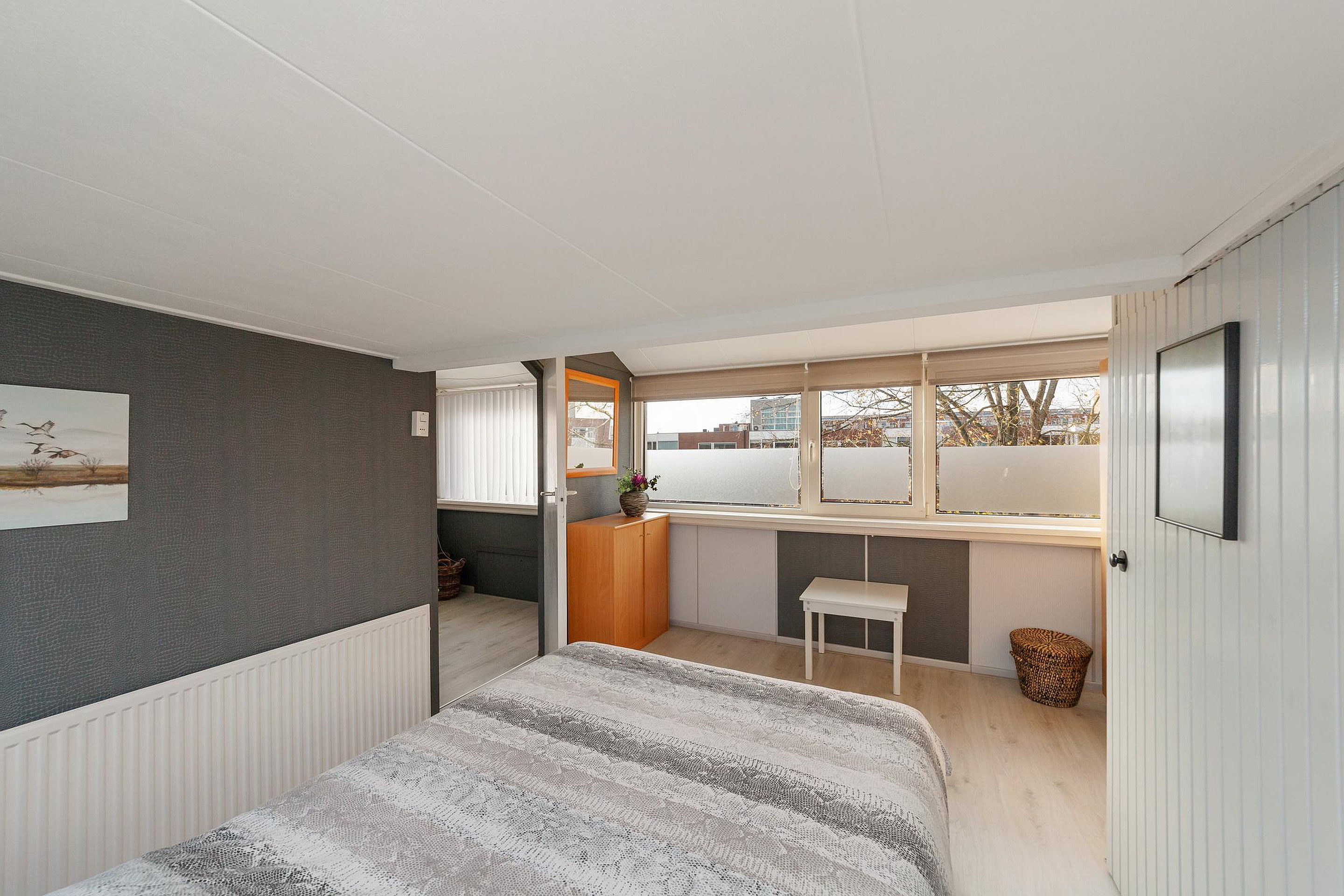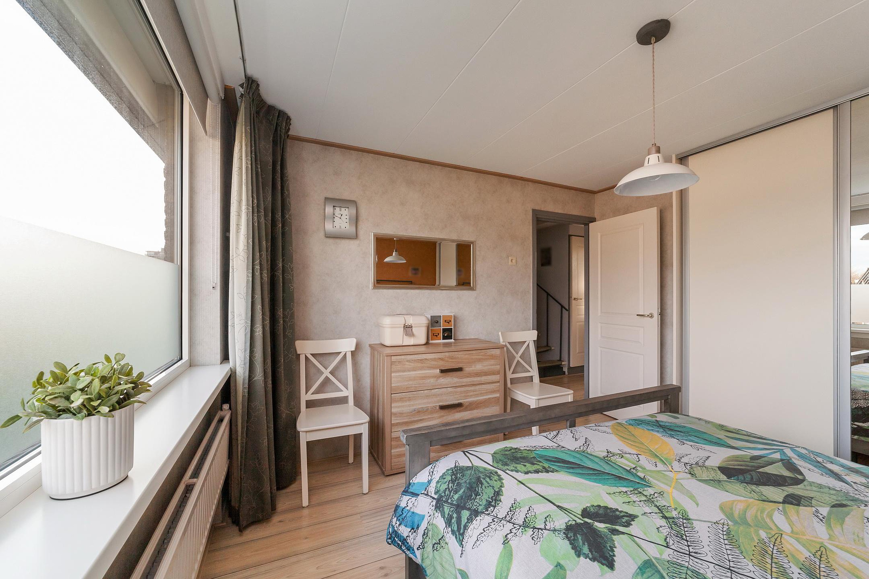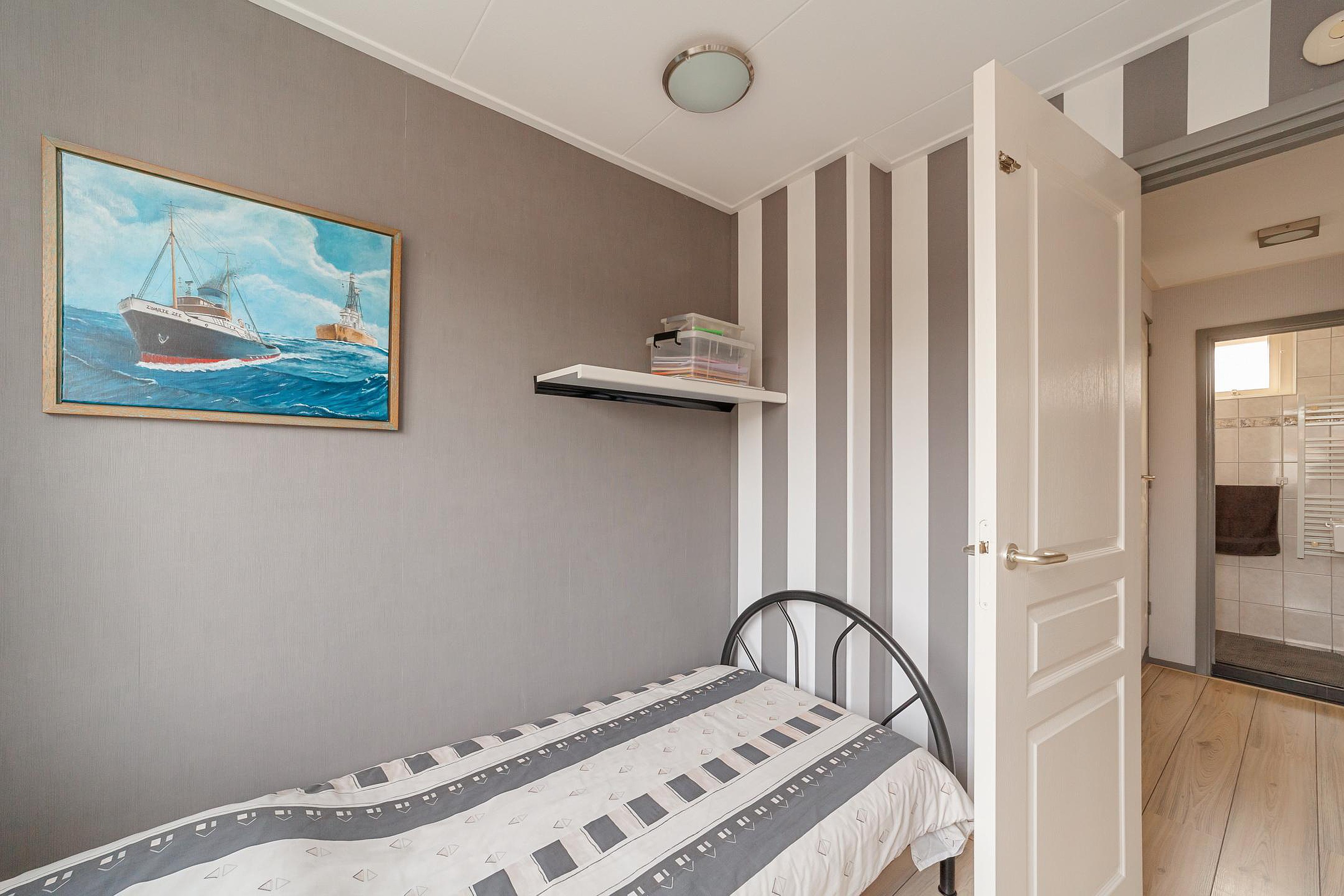 Via spiltrap bereikbare zolderverdieping met een nokverhoging, overloop met opstelling Cv-ketel en bergruimte, slaapkamer met bergruimtes achter de knieschotten.