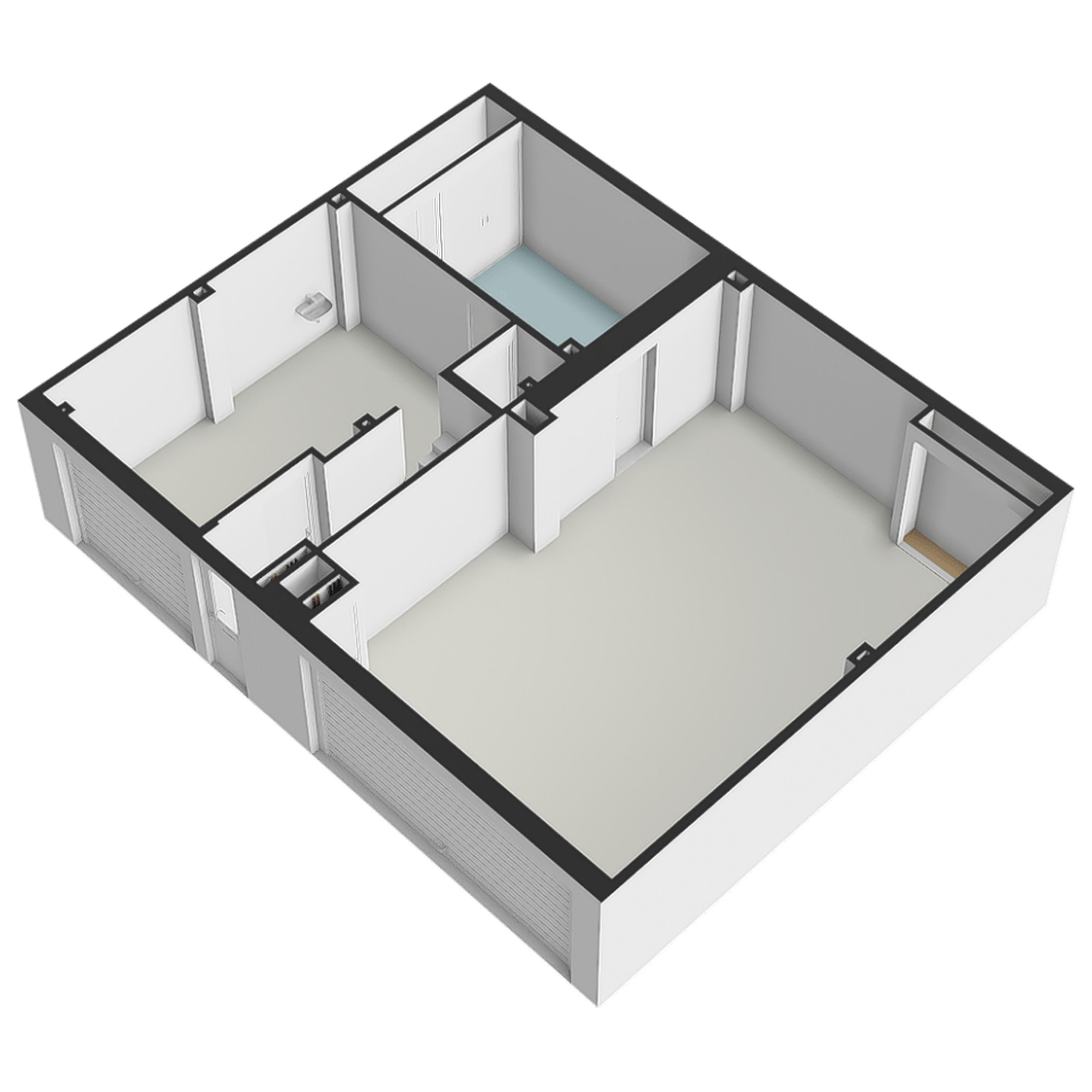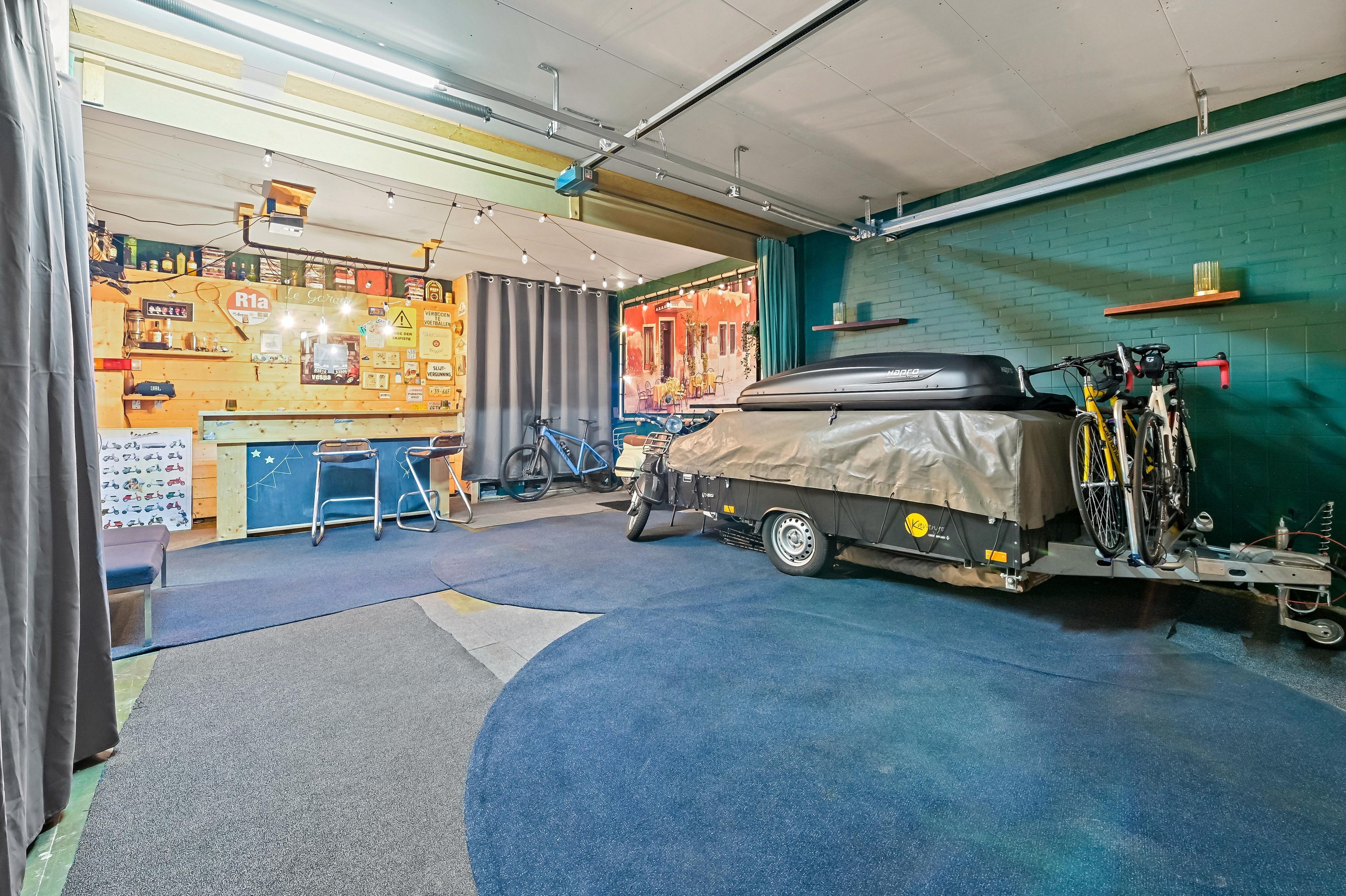 De entreedeur van de woning bevindt zich in het midden van het pand. Zowel aan de linker- als rechterzijde van de loopdeur bevinden zich overheaddeuren welke toegang geven tot de inpandige garages. Via de voordeur komen we in de hal welke toegang tot de eerste verdieping en de garage aan de linkerzijde geeft. De nette garage met verwarming en een stortbak is voorzien van een elektrisch bedienbare overheaddeur. Ook is er een recentelijk geplaatst luxe toilet aanwezig. Onder de trap is nog een praktische opbergruimte. Achter de garage bevindt zich de wasruimte met aansluitingen voor wasmachine en droger en een riante ingebouwde kastenwand. Via de wasruimte is de grote garage aan de rechterzijde te bereiken. Deze multifunctionele ruimt wordt door de huidige bewoners gebruikt als ruimte voor feestjes en met de centrale bar zijn hier vele gezellige verjaardagen gevierd. De ruimte (43 m2) is groot genoeg om ook nog te gebruiken als opslag. Ideaal voor bijvoorbeeld motoren, een auto, of een andere hobby waar ruimte voor nodig is. Ook voor een caravan is de ruimte goed geschikt, vanwege de plafondhoogte van 2,90. Aan de straatzijde bevindt zich de brede garagedeur, waardoor u gemakkelijk naar binnen kunt rijden.