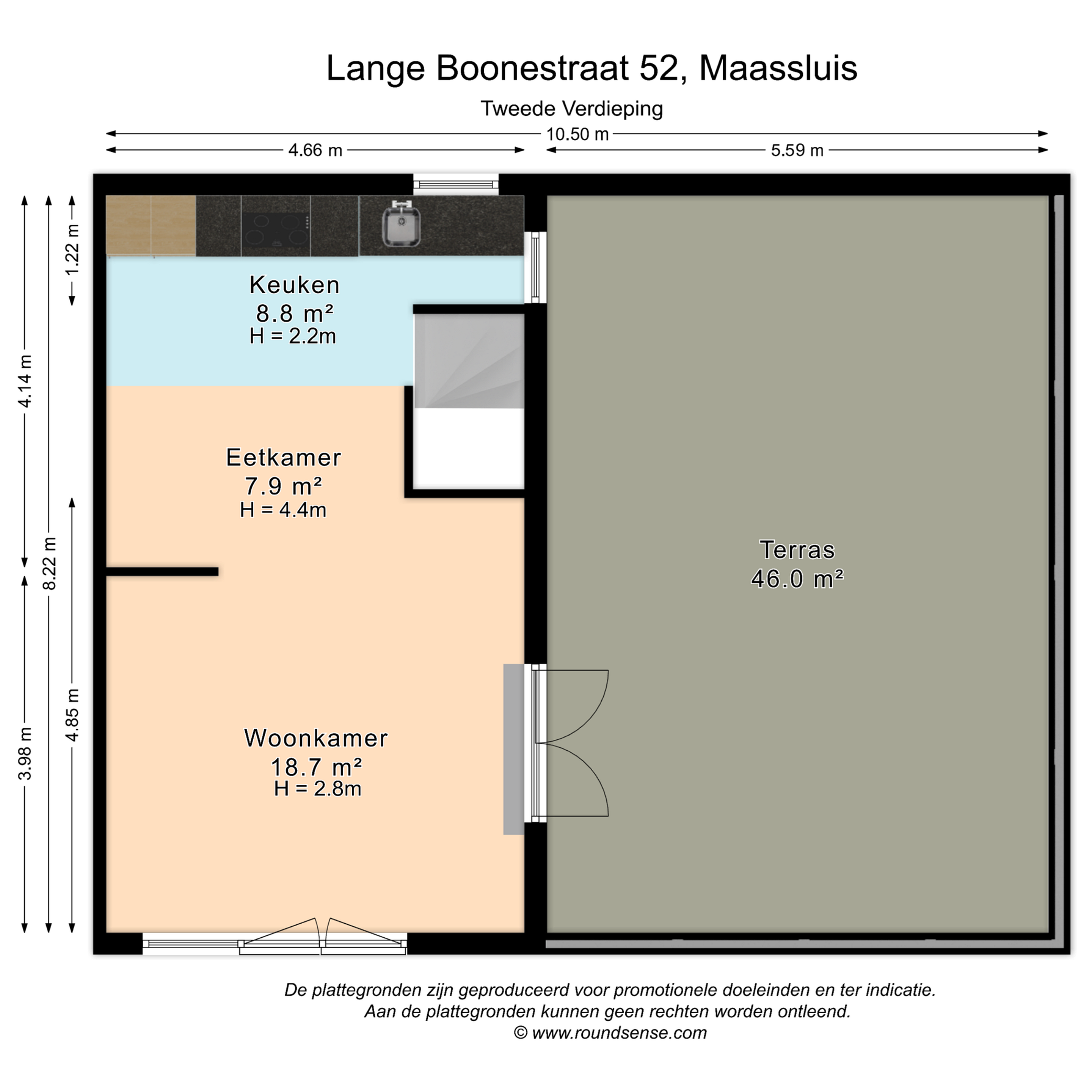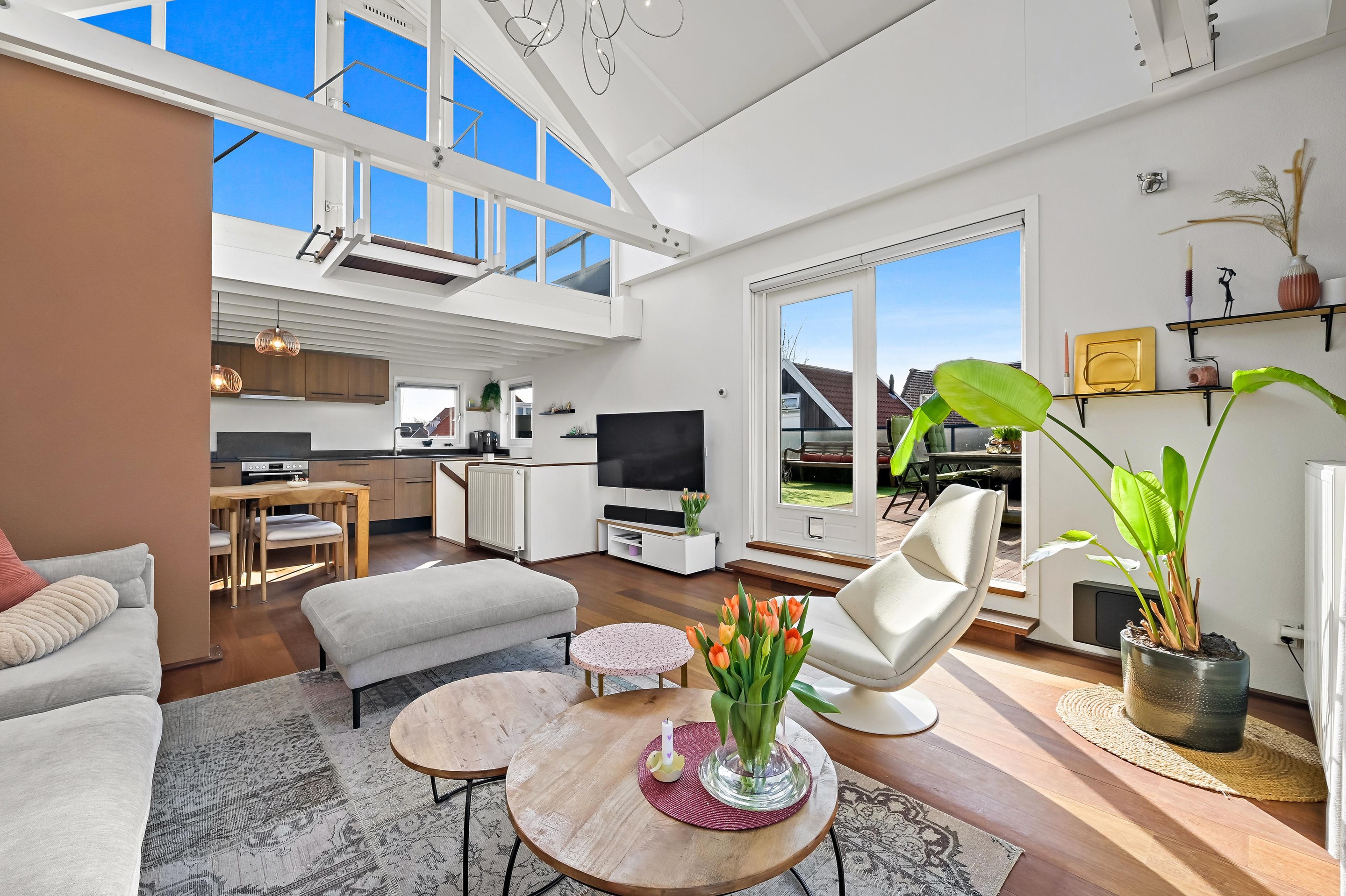 De bovenste verdieping is de woonverdieping. Op deze loftachtige verdieping is het altijd licht. De woonverdieping is namelijk aan de voor- en achterzijde voorzien van zeer grote raampartijen welke doorlopen tot in de 4,4 meter hoge nok. De keuken is recentelijk vernieuwd en beschikt over diverse nieuwe A-kwaliteit inbouwapparatuur. Vanuit de woonkamer heeft u een fraai uitzicht over de woonwijk. Aan de voorzijde zijn dubbele deuren voor het frans balkon aanwezig. Via de dubbele deuren aan de zijkant van de woonkamer is het gigantische dakterras van 46 m2 te bereiken. Vanaf dit dakterras, waar uw privacy is gegarandeerd, heeft u een zeer weids en levendig uitzicht over het oude centrum van Maassluis. Langs de Wijde Koestraat kijkt u naar het vaarwater langs de Noordvliet. Hier is altijd wel een plekje in de zon of in de schaduw te vinden. Vanuit de woonkeuken is het tweede terras bereikbaar. Dit is bereikbaar middels een losse trap. Het hoogste punt van het huis is één van de hoogtepunten. Hier zit je midden in het centrum met zicht over de regio. Vanaf dit terras ervaar je een ultiem gevoel van vrijheid!