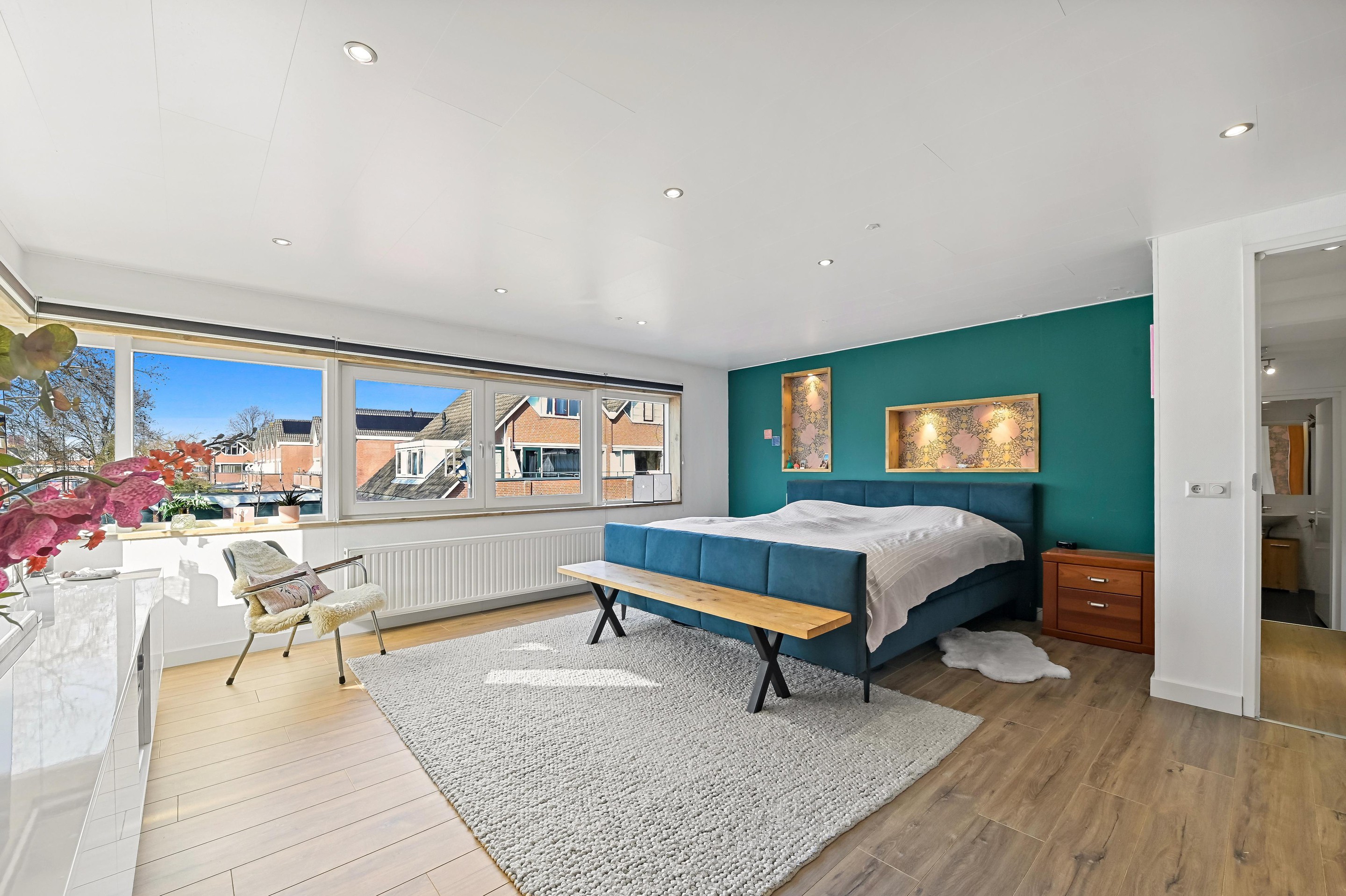 Via de hoofdentree is de eerste verdieping bereikbaar. Op deze verdieping zijn vier ruime slaapkamers aanwezig. Centraal in de woning bevindt zich de nette ruime badkamer. Vanaf de overloop met toiletruimte bereiken we de eerste slaapkamer aan de voorzijde. Aan de achterzijde van dit gedeelte van de woning is een tweede slaapkamer te bereiken. Deze slaapkamer wordt door de huidige bewoners gebruikt als werkkamer. De badkamer is netjes betegeld en beschikt over een ligbad, wastafelmeubel en een inloopdouche. Aan de andere zijde van het pand bevinden zich nog twee slaapkamers. De hoofdslaapkamer aan de voorzijde met raampartijen aan twee zijden is indrukwekkend groot én sfeervol ingericht . Aan de achterzijde van de woning is de vierde slaapkamer aanwezig.