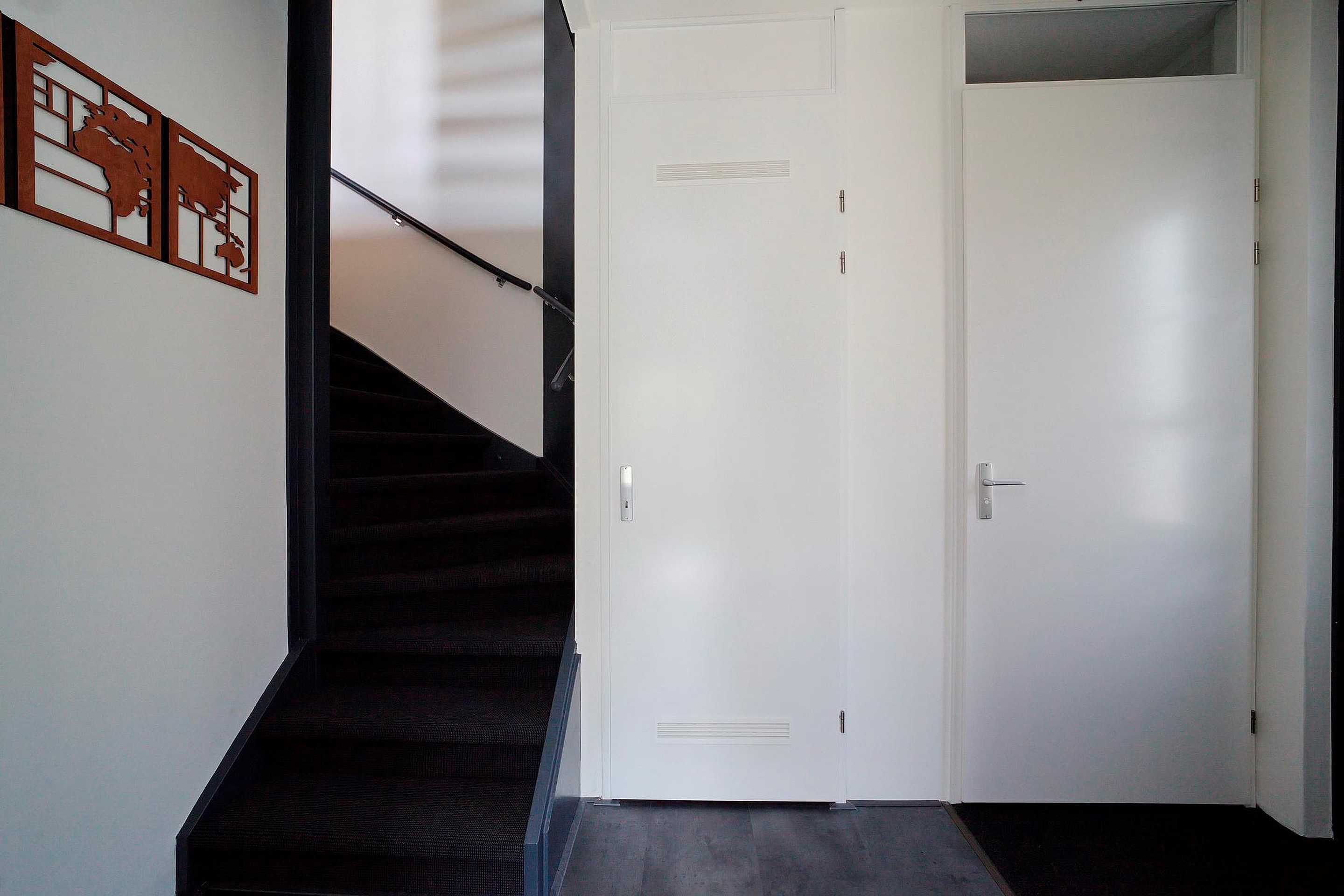 Het trappengat is geïsoleerd met kurk en afgewerkt met Renovlies behang. Hierna zijn de muren en het plafond strak en egaal gespoten.