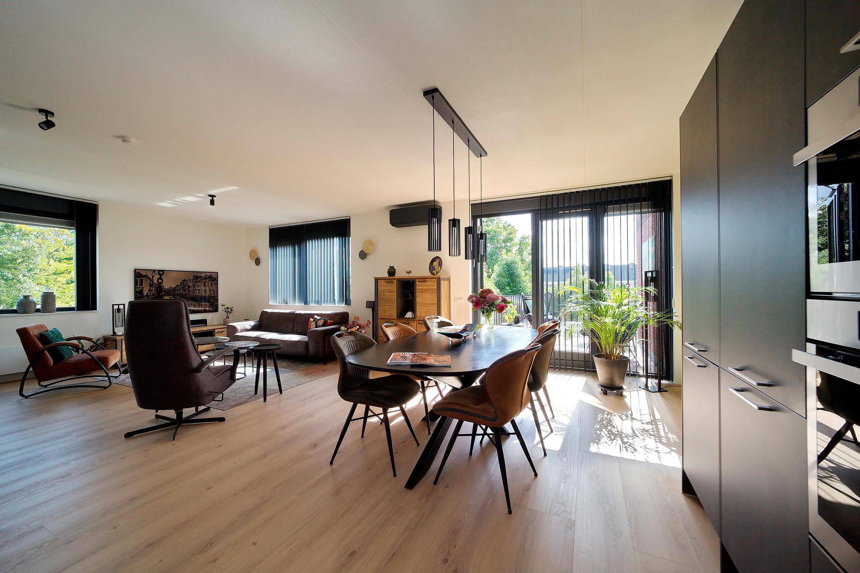 In de zeer ruime woonkamer ligt een kwalitatief “click” laminaat. Via twee openslaande deuren kom je op het ruime terras. Hier hangt een elektrisch zonnescherm welke voor verkoeling zorgt. Daarnaast zorgt een airco voor extra verkoeling maar deze kan ook bij kou voor verwarming zorgen.