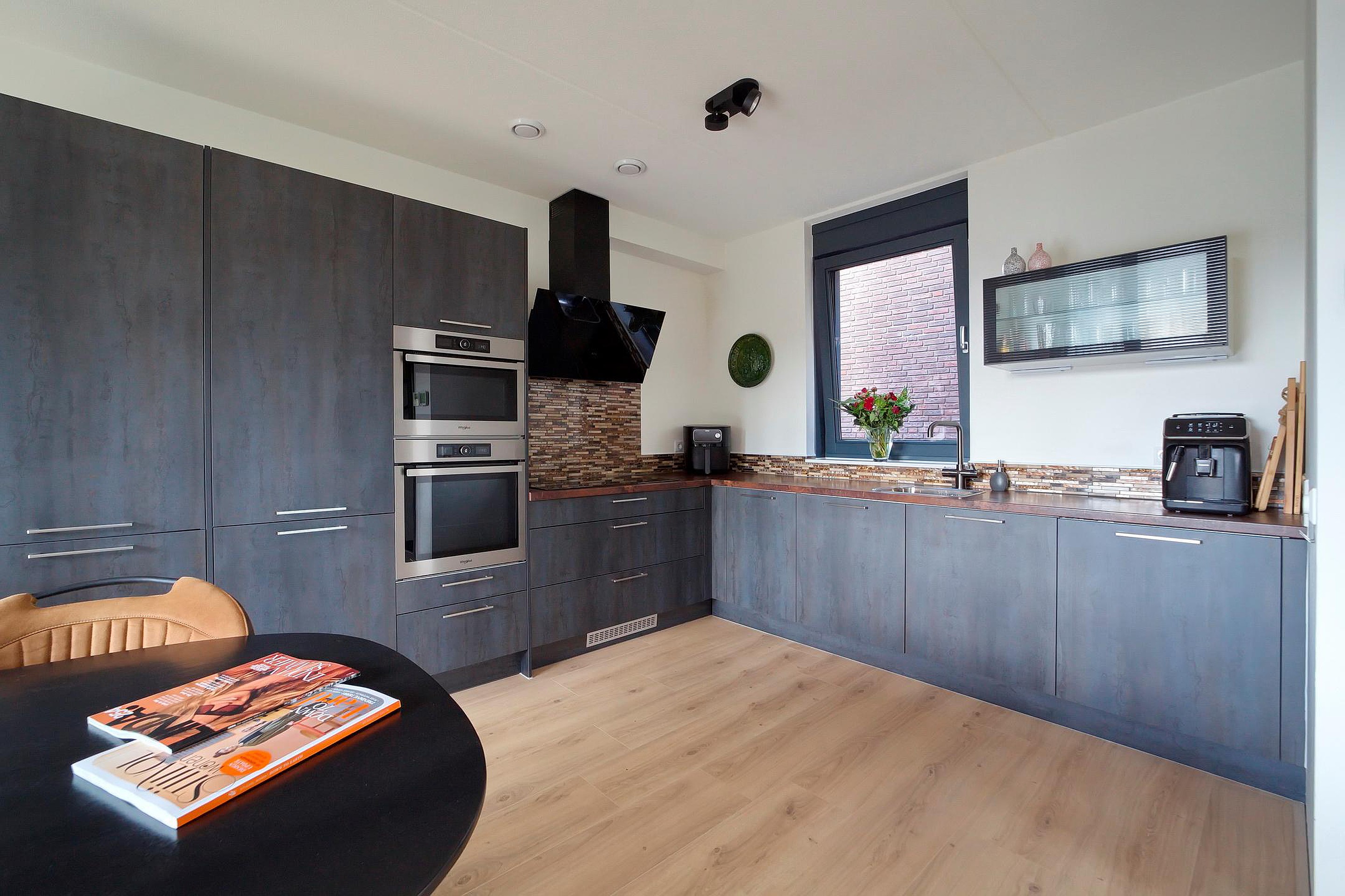 De ruime luxe open keuken is voorzien van de volgende inbouwapparatuur: vaatwasser, koel/vriescombinatie, 3-fasen inductiekookplaat, afzuigkap, oven, combi-oven met crisp functie en een modern kunststof blad. Tevens is er een kokend waterkraan van het merk Howat.