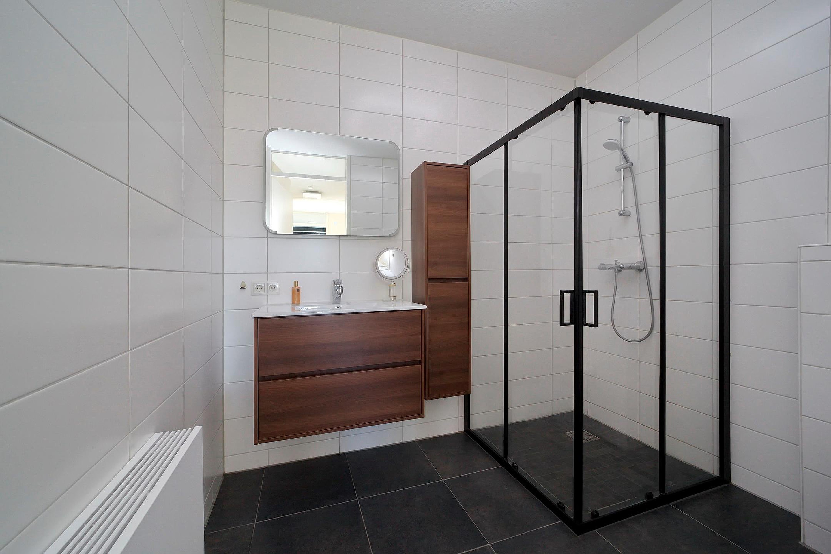 De moderne geheel betegelde badkamer heeft een wastafelmeubel, inloopdouche, toilet, infrarood verwarming en een anti condens spiegel met verlichting.