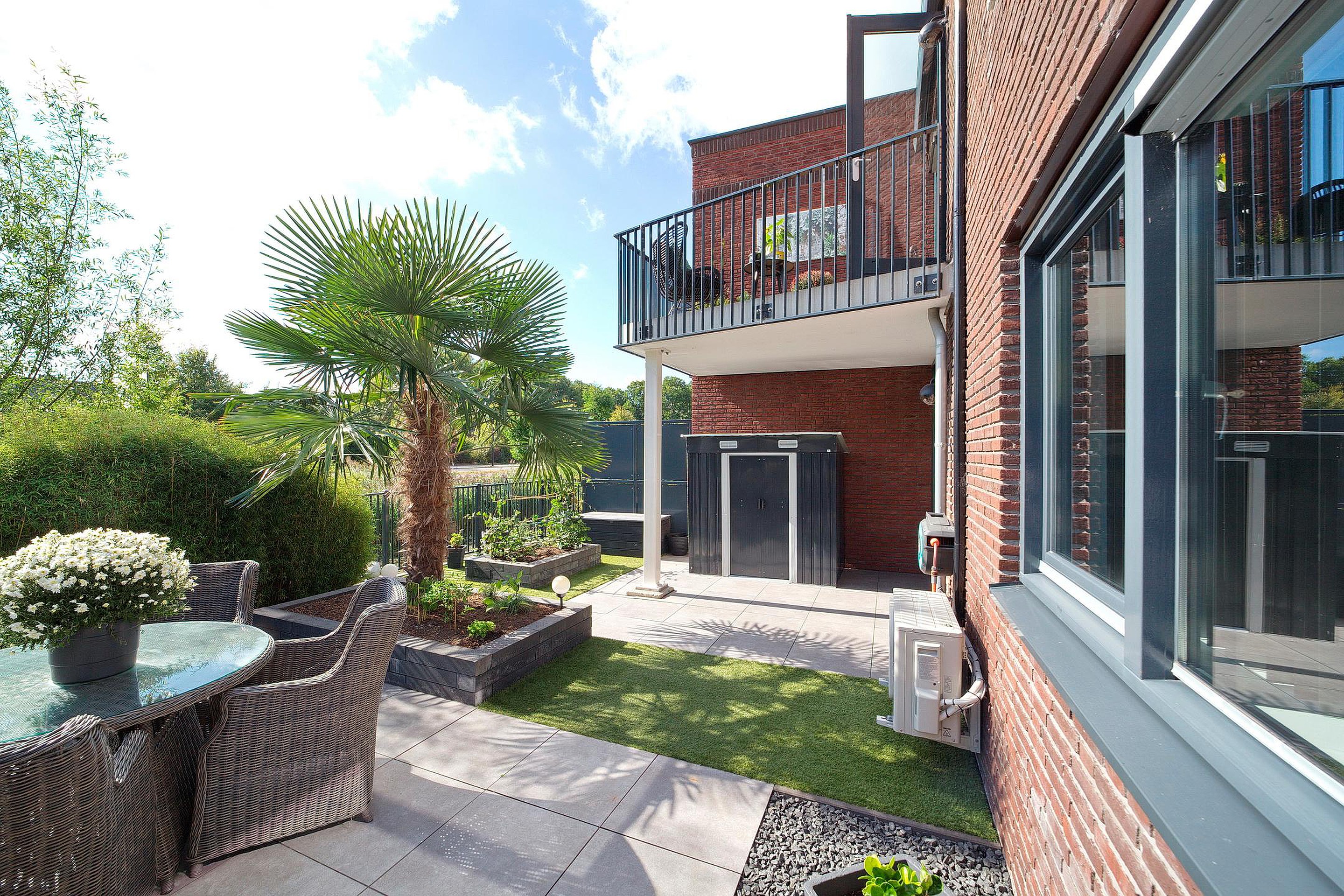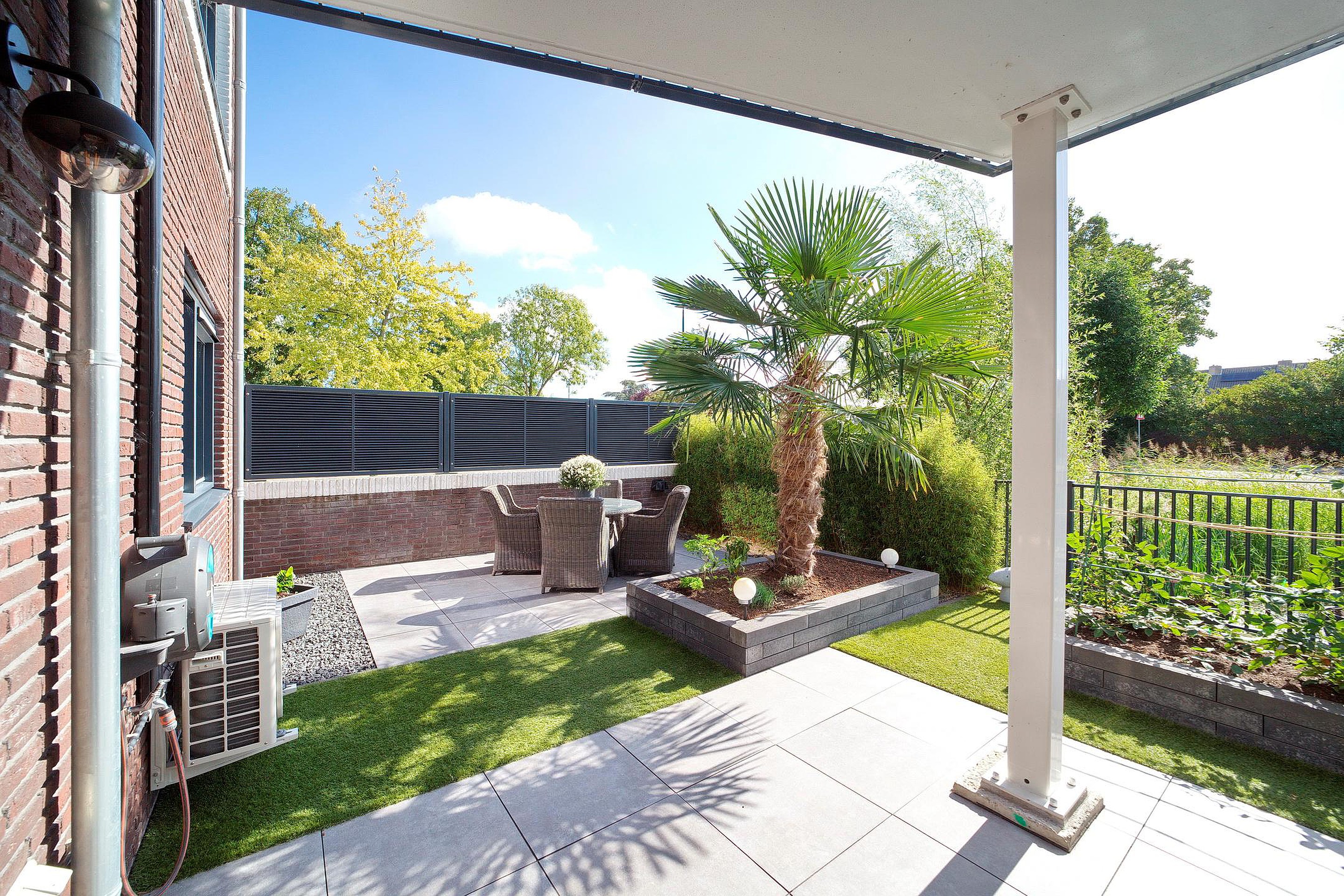 De aan de achterzijde langs het water gelegen tuin is perfect ingedeeld en goed onderhouden. Het terras met palmboom is betegeld en geeft bijzonder veel privacy. De kunststof berging voor de kussens e.d. blijft achter.