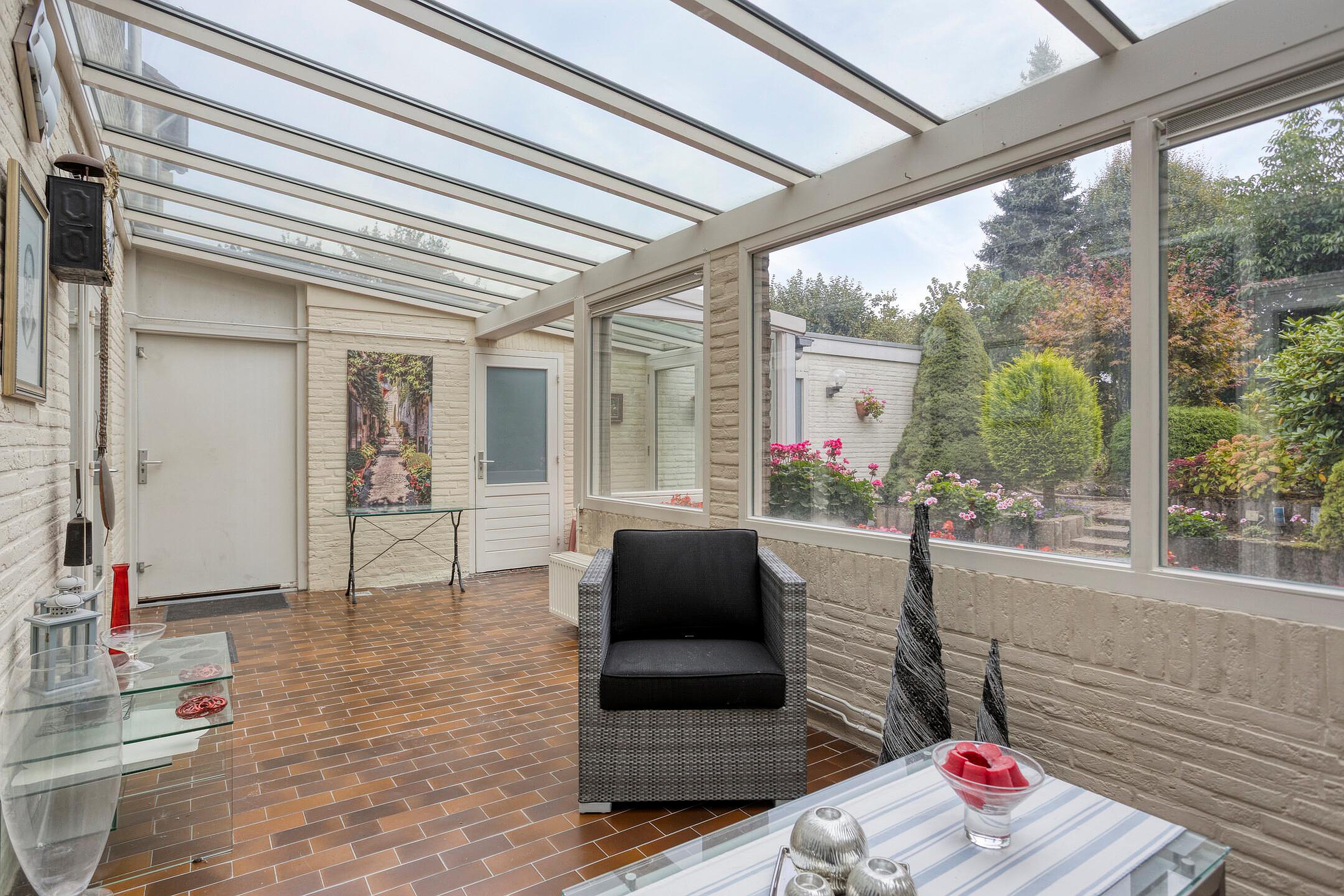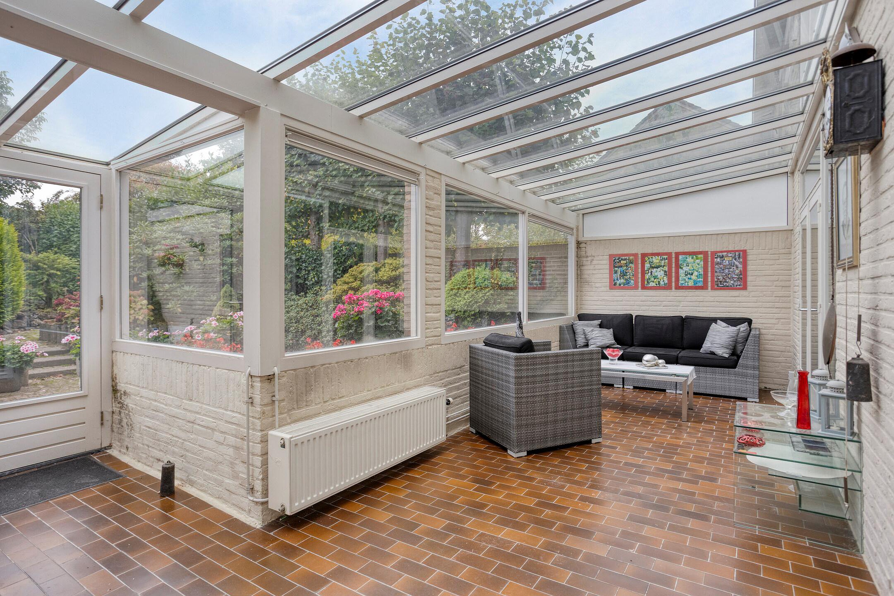 De serre/tuinkamer (ca. 22m2) beschikt over een tegelvloer en geeft toegang tot de garage en de tuin. De XL-garage (ca. 21m2) biedt ruim plek voor het parkeren van 1 auto en het opslaan van spullen. Er is licht en elektra aanwezig en tevens zijn de aansluitpunten voor het witgoed hier gerealiseerd.