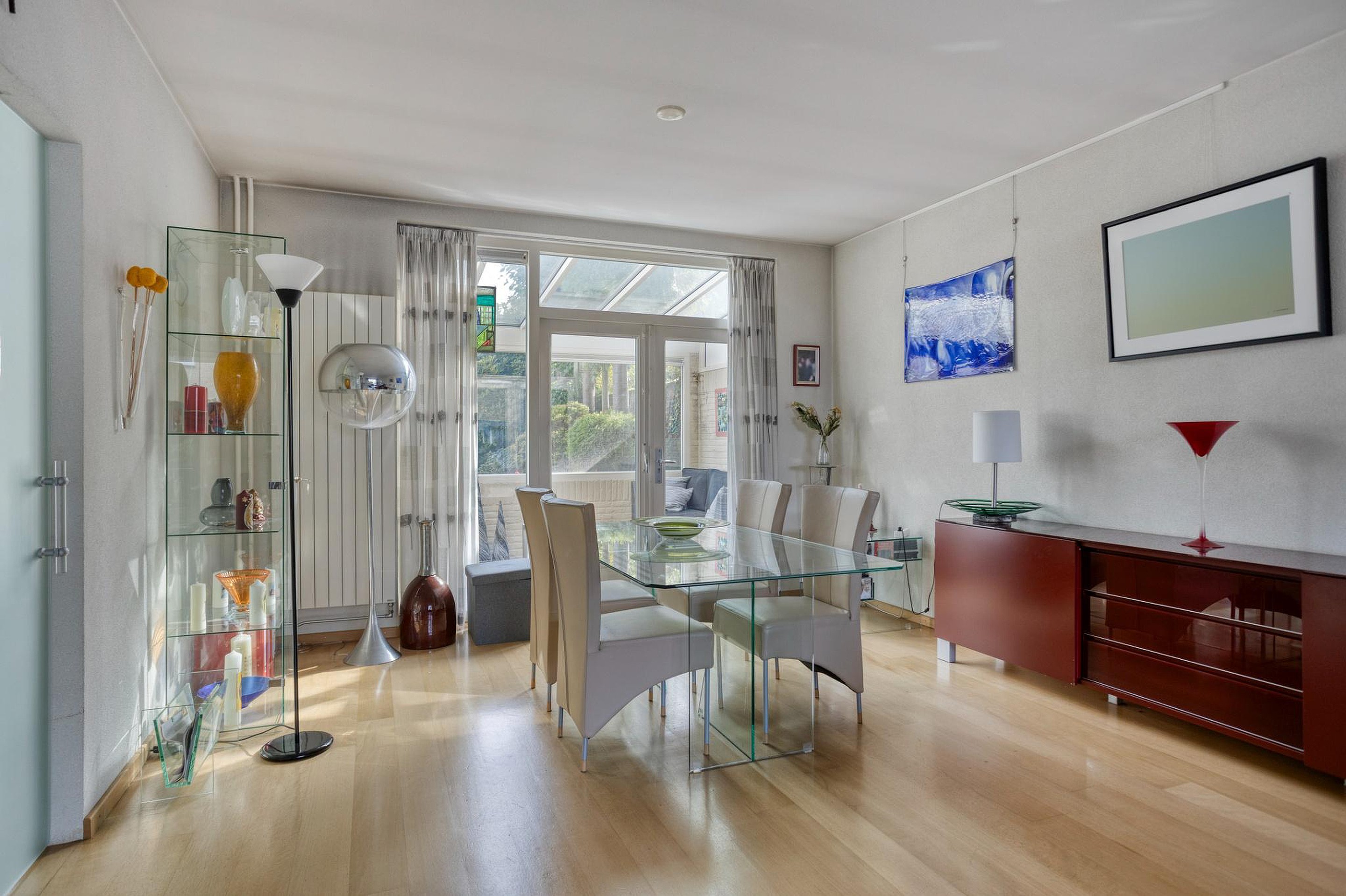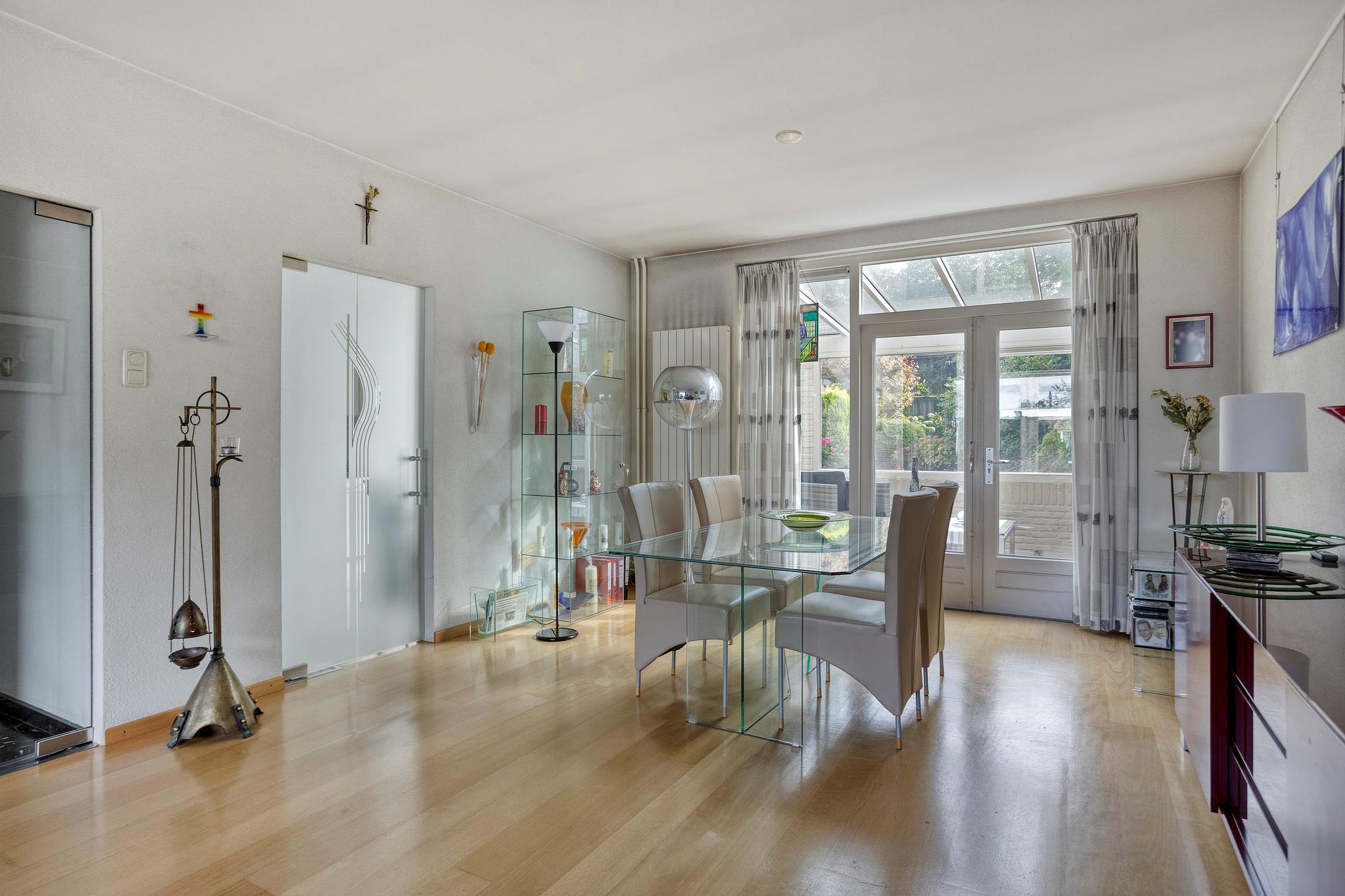 Royale en lichte doorzonwoonkamer (ca. 33m2), geheel voorzien van een hoogwaardige parketvloer.De zitkamer is aan de straatzijde van de woning gelegen en geniet veel lichtinval vanwege de grote ramenpartijen. De eethoek is aan de achterzijde gesitueerd. Met dubbele openslaande deuren is er toegang tot de serre/tuinkamer. Ook kan men via de woonkamer naar de keuken.