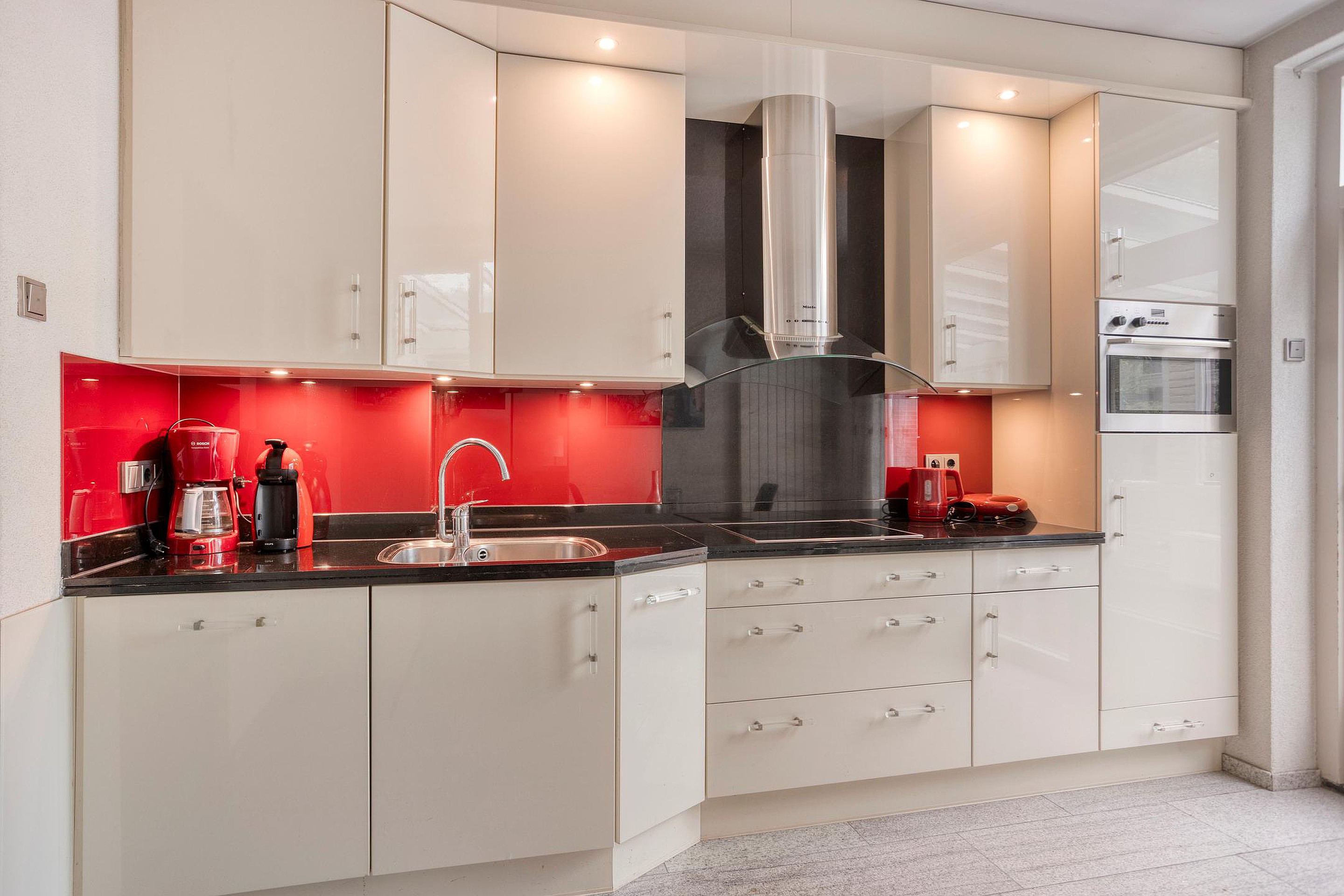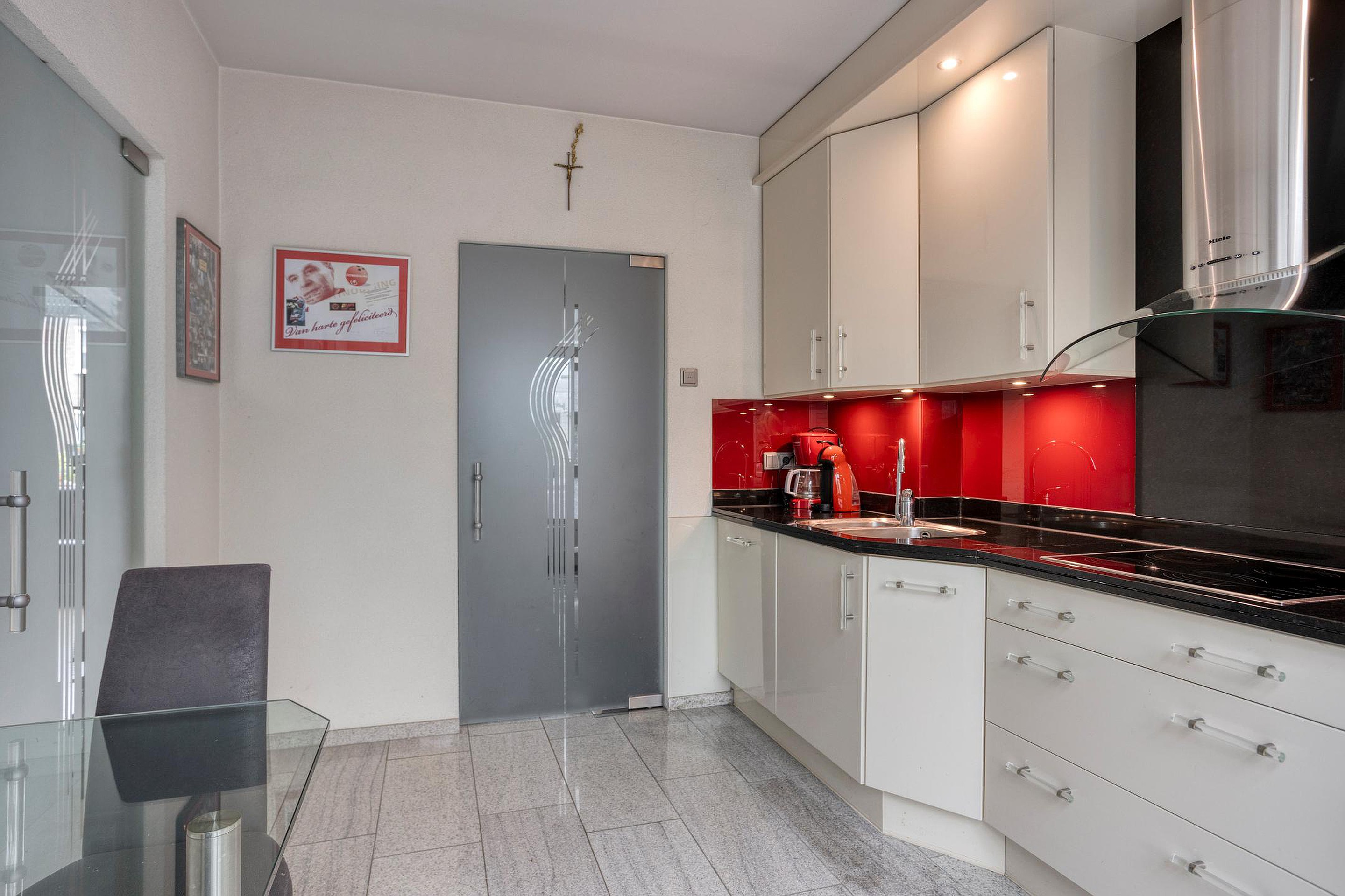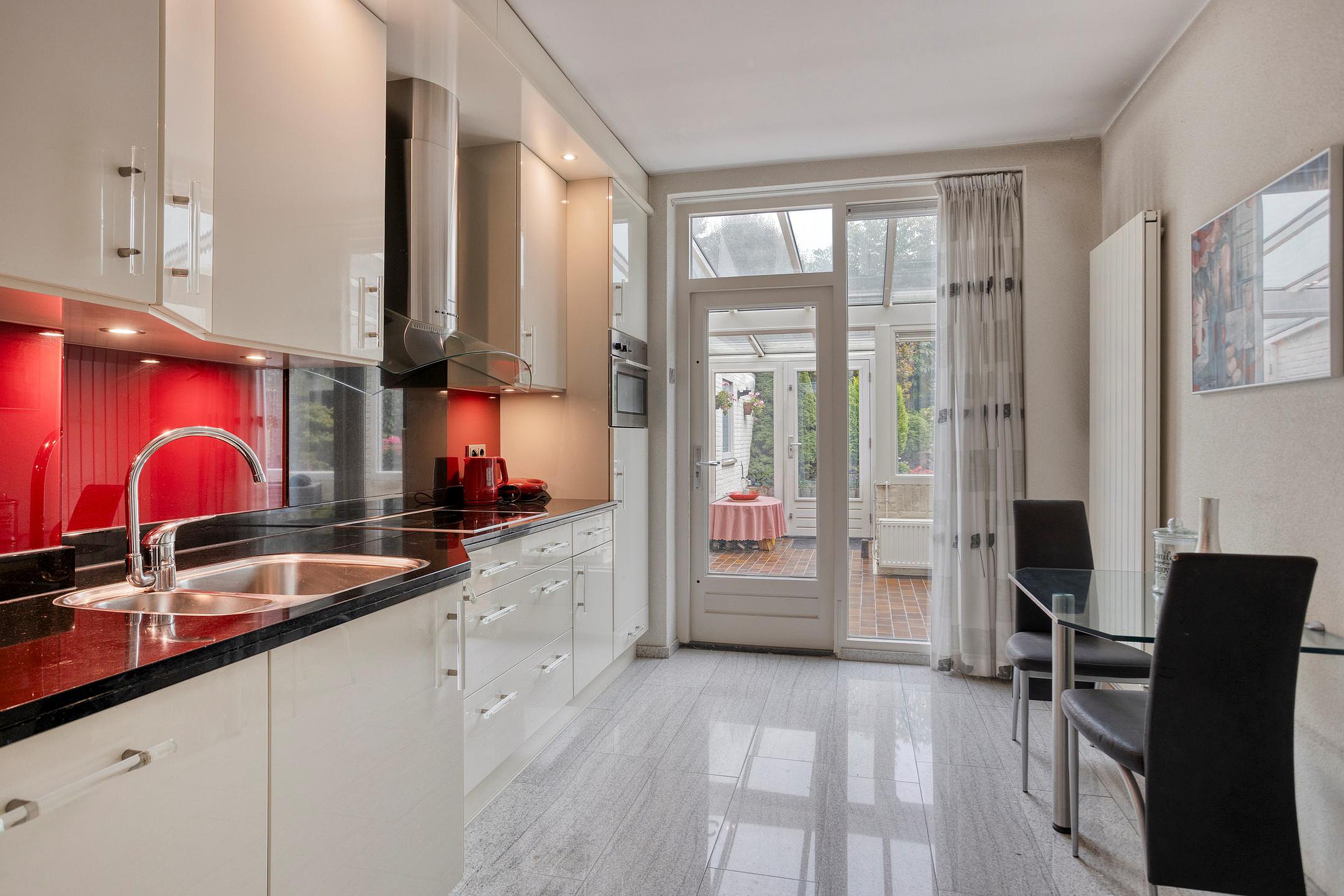De keuken (ca. 9m2) beschikt over een moderne keukeninstallatie met boven- en onderkasten en de navolgende apparatuur: 1,5 spoelbak, vaatwasser, koelkast, combimagnetron, elektrische kookplaat en een RVS-afzuiginstallatie. Het geheel is keurig afgewerkt met inbouwspots, massief aanrechtblad en een vaste ontbijttafel tegen de muur. Vanuit de keuken is er toegang naar de woonkamer en de serre/tuinkamer.