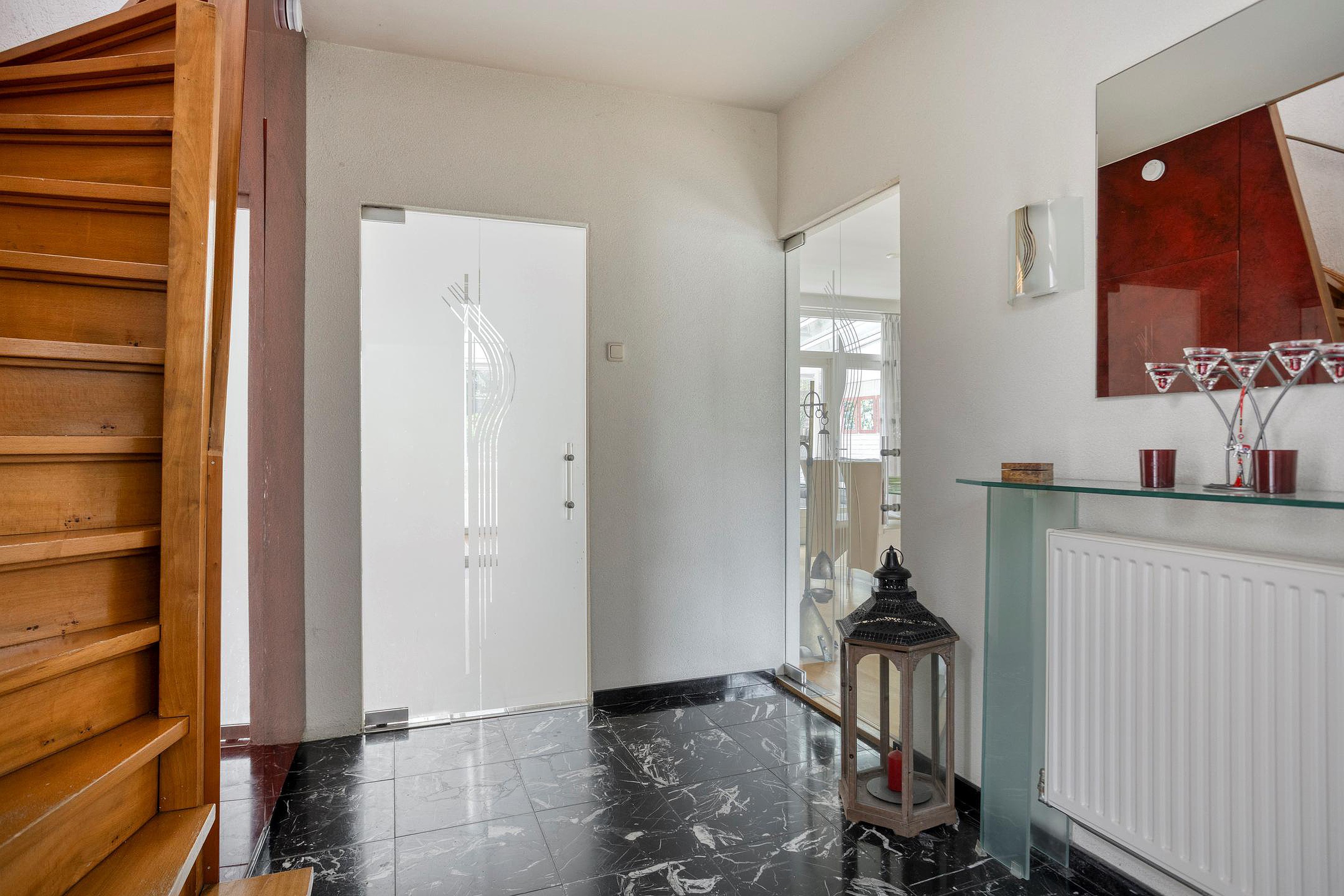 Entree met tochtportaal (ca. 1m2) en toegang tot de royale inkomhal (ca. 9m2), welke beschikt over een donkere marmer tegelvloer. Hier bevinden zich de garderobekast (inclusief meterkast met automatische groepen en slimme meters), een toiletruimte en de trapopgang naar de verdiepingen. De toiletruimte (ca. 1,5m2) is geheel gestuukt en voorzien van een wandcloset, een fonteintje, een spiegel en een radiator. Vanuit de hal is er verder toegang tot het souterrain, de keuken en de woonkamer.