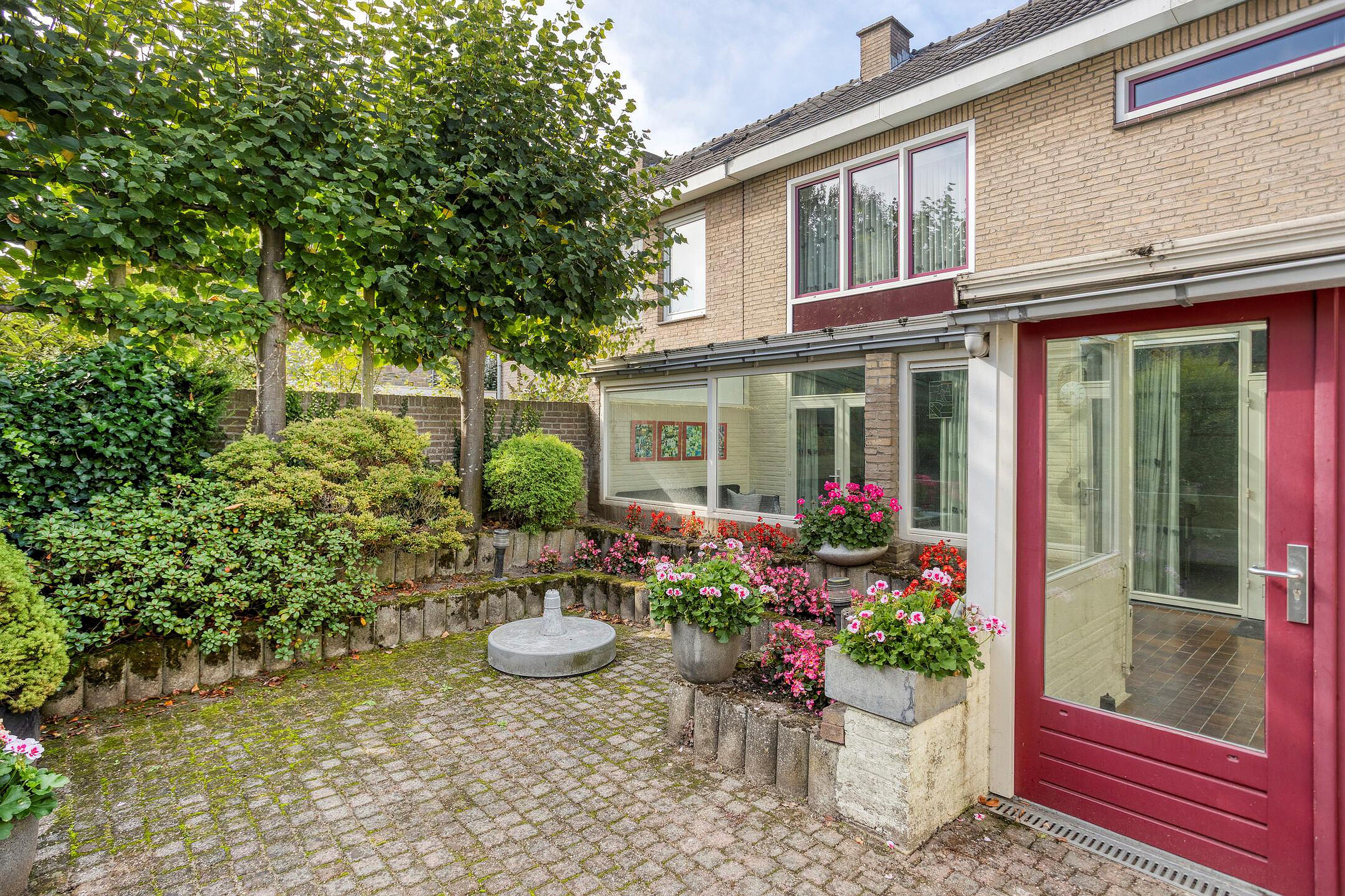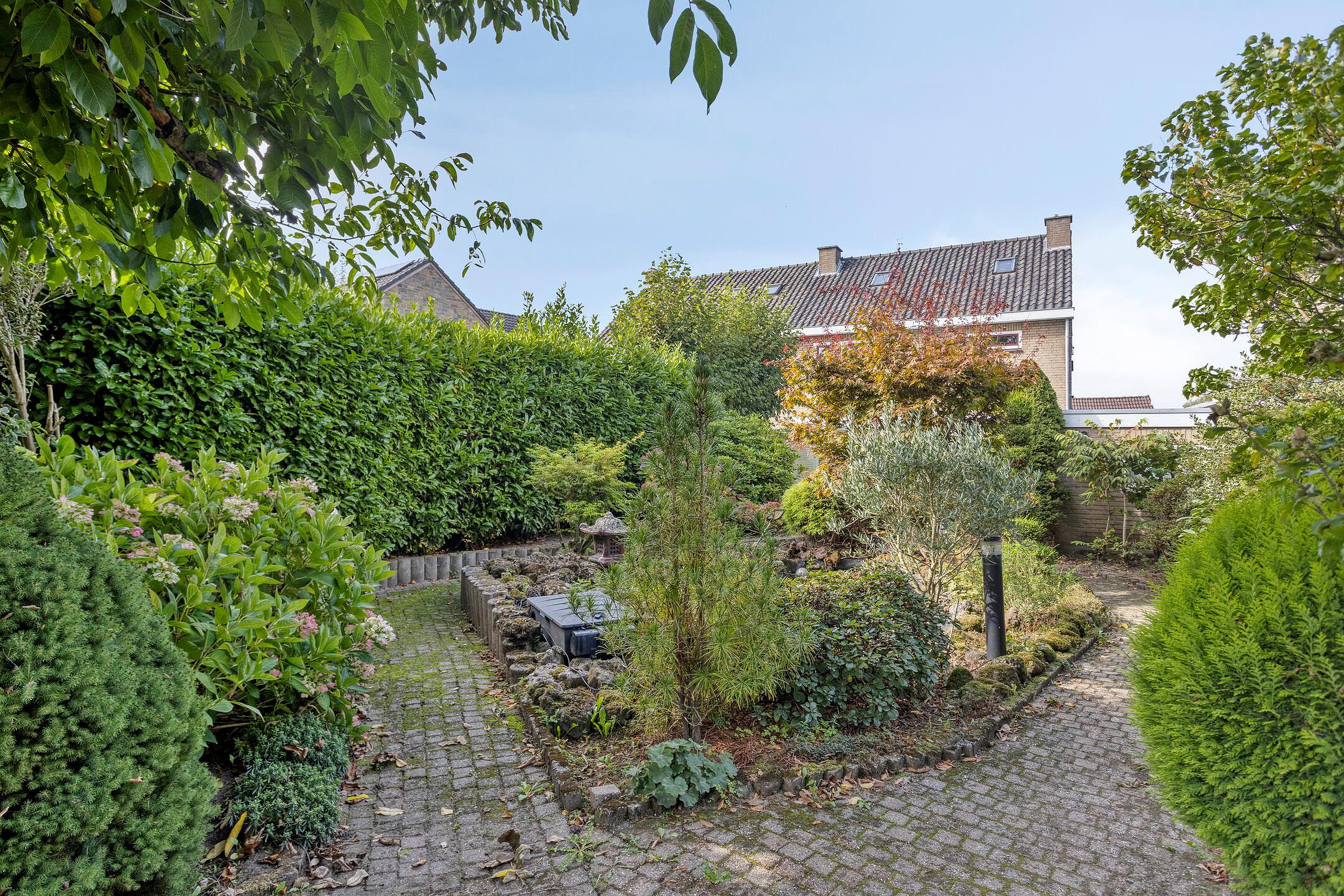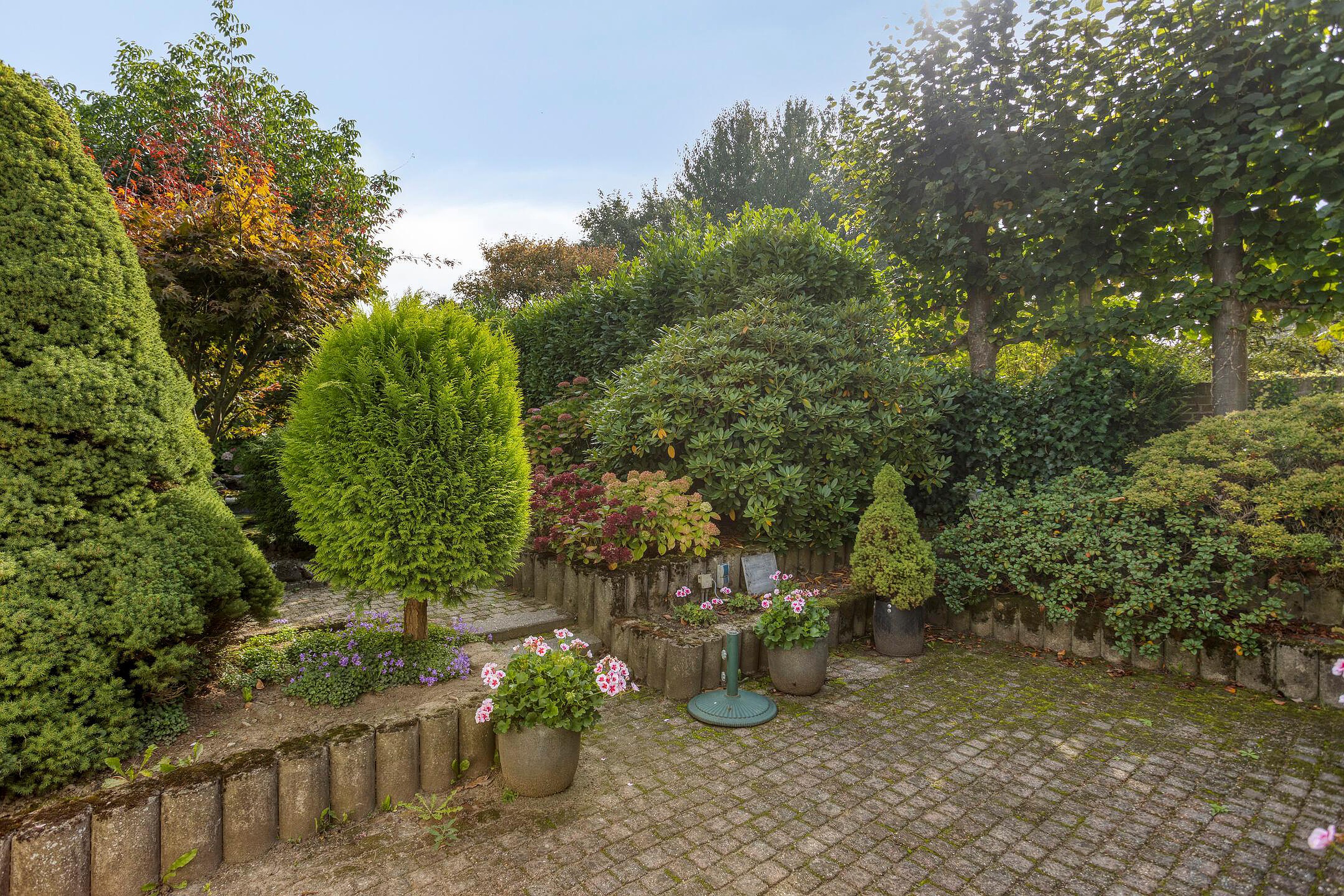 Geheel omsloten en sfeervolle achtertuin, gesitueerd op het oosten. De tuin beschikt over een betegeld terras, serre/tuinkamer, vijverpartij en diverse beplatingen, licht, elektra en een watertappunt. In een oase van rust kan men hier genieten van al het moois dat deze prachtige omgeving te bieden heeft. De voortuin is ruim van opzet en beschikt over diverse beplantingen en een oprit voor het parkeren van 3 auto's op eigen terrein.