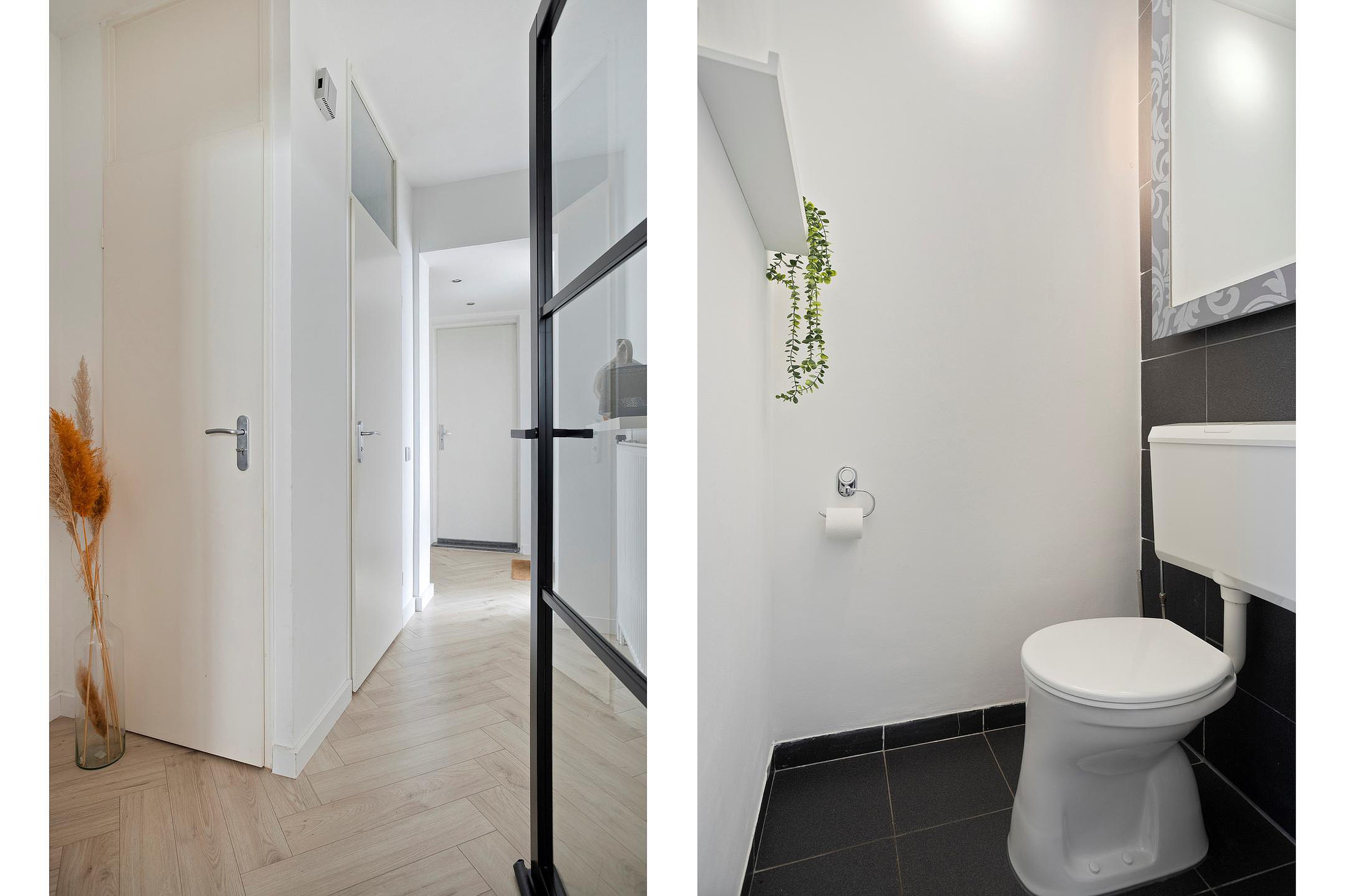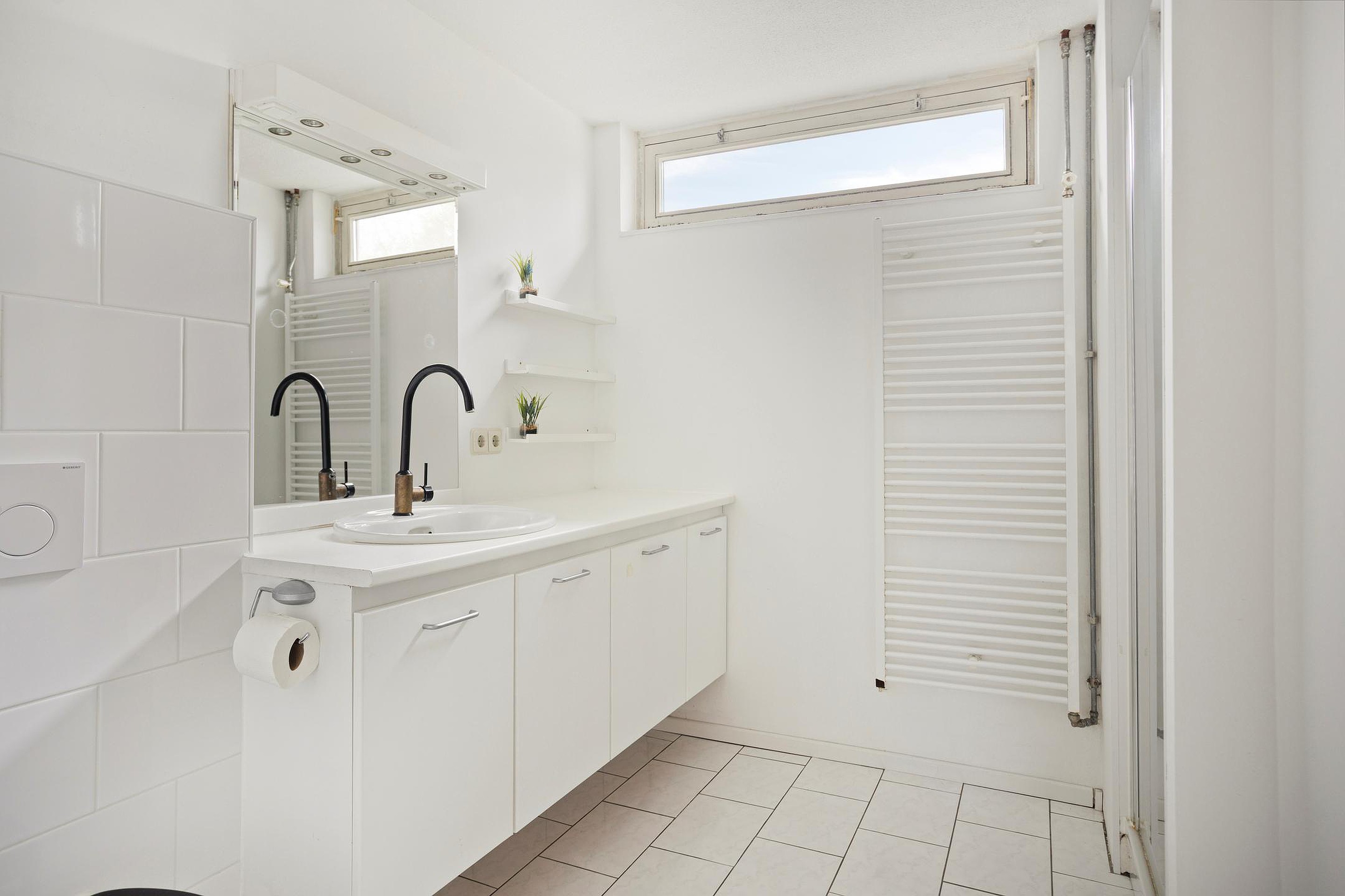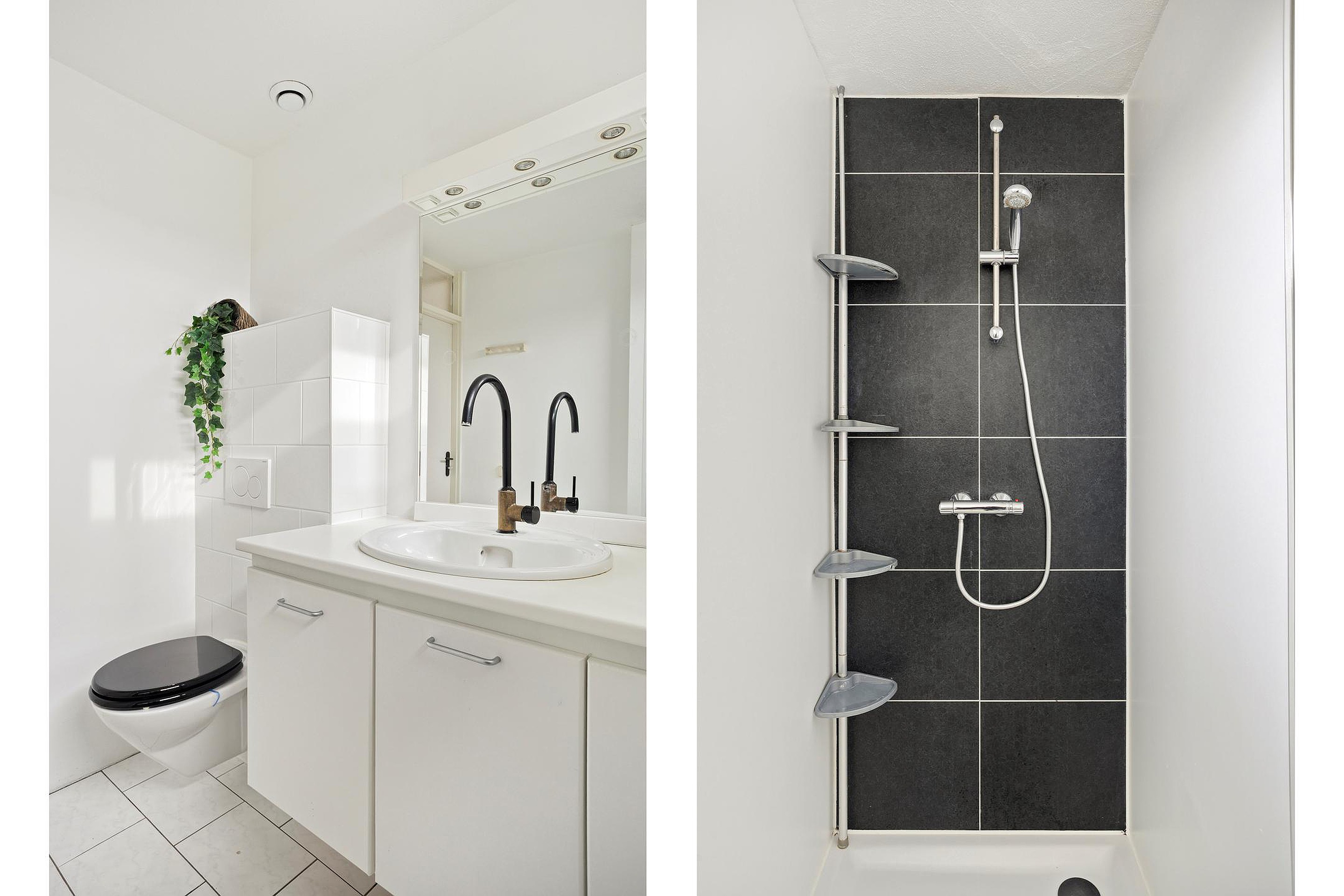 De badkamer (5 m2), vernieuwd in 2014, is smaakvol afgewerkt met een combinatie van tegelwerk en strak stucwerk. De ruimte beschikt over een douche, een wastafel met onderkast, een wandcloset, een handdoekradiator en mechanische ventilatie.