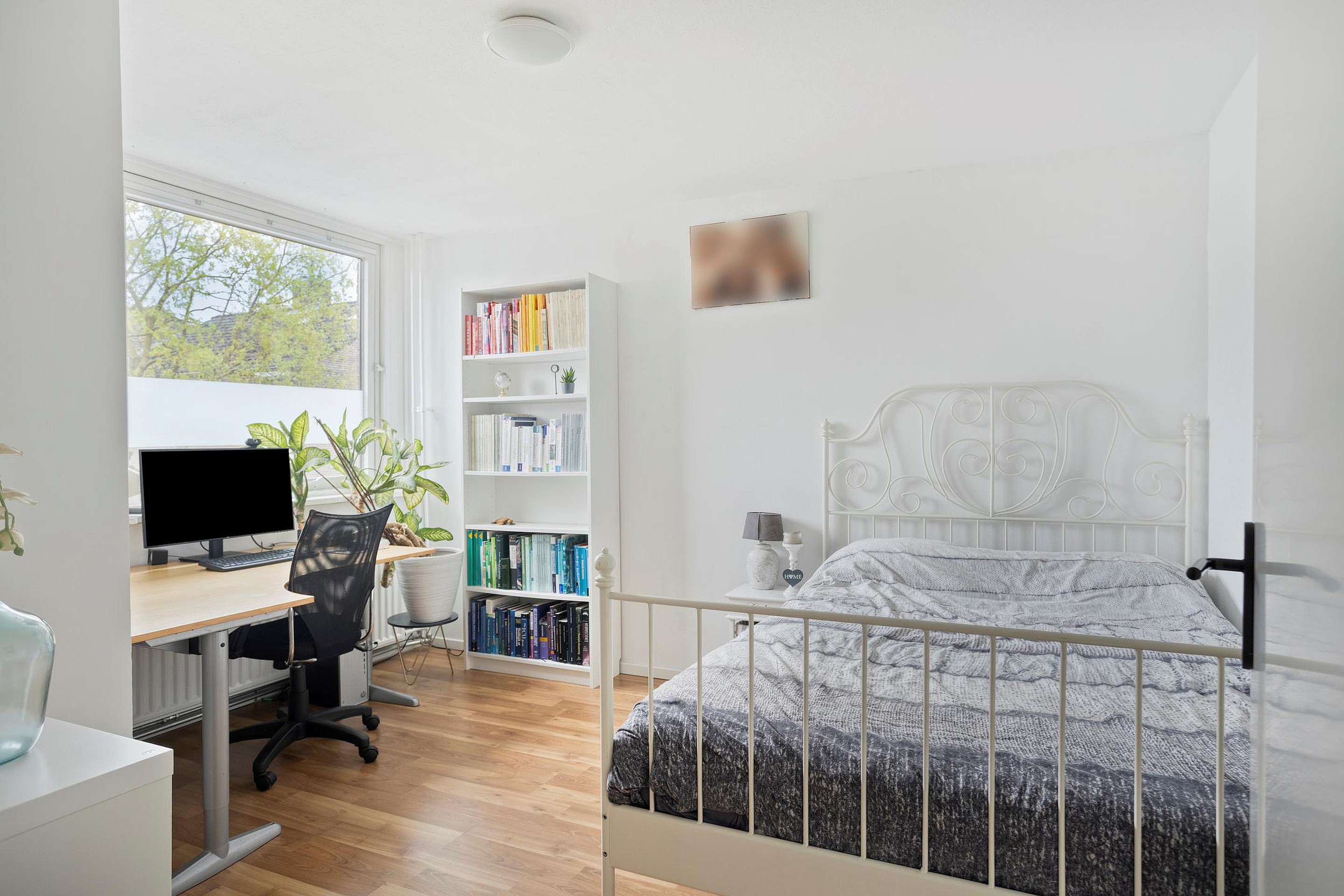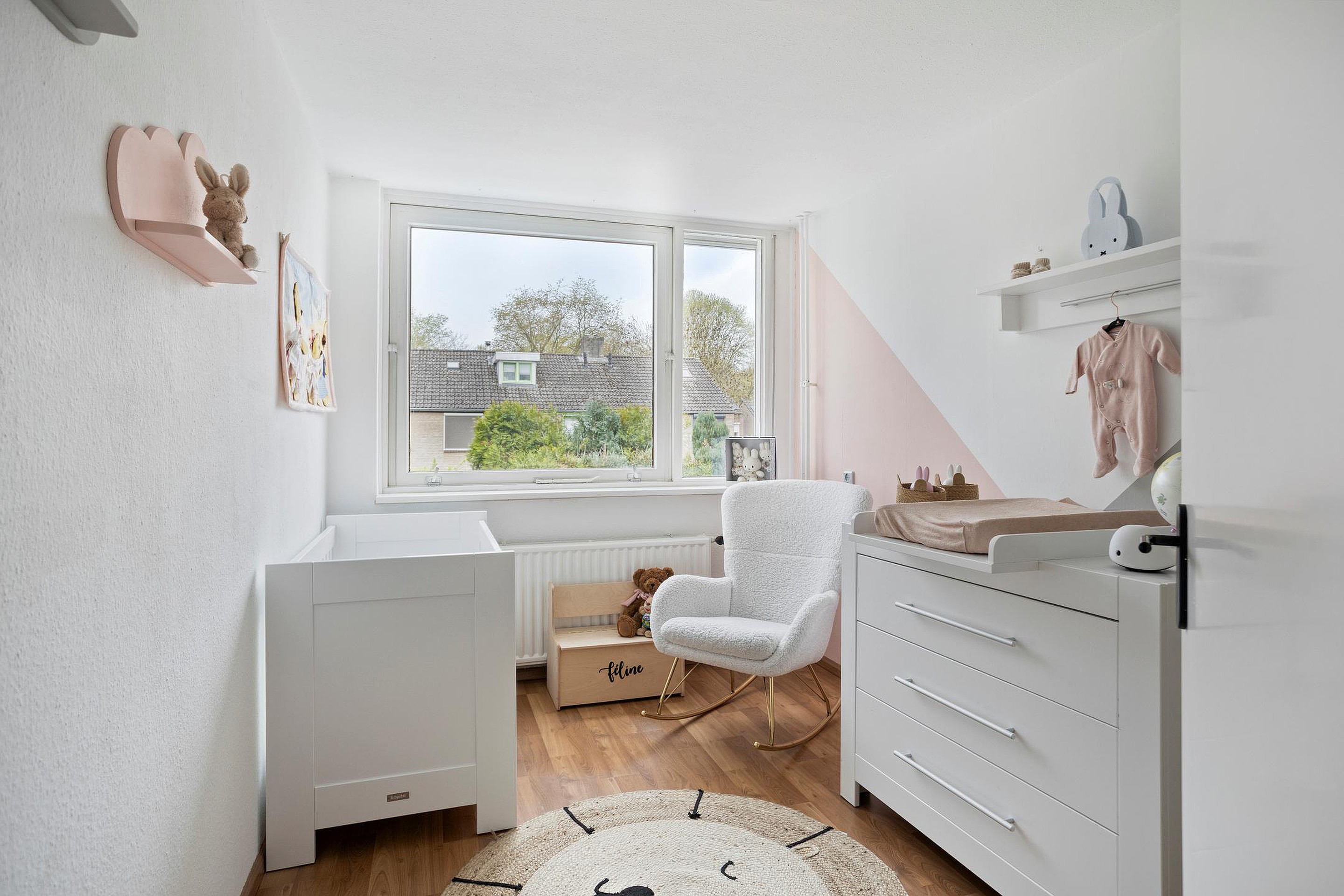 Overloop met toegang tot drie slaapkamers en de badkamer. De eerste slaapkamer (11m2) is gelegen aan de voorzijde. De tweede (14m2) en derde (8m2) slaapkamer zijn gelegen aan de achterzijde. Alle slaapkamers zijn voorzien van rolluiken, een lichte laminaatvloer, hardhouten kozijnen met isolerende beglazing en deels gestucte wanden.