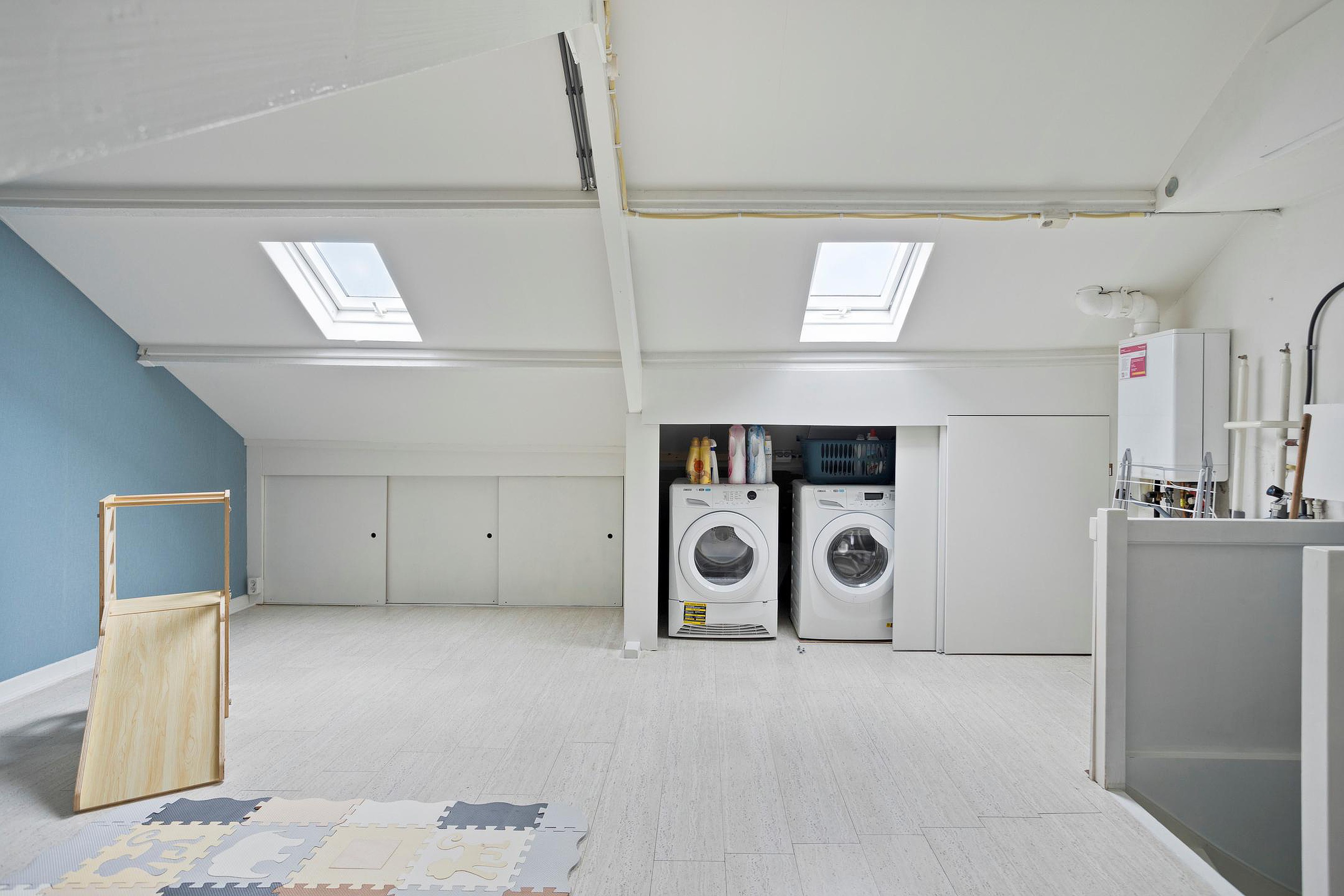 Via een vaste trap is de ruime zolderverdieping (26 m2) bereikbaar. Deze multifunctionele ruimte is ingericht als vierde slaapkamer en tevens in gebruik als was- en technische ruimte. Hier bevinden zich de aansluitingen voor witgoed, de cv-installatie (Intergas HRE, huur, bouwjaar 2010) en de mechanische ventilatie-unit.