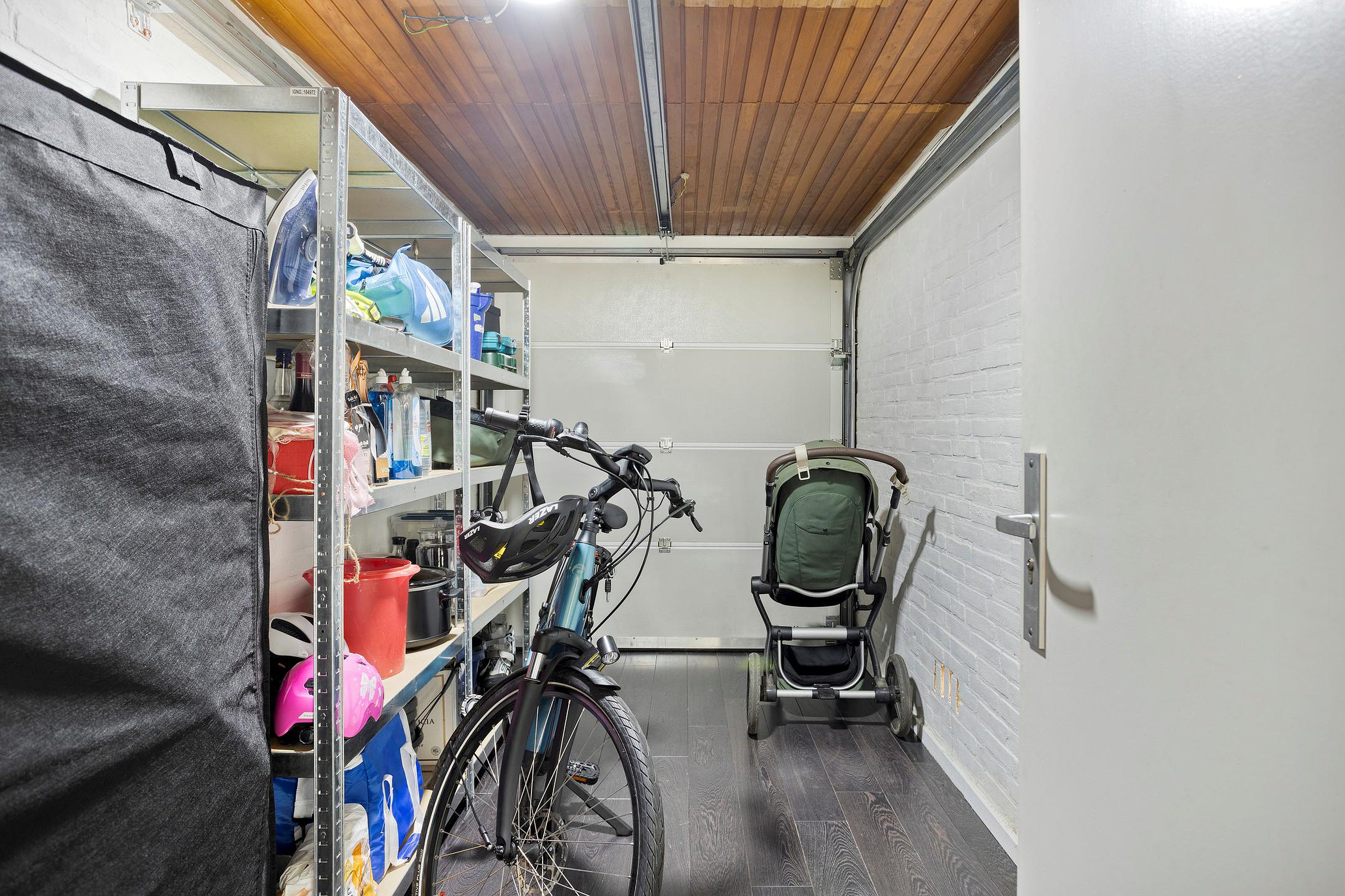 De inpandige berging (8m2) aan de voorzijde beschikt over licht, elektra, een elektrische sectionaalpoort en een toegangsdeur naar de oprit. De inpandige berging is voorzien van een donkere laminaatvloer. Tevens is in deze ruimte de omvormer van de zonnepanelen gesitueerd.