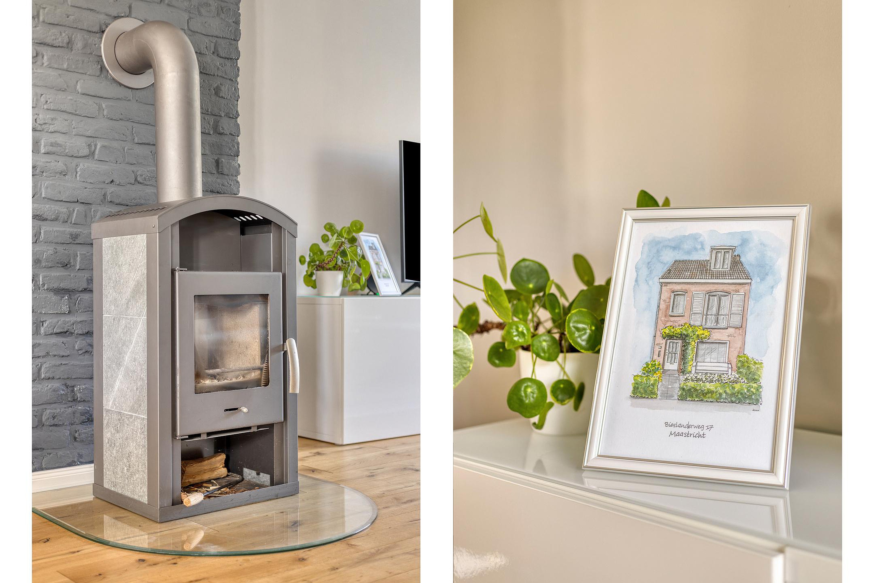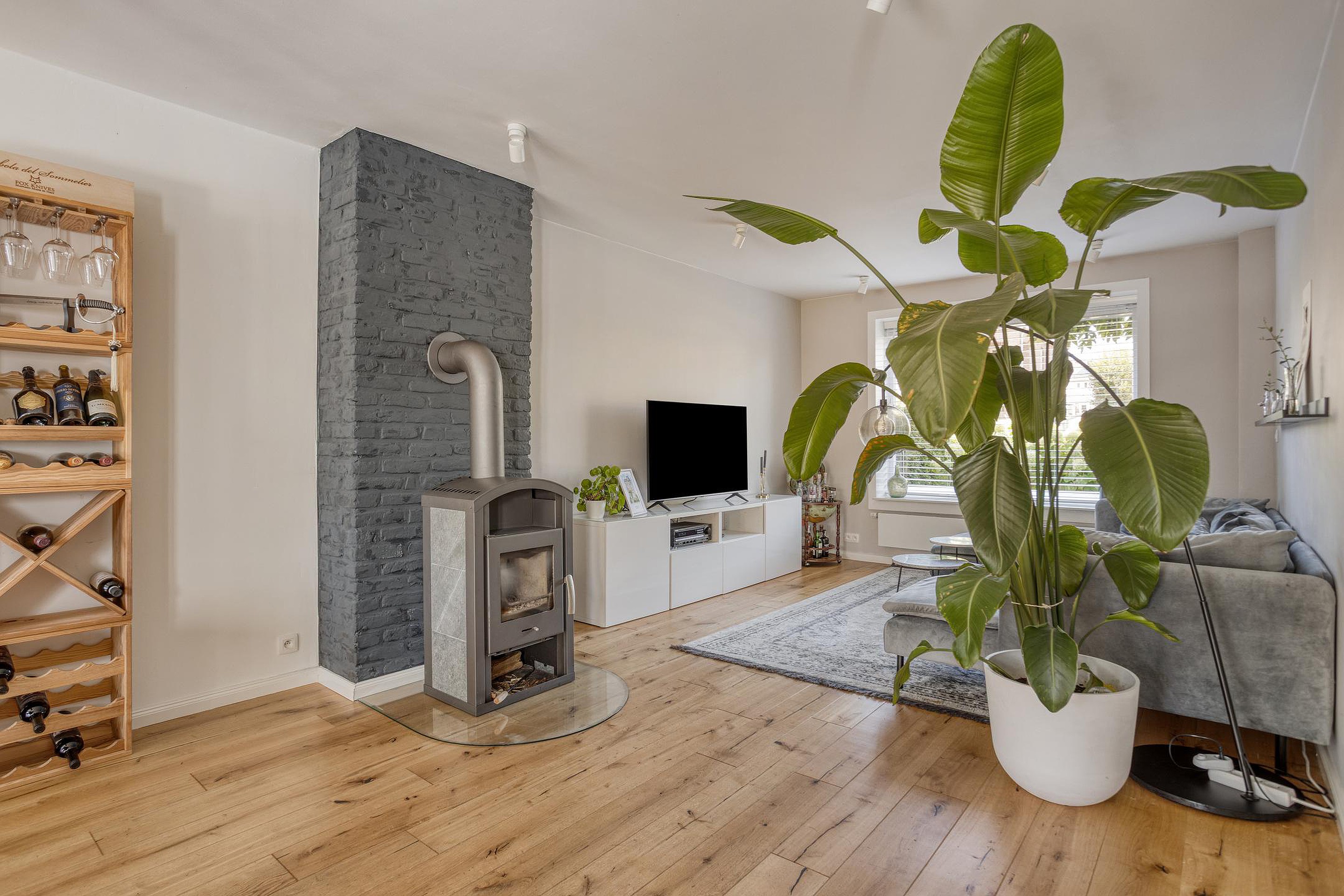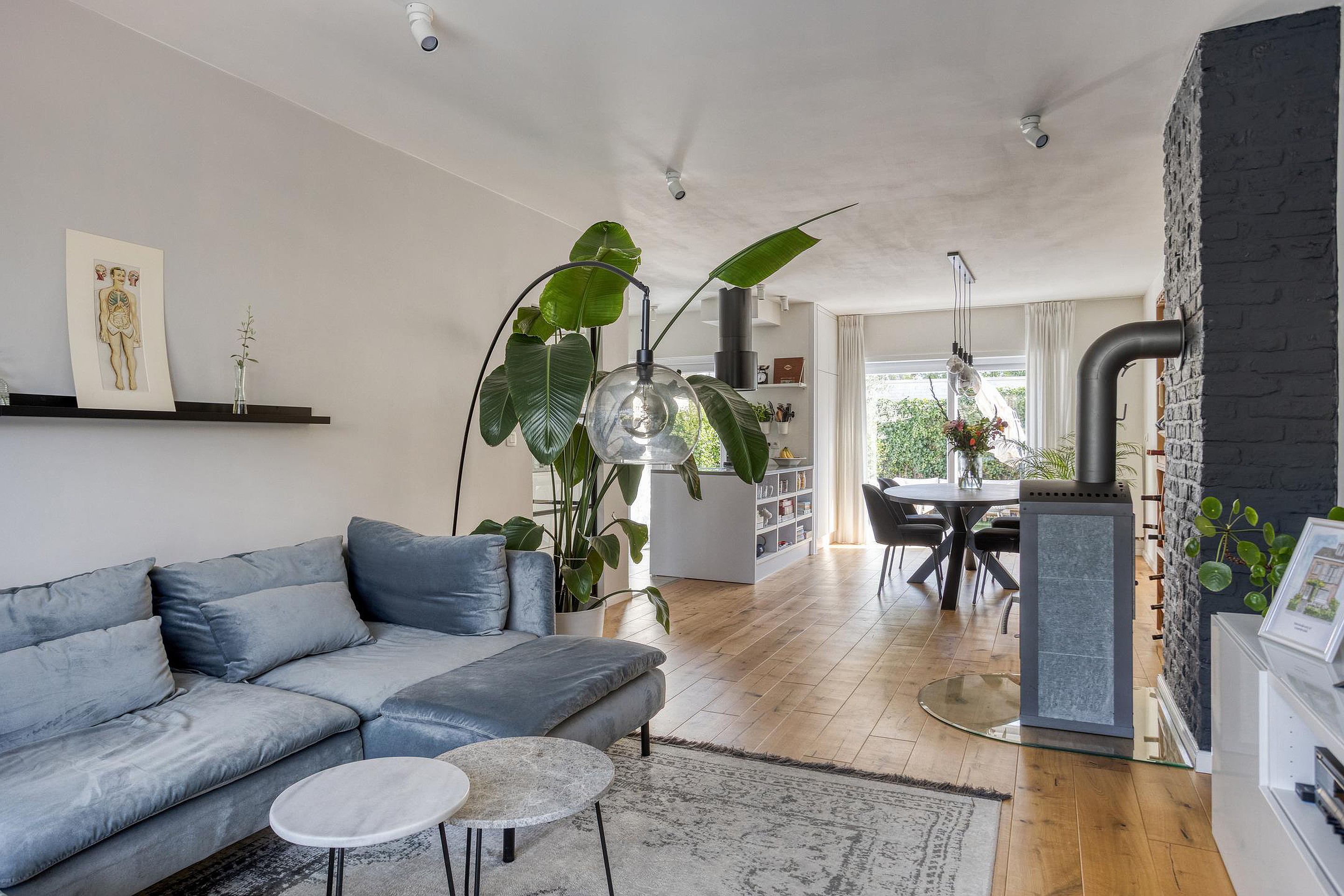 De doorzonwoonkamer (34m2) is voorzien van een keurige laminaatvloer, een sfeervolle houtkachel en een open verbinding met de keuken. Dankzij de grote raampartijen geniet je hier van veel natuurlijk licht.