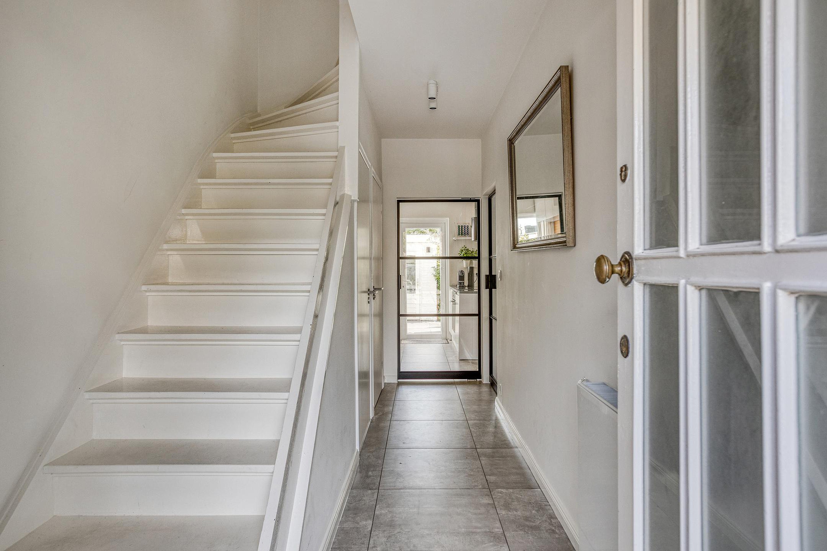 Via de verzorgde voortuin bereik je de entree van de woning. De hal is ruim en licht en biedt toegang tot de moderne meterkast (18 groepen), het toilet en de woonkamer.
