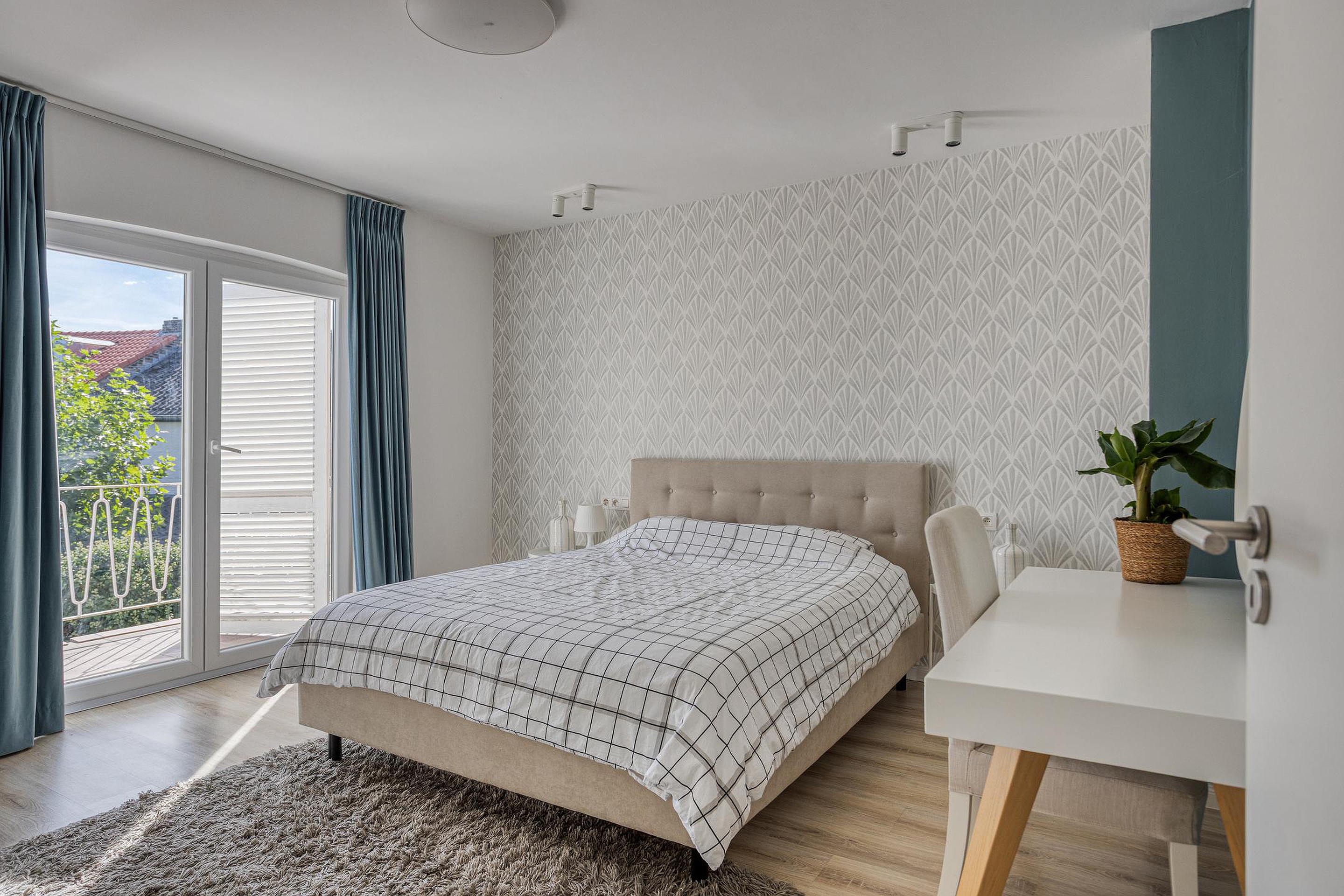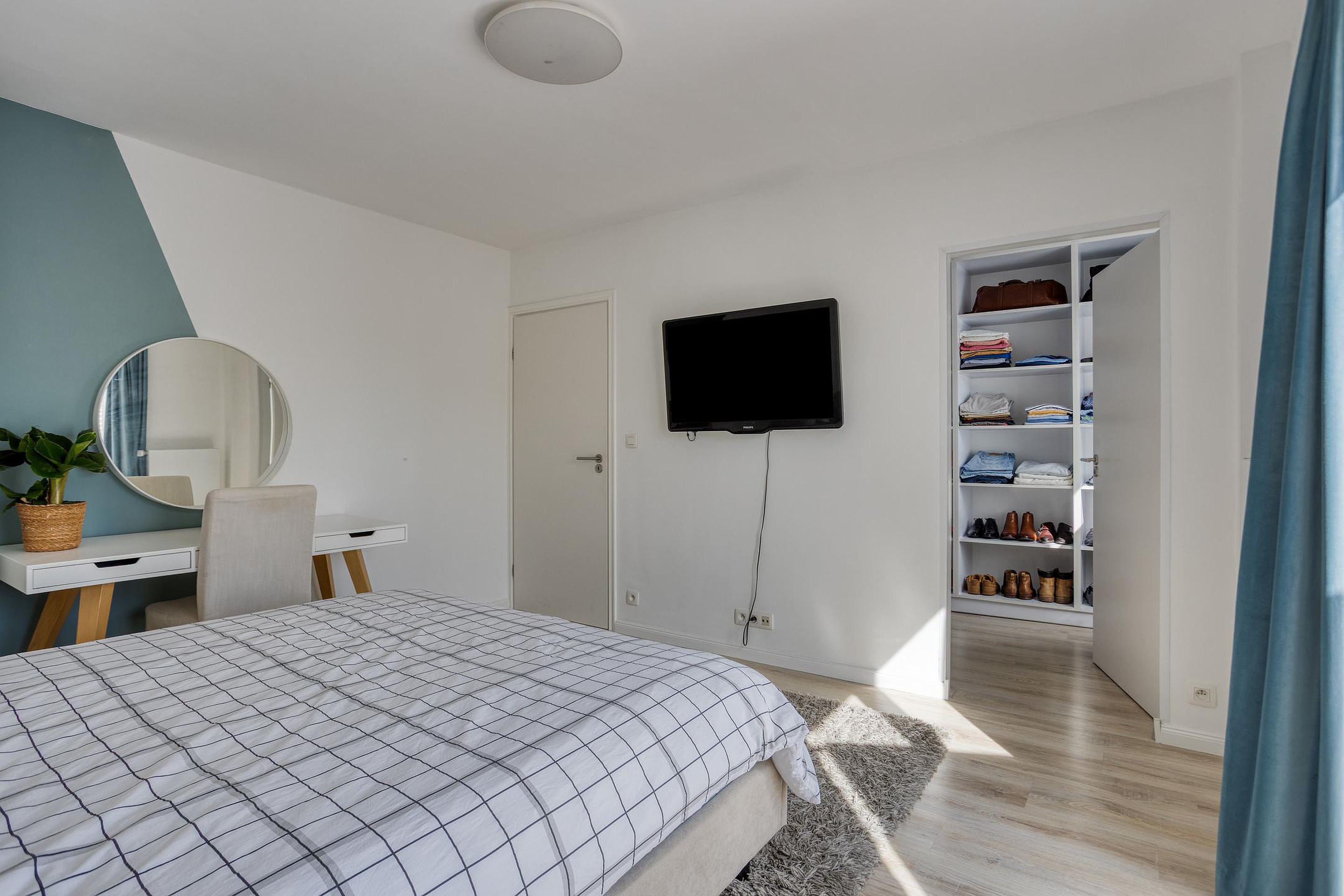 De hoofdslaapkamer (15m2) ligt aan de achterzijde van de woning en beschikt over directe toegang tot zowel een kleedruimte (6m2) als tot het balkon. Het balkon (5m2) is een heerlijke plek om in alle rust van de zon te genieten. Van de kleedkamer met praktische kastenwand kan vrij eenvoudig, indien nodig, een extra slaapkamer worden gemaakt.