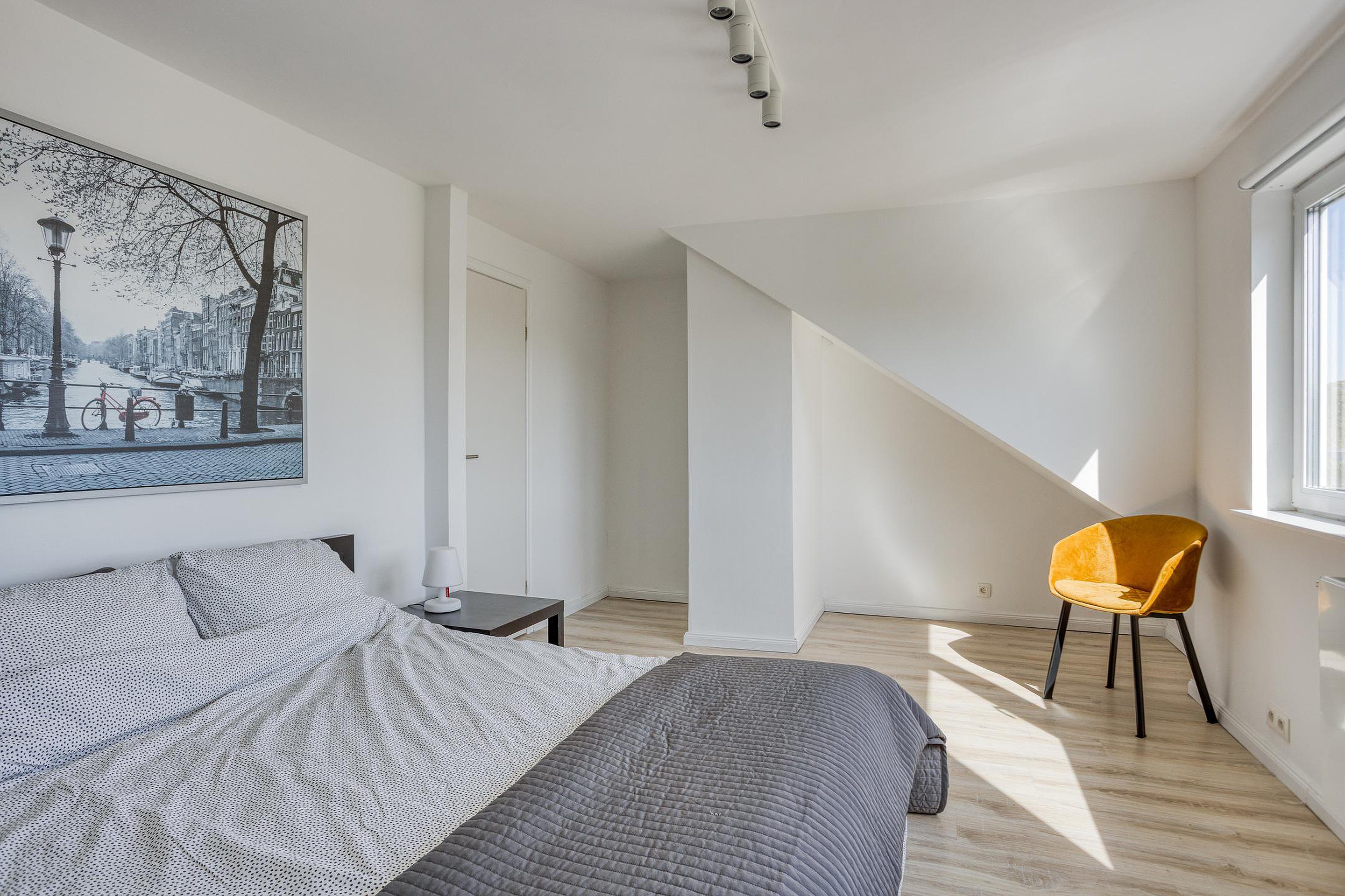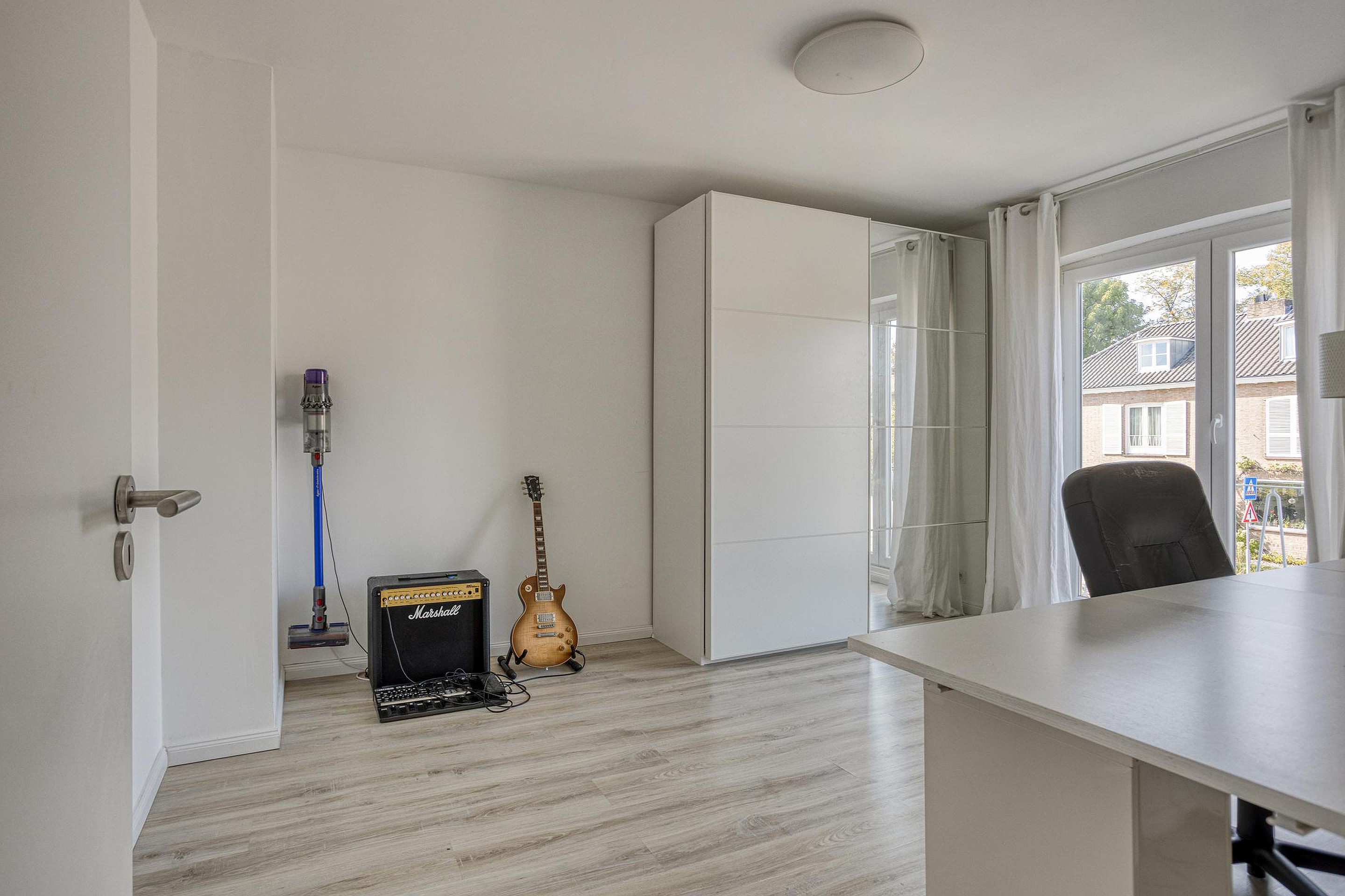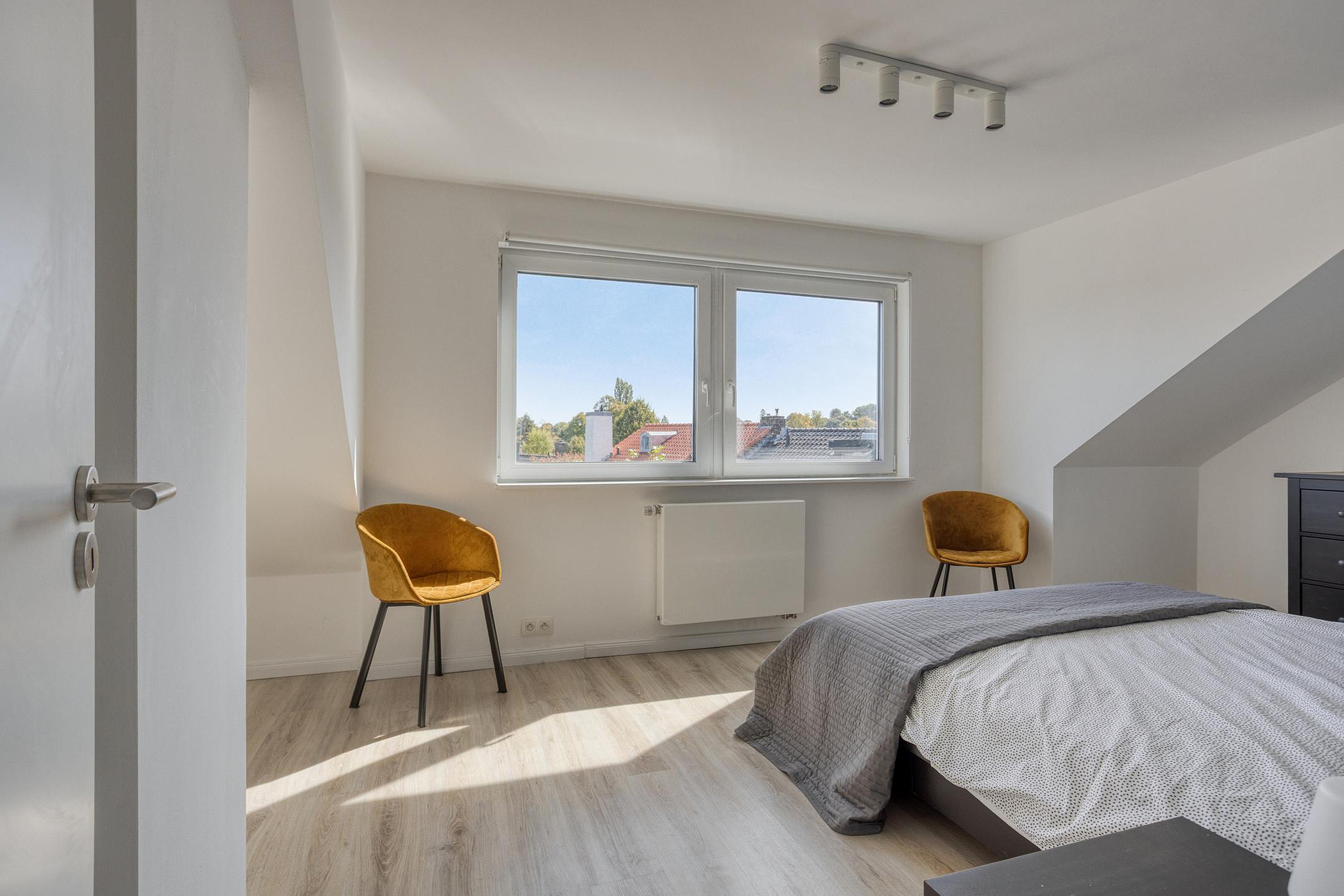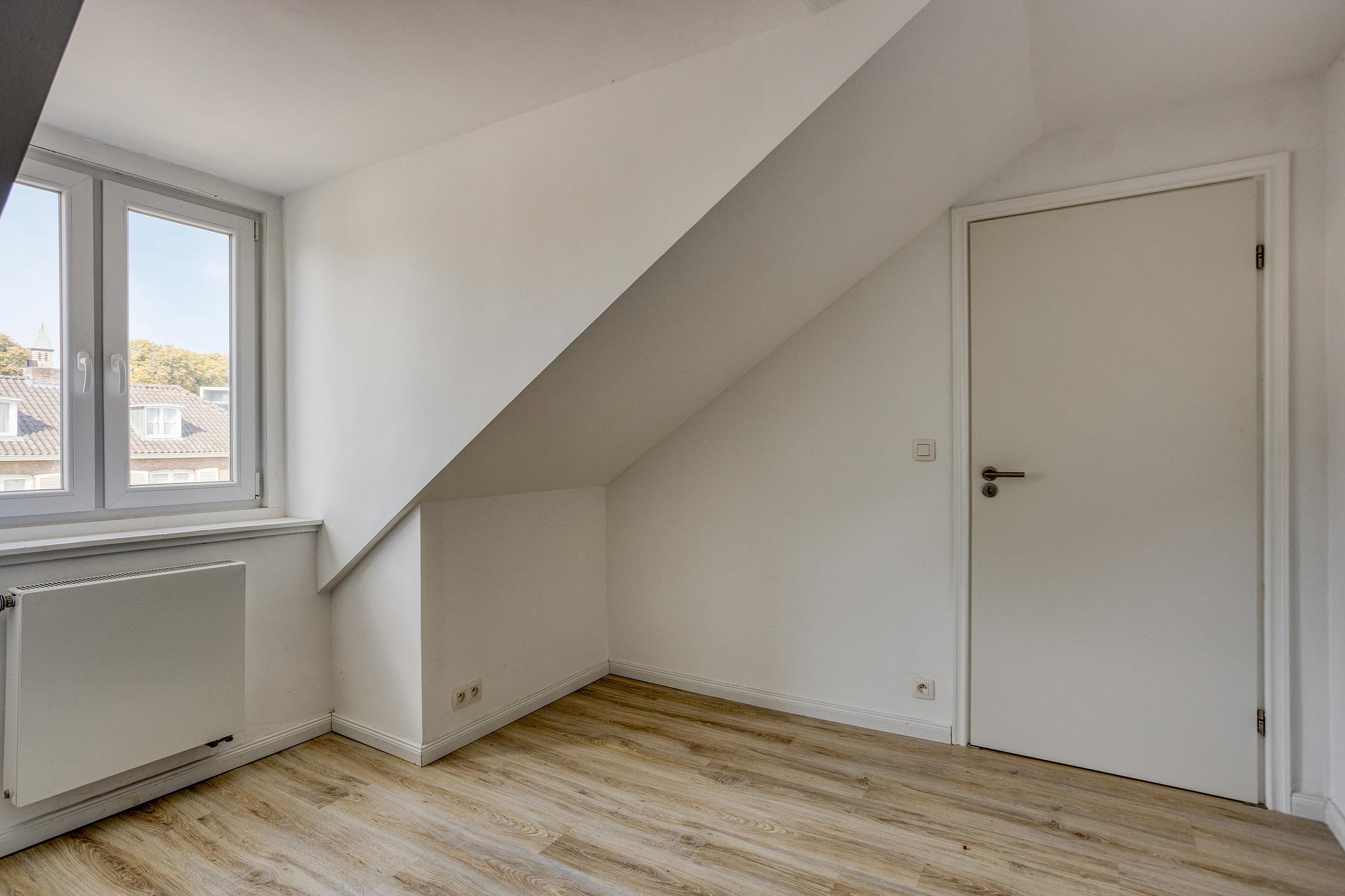 De vijfde slaapkamer (9m2) ligt aan de voorzijde en beschikt over de originele dakkapel, wat bijdraagt aan de authentieke sfeer van de woning. Deze kamer is prima geschikt als kinderkamer, logeerkamer of rustige thuiswerkplek. Beide slaapkamers beschikken over dezelfde mooie laminaatvloer.