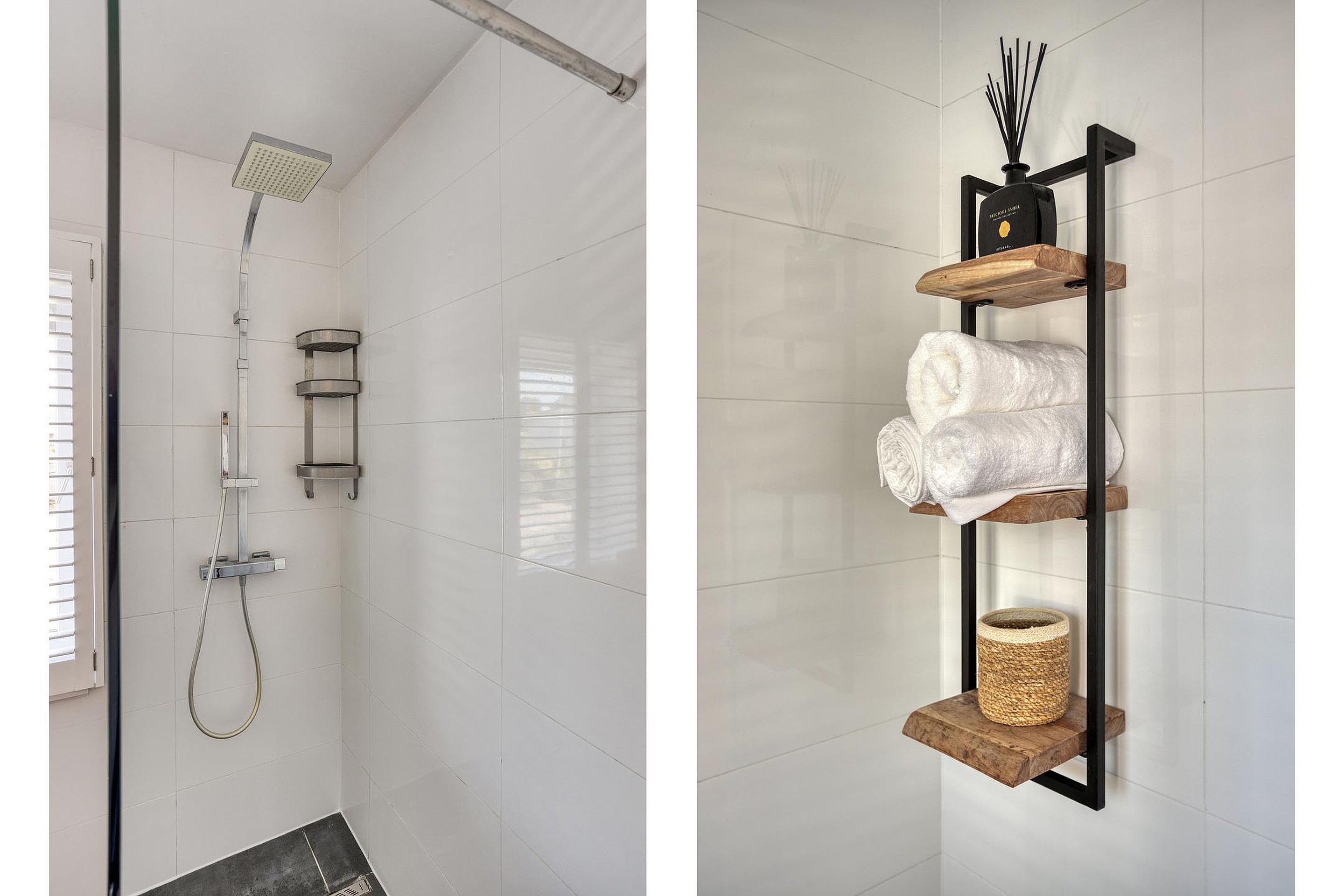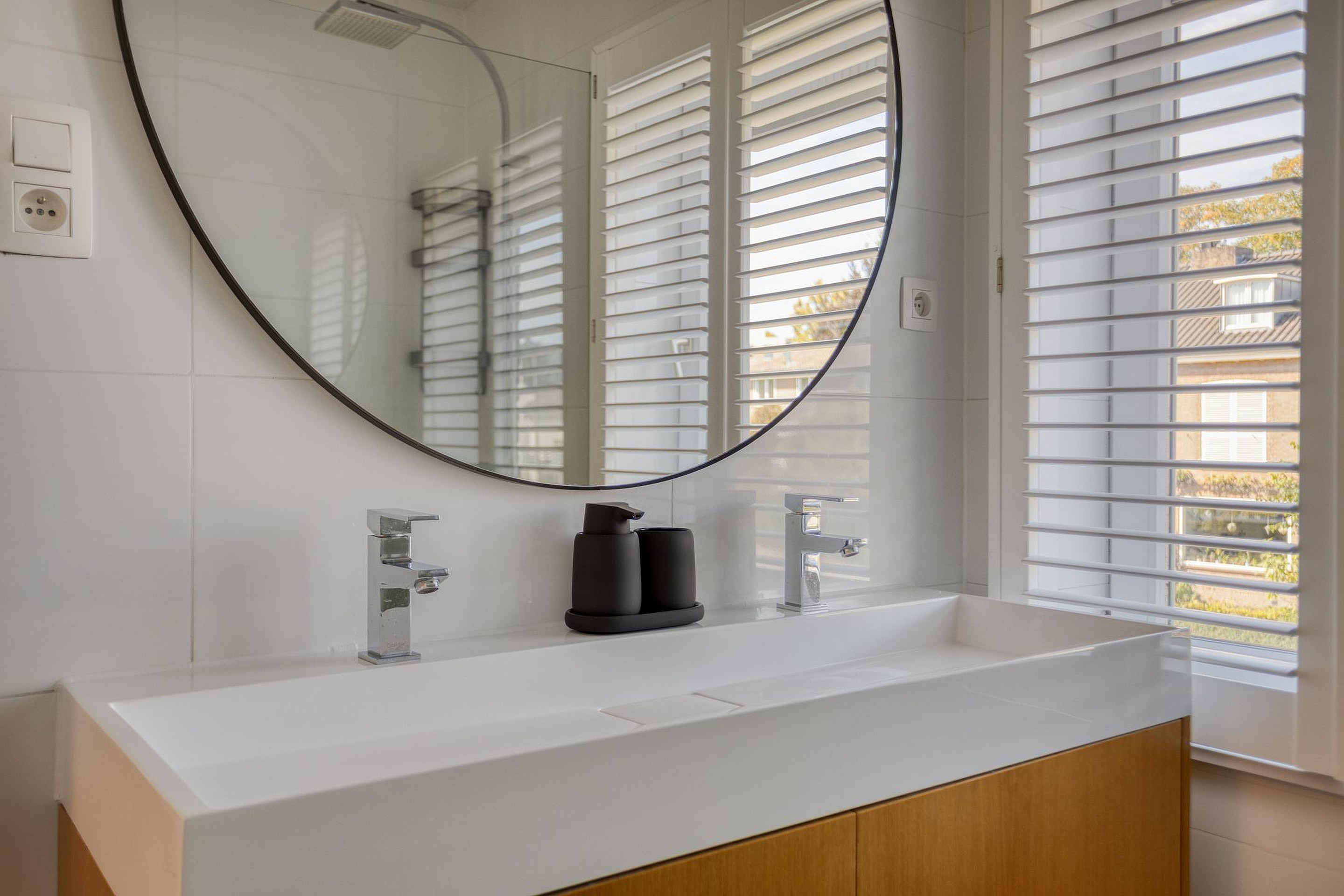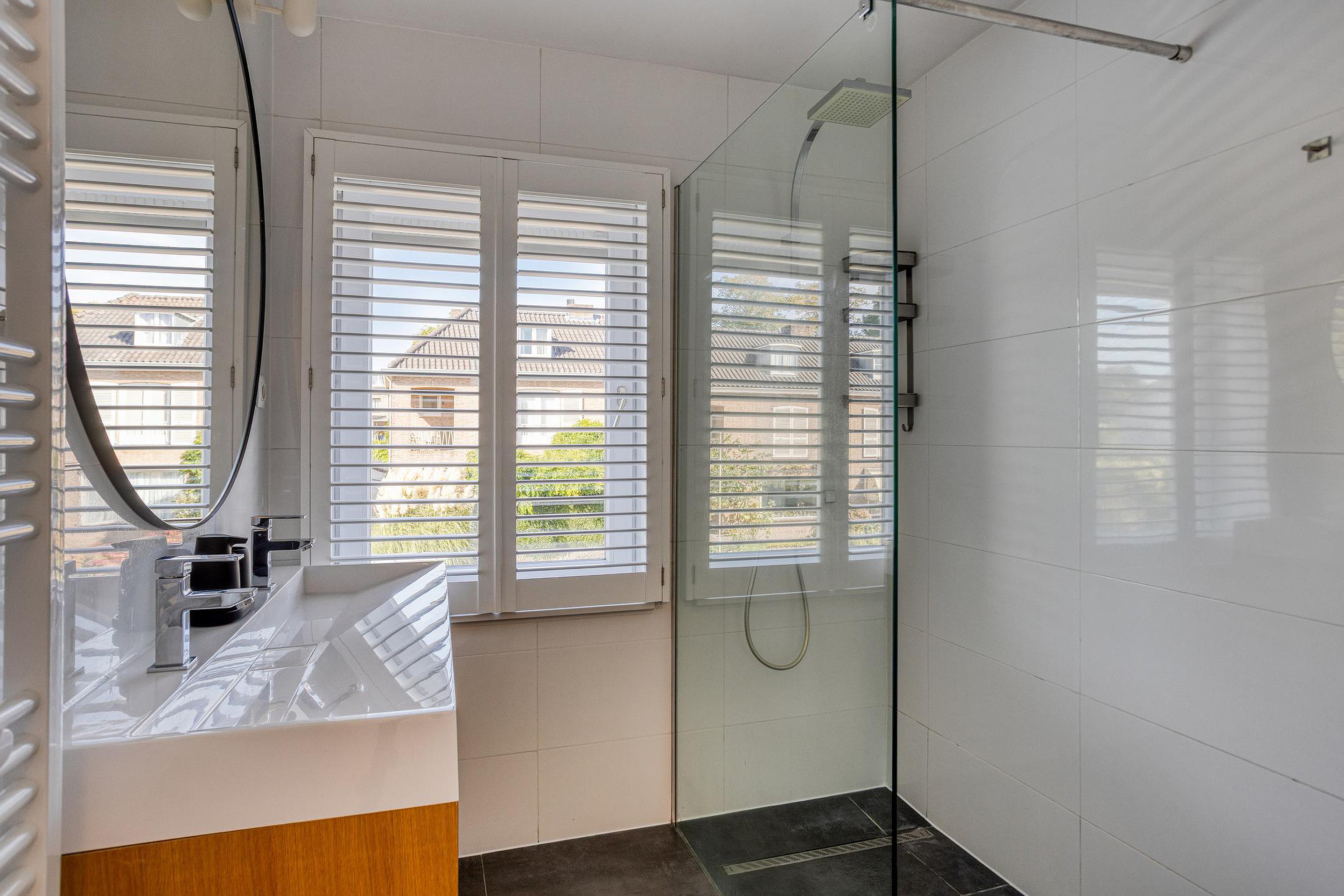 De moderne badkamer (4m2) is stijlvol afgewerkt en is voorzien van een ruime inloopdouche met een dubbele vaste wastafel met meubel..