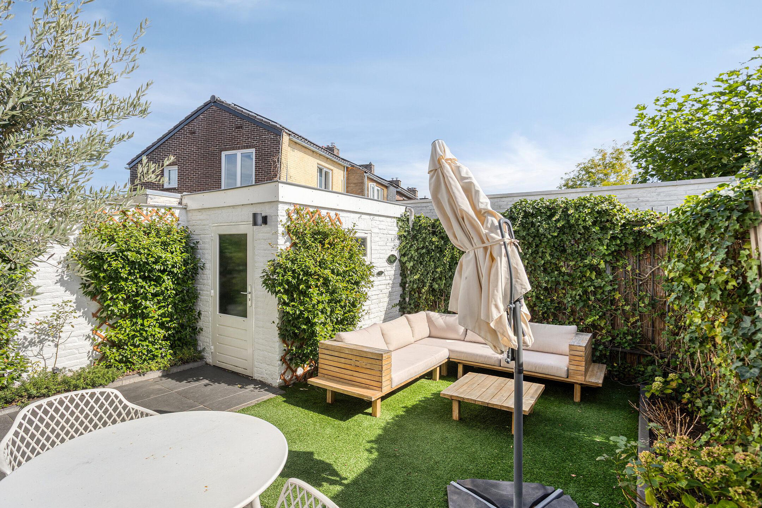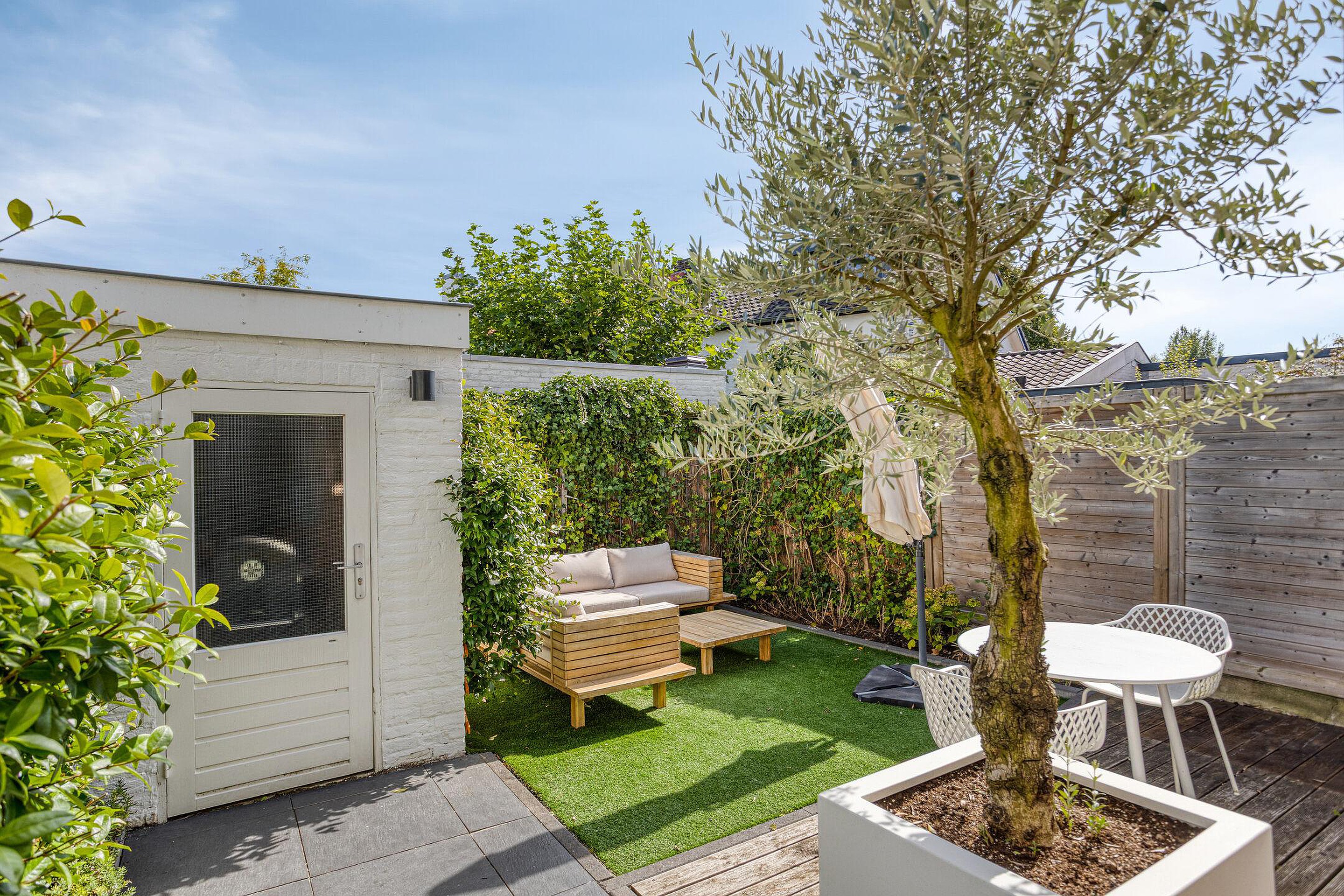 - Gezellige achtertuin op het oosten met achterom en stenen berging;