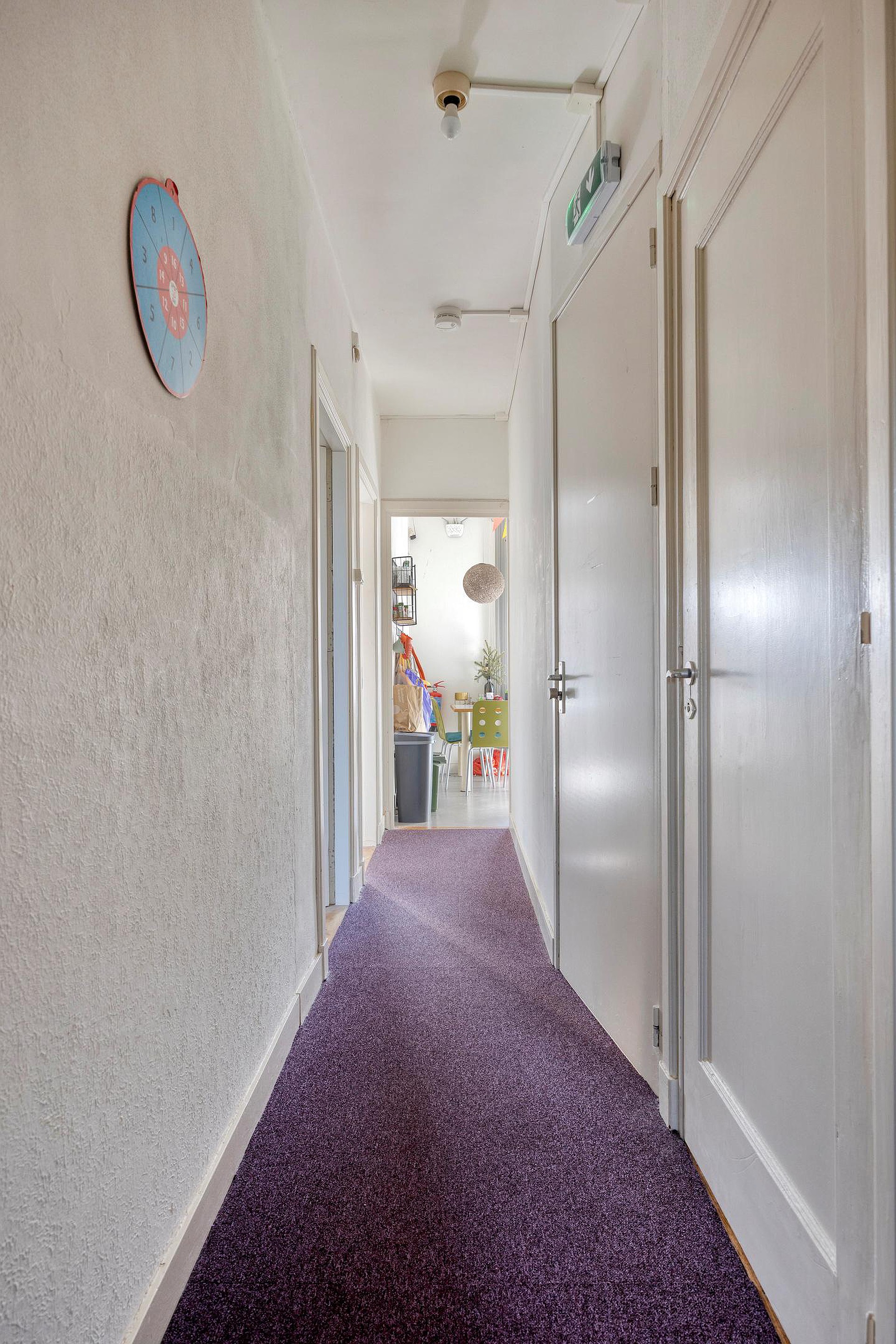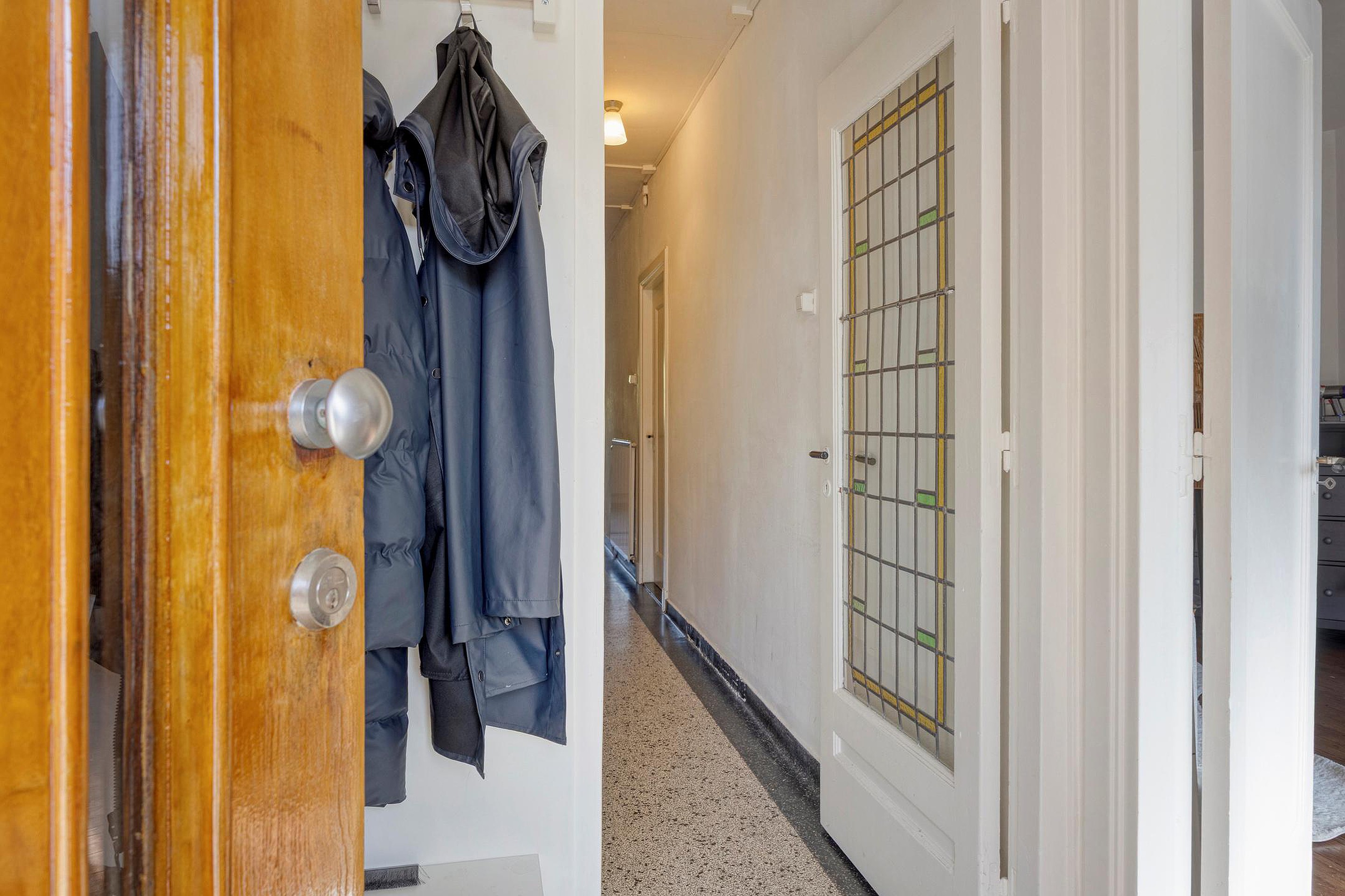 Het appartement op de begane grond beschikt over een eigen entree. Vanuit de hal zijn de verschillende vertrekken toegankelijk.