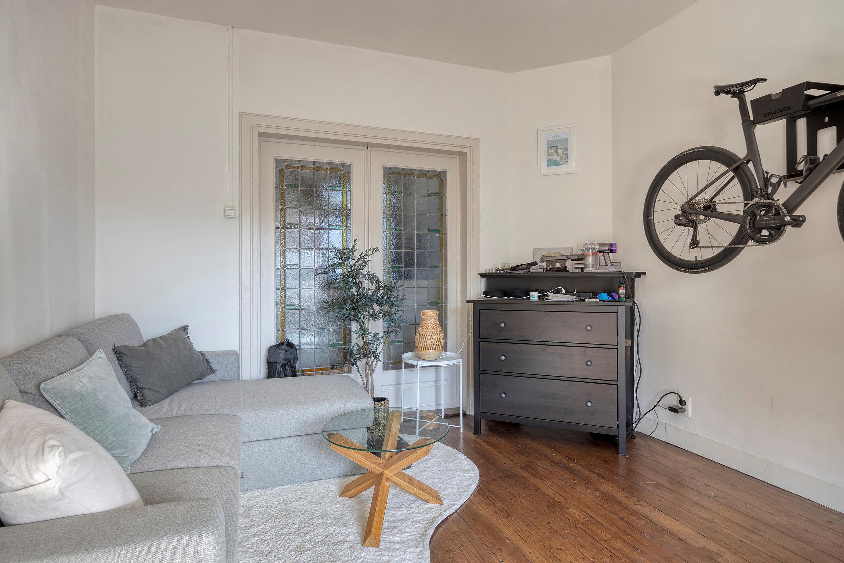 Aan de voorzijde bevindt zich de ruime woonkamer, die is verdeeld over twee compartimenten en beschikt over karakteristieke schuifdeuren. Het achterste gedeelte van de woonkamer staat in verbinding met een extra kamer die bijvoorbeeld kan worden gebruikt als eetkamer of tuinkamer.
