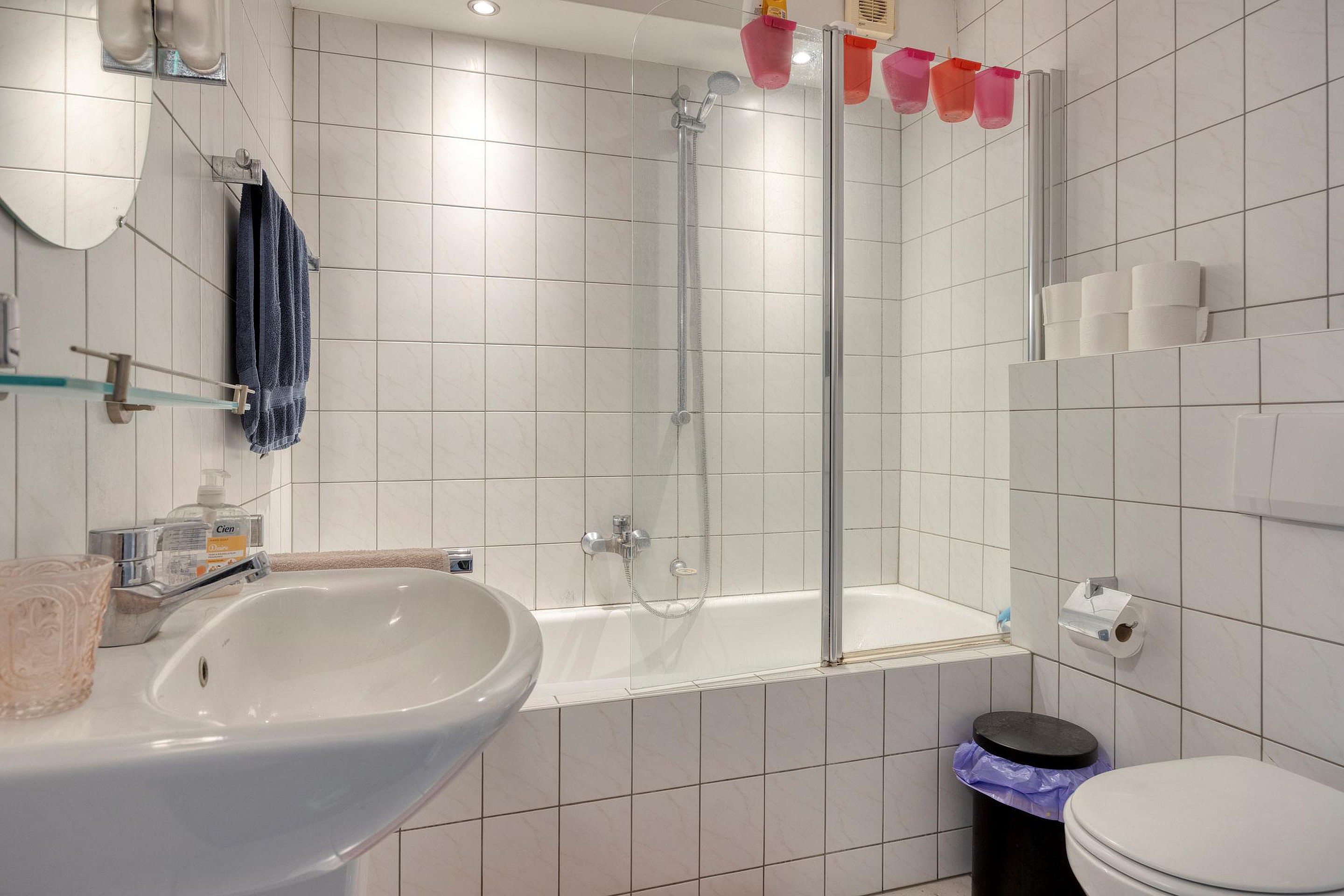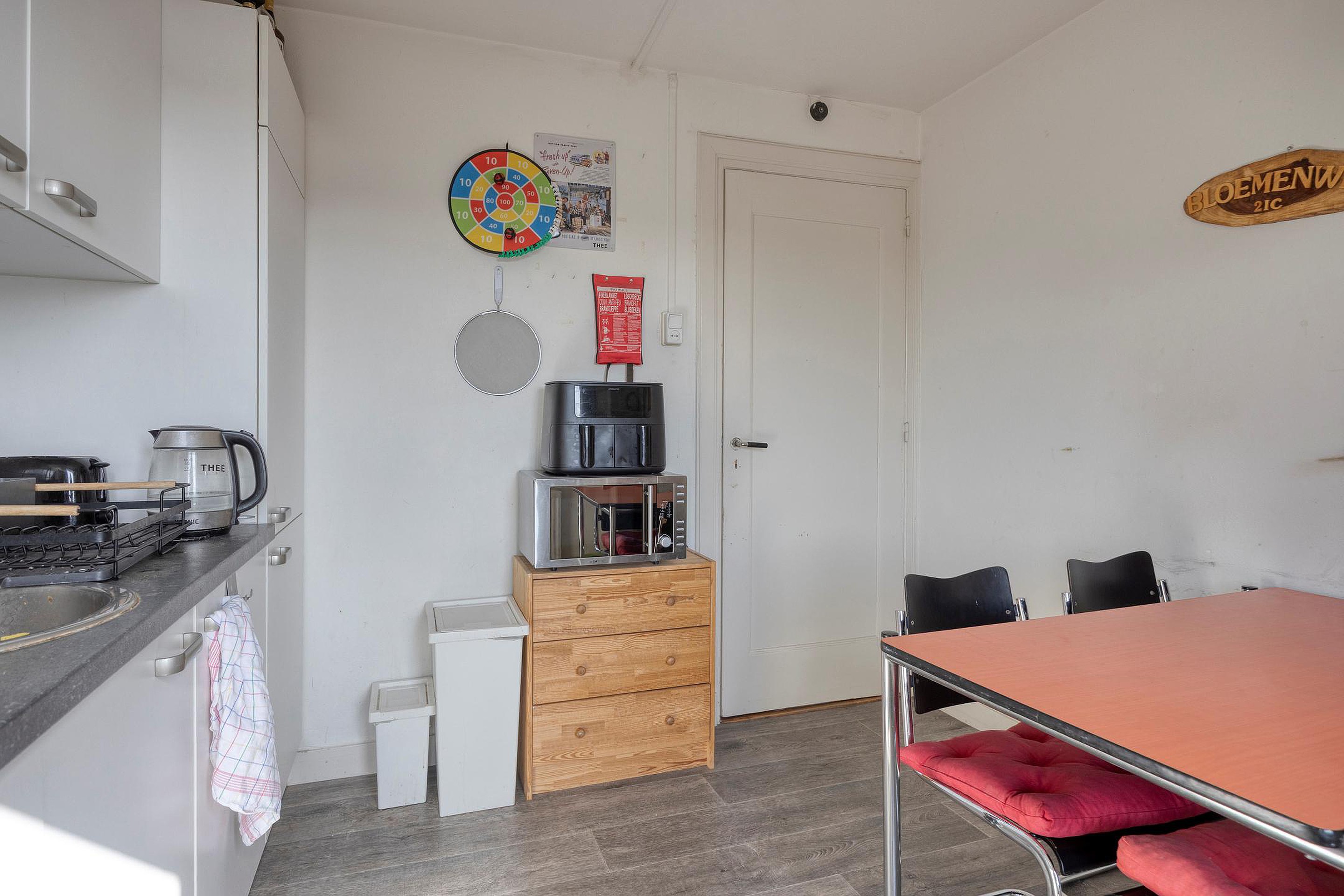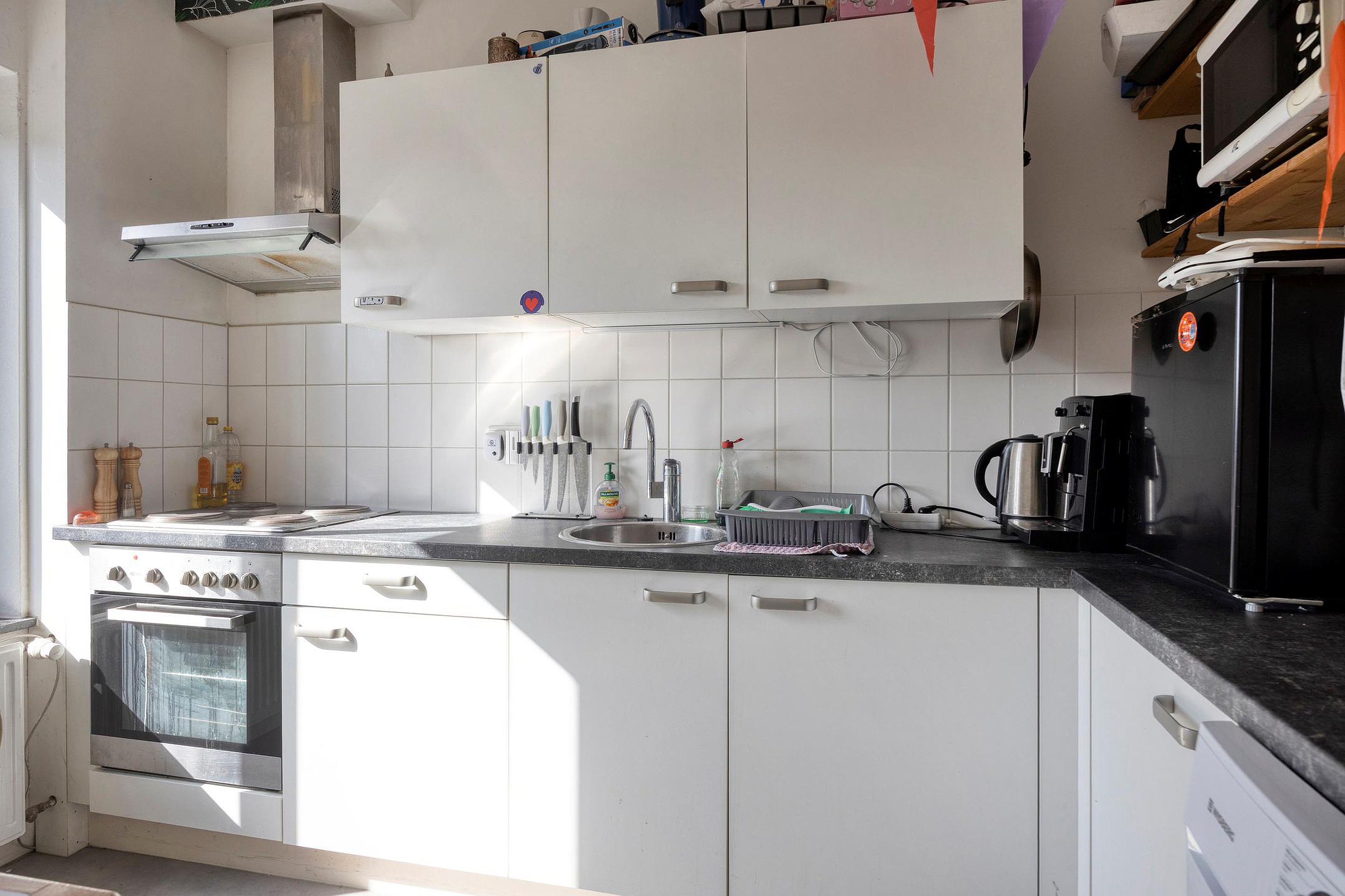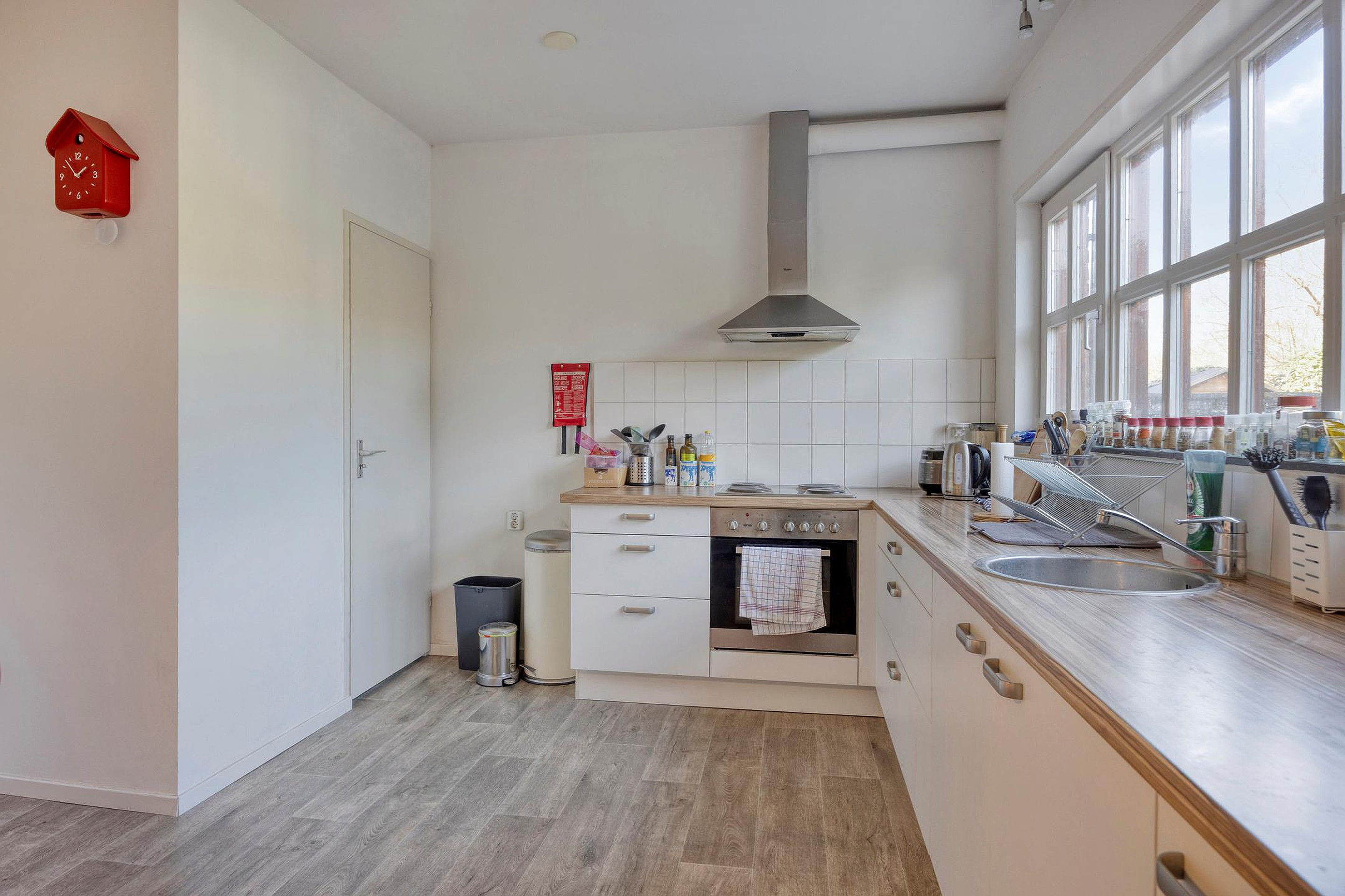 Daarnaast is er een gedeelde keuken aanwezig, voorzien van een kookplaat, oven en koelkast. De badkamer beschikt over een bad met douchecombinatie, een toilet en een wastafel.