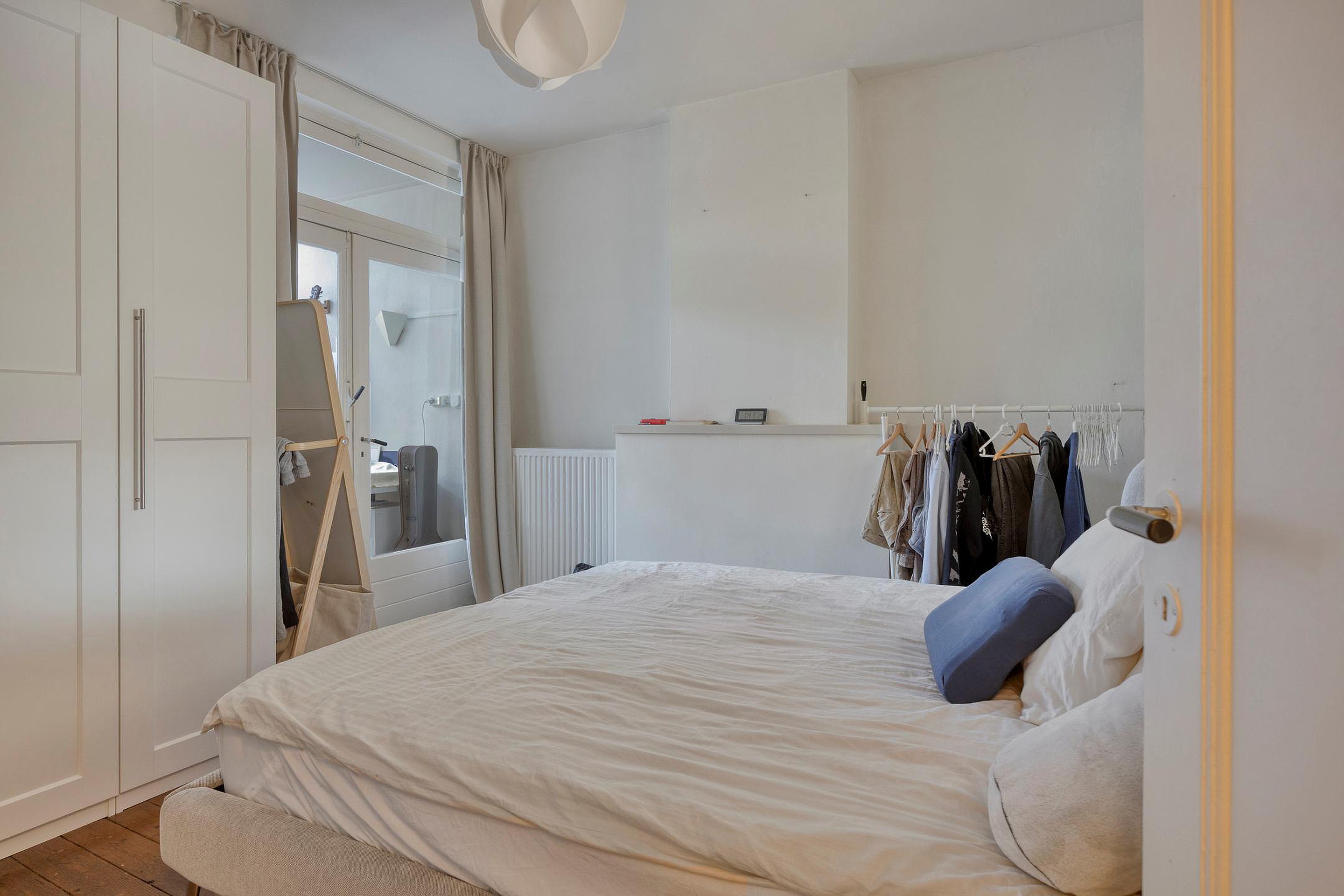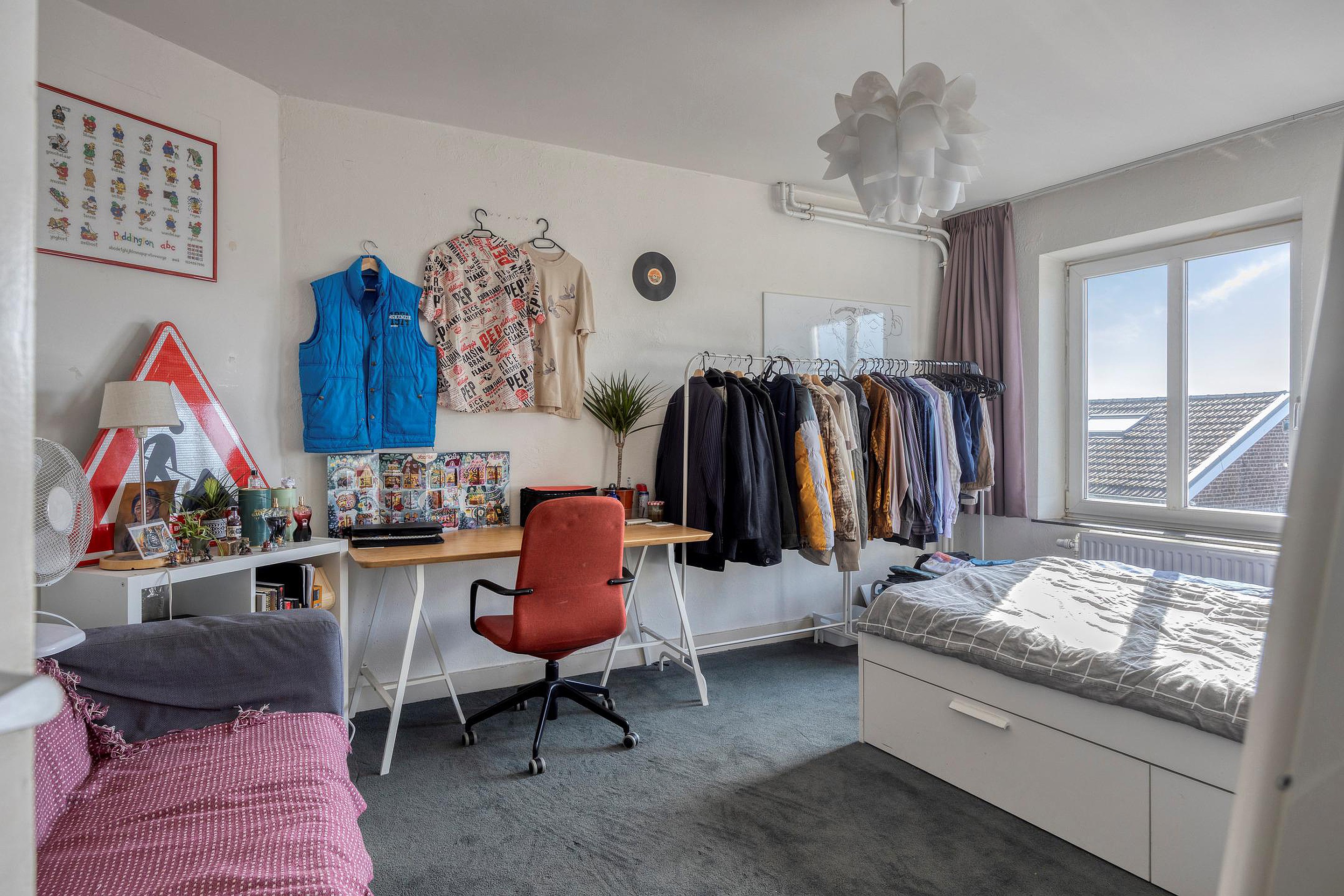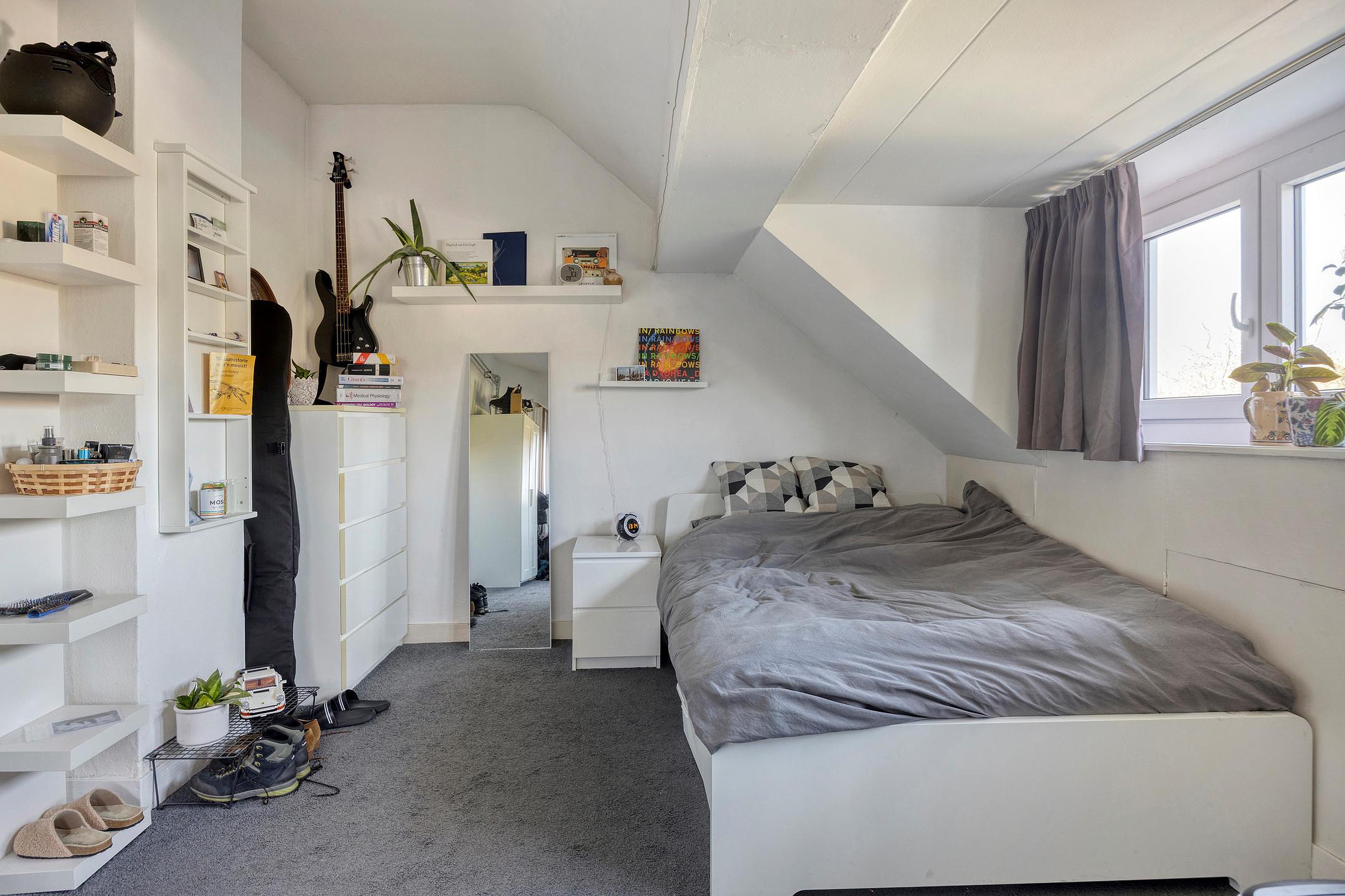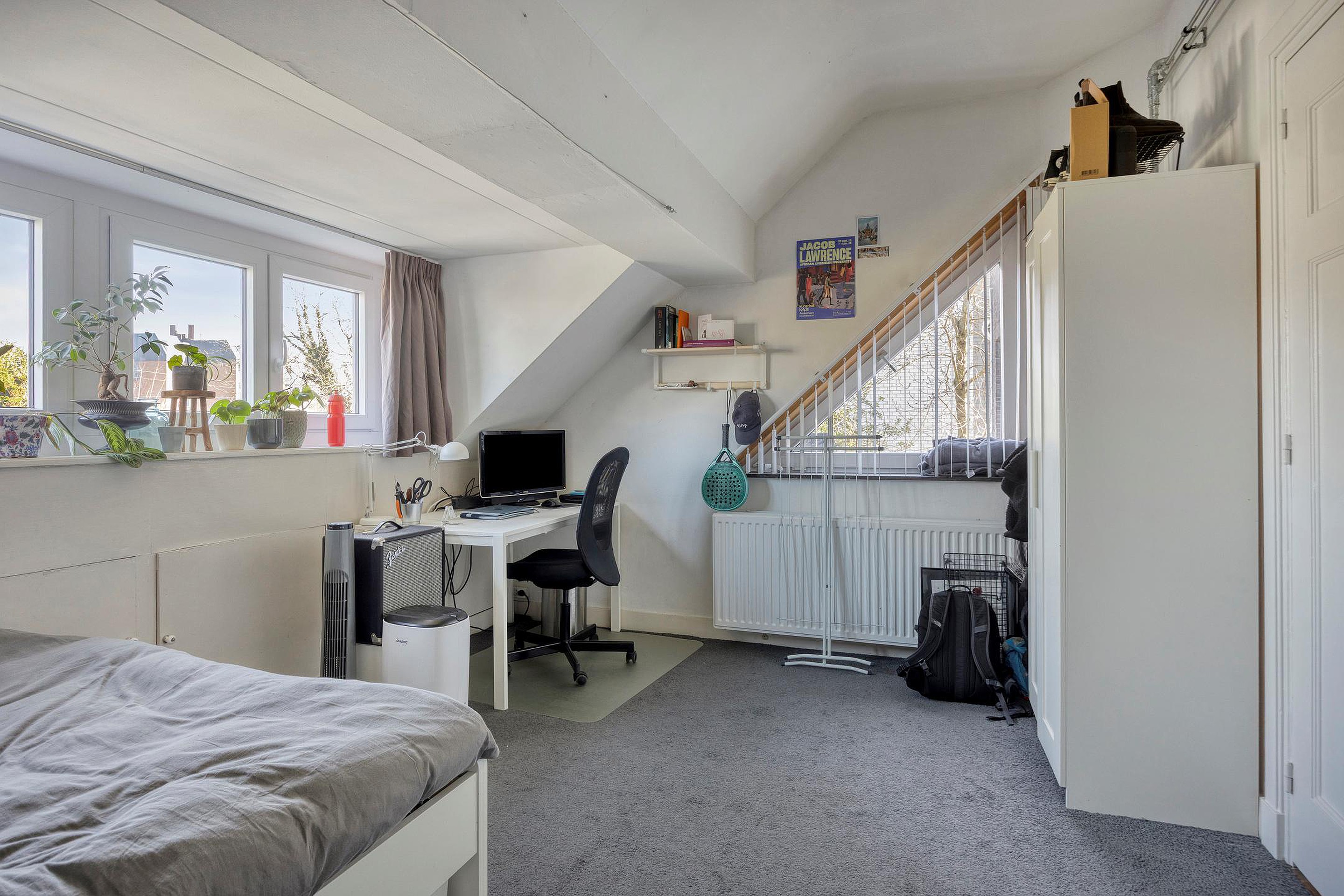 Eén van de kamers aan de achterzijde beschikt over een eigen dakterras, wat een aantrekkelijke extra buitenruimte vormt voor de bewoners.