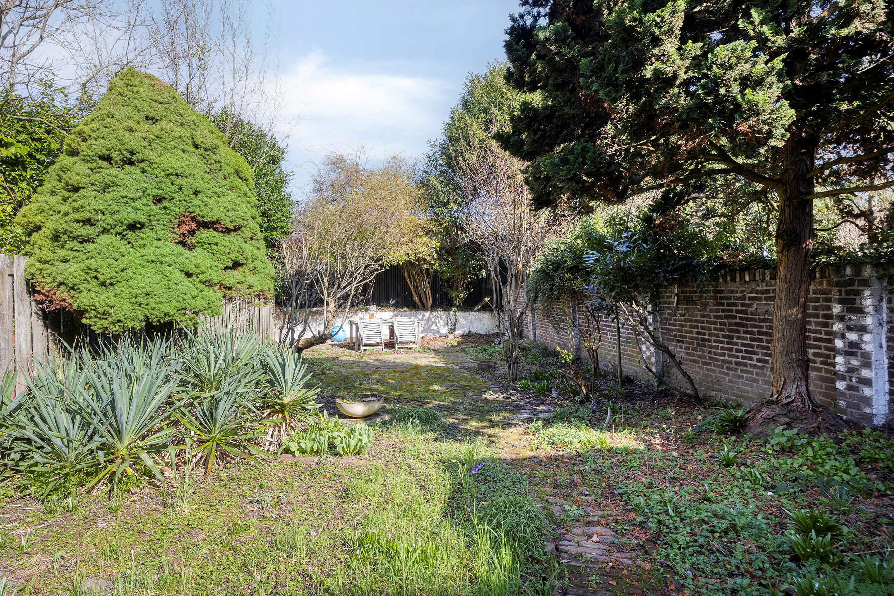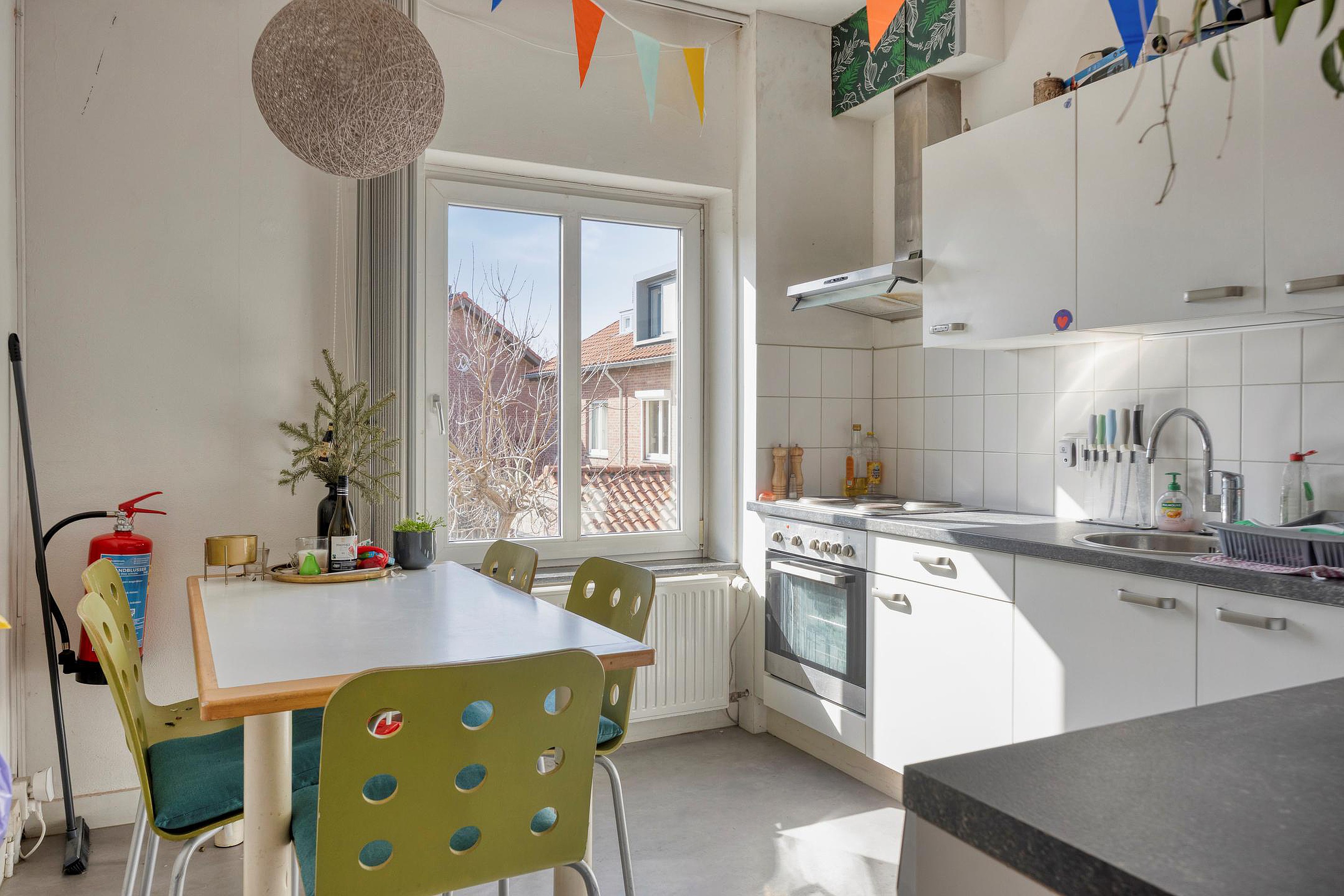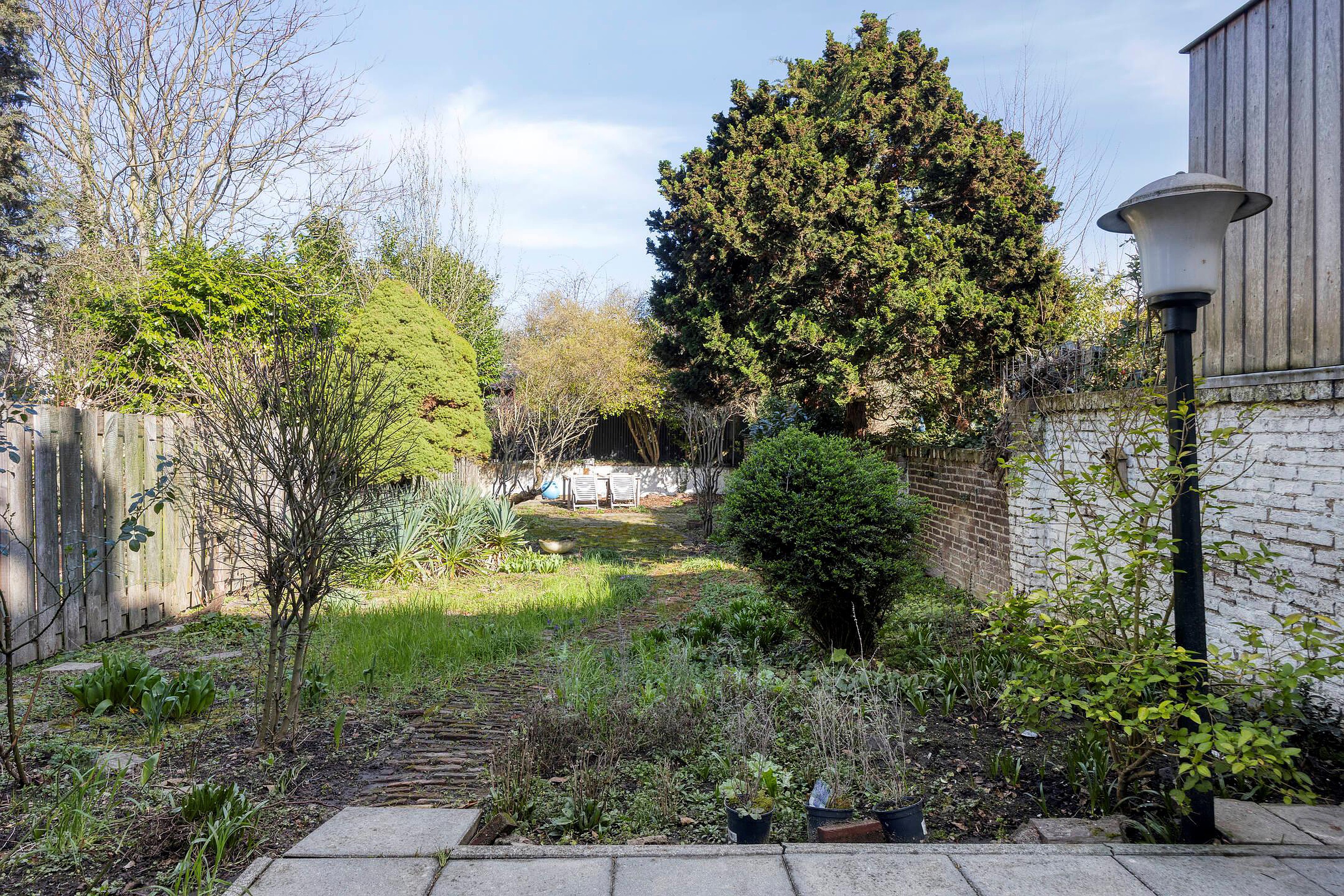 De slaapkamer is centraal in het appartement gelegen en beschikt over vaste kastruimte. Aan de achterzijde bevindt zich de keuken, die toegang biedt tot de ruime achtertuin.