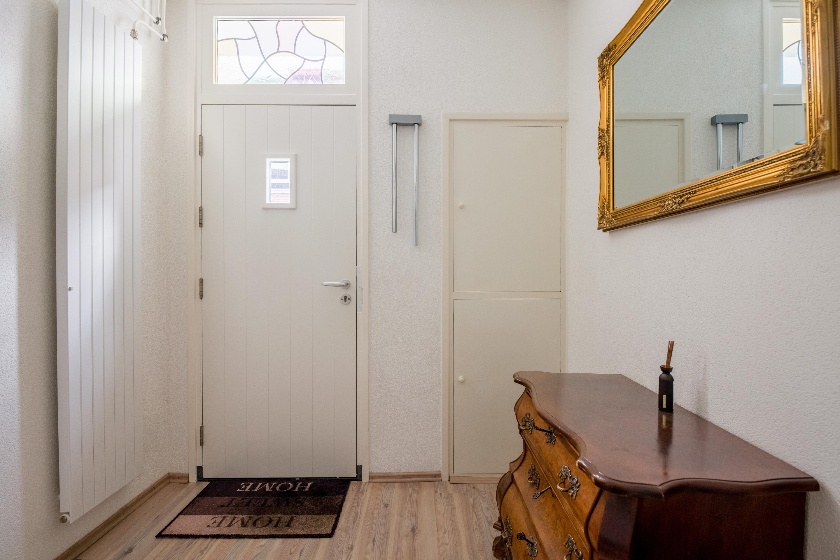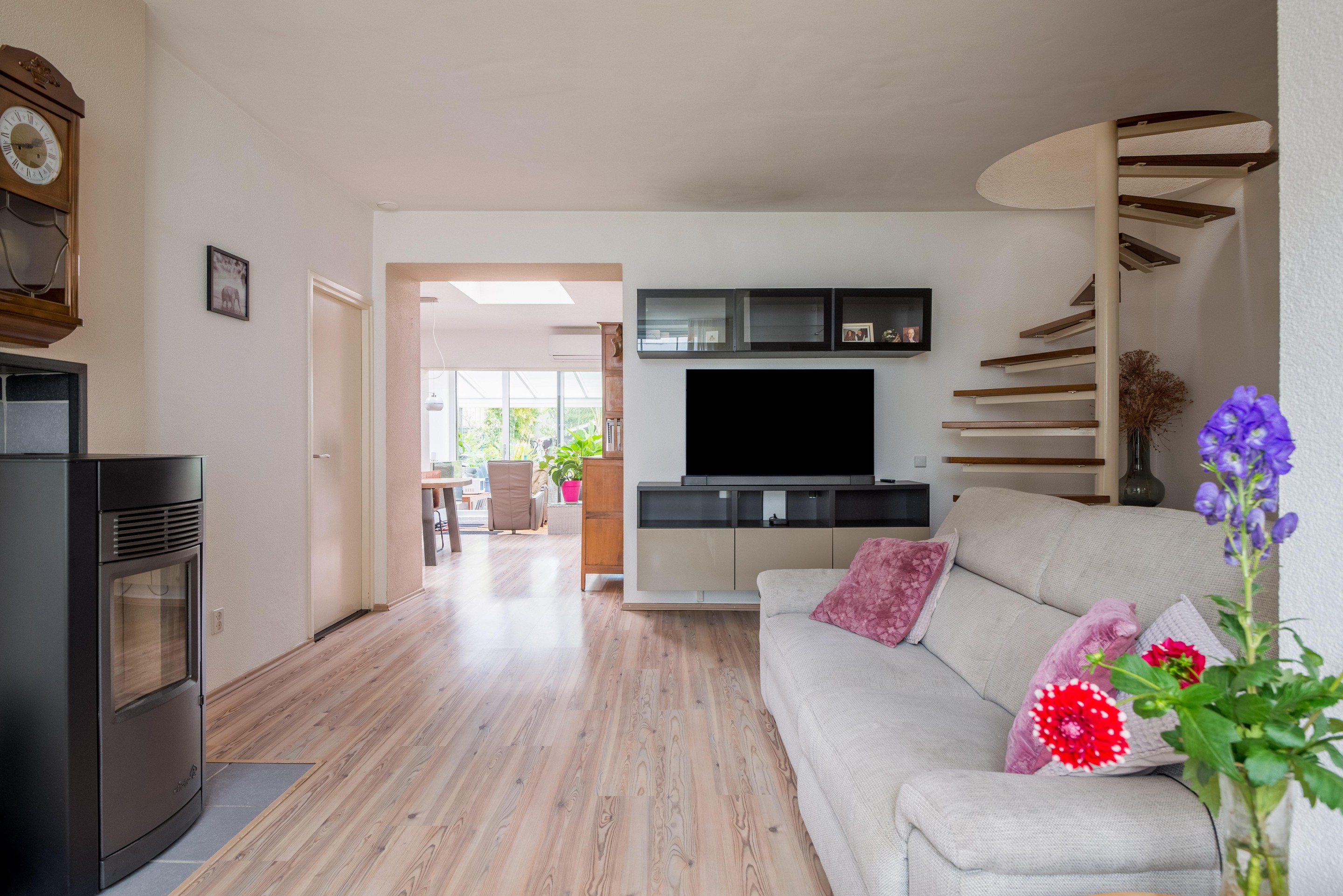 Via een kleine afstap vanaf de straat betreed je de hal met openslaande glazen deuren die direct zicht bieden op de woonkamer (ca. 57,5 m2). Deze vormt het hart van het huis – een sfeervolle ruimte met veel lichtinval en een warm gevoel. Hier vind je ook de pelletkachel (ter overname), airco en toegang tot de overige vertrekken.