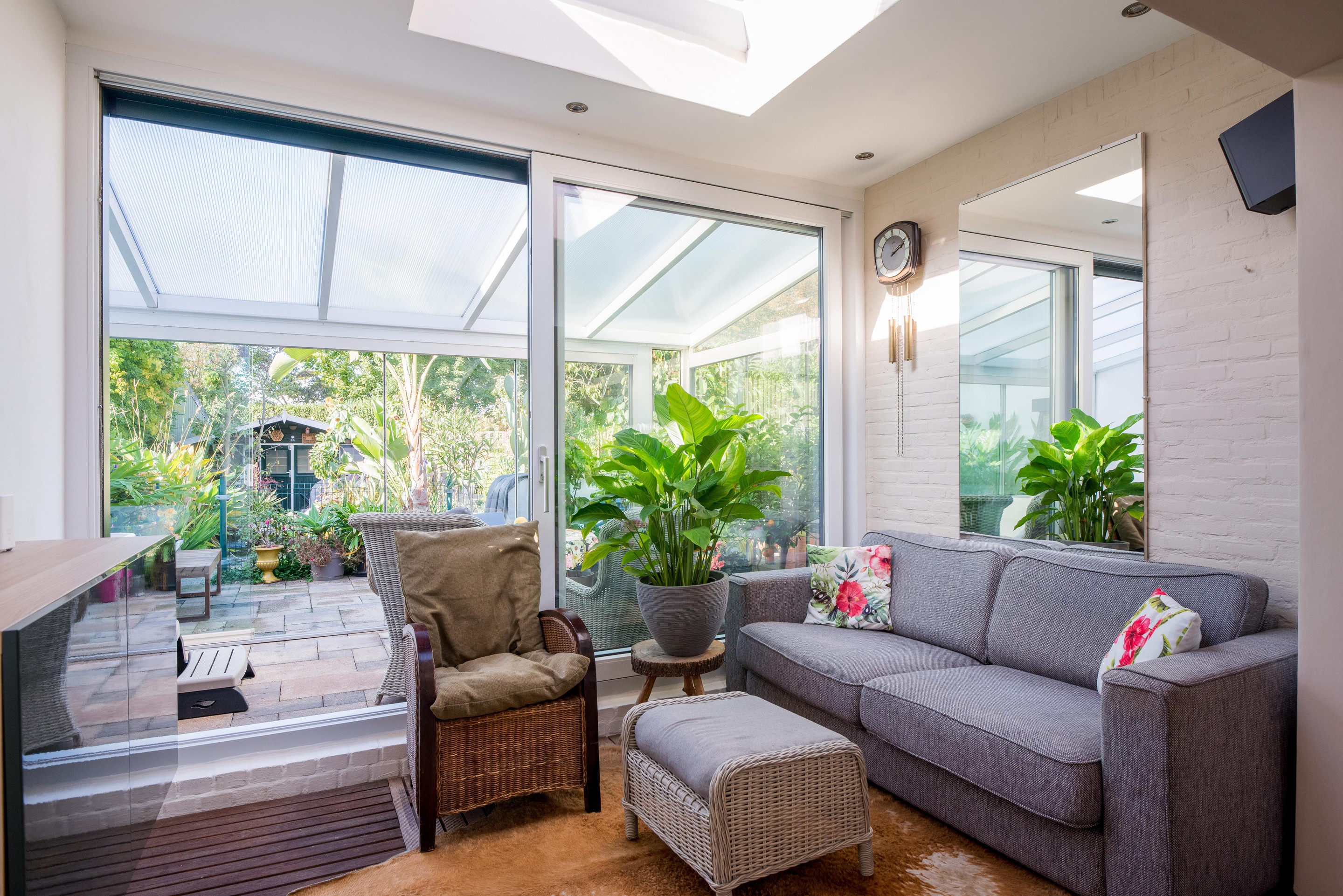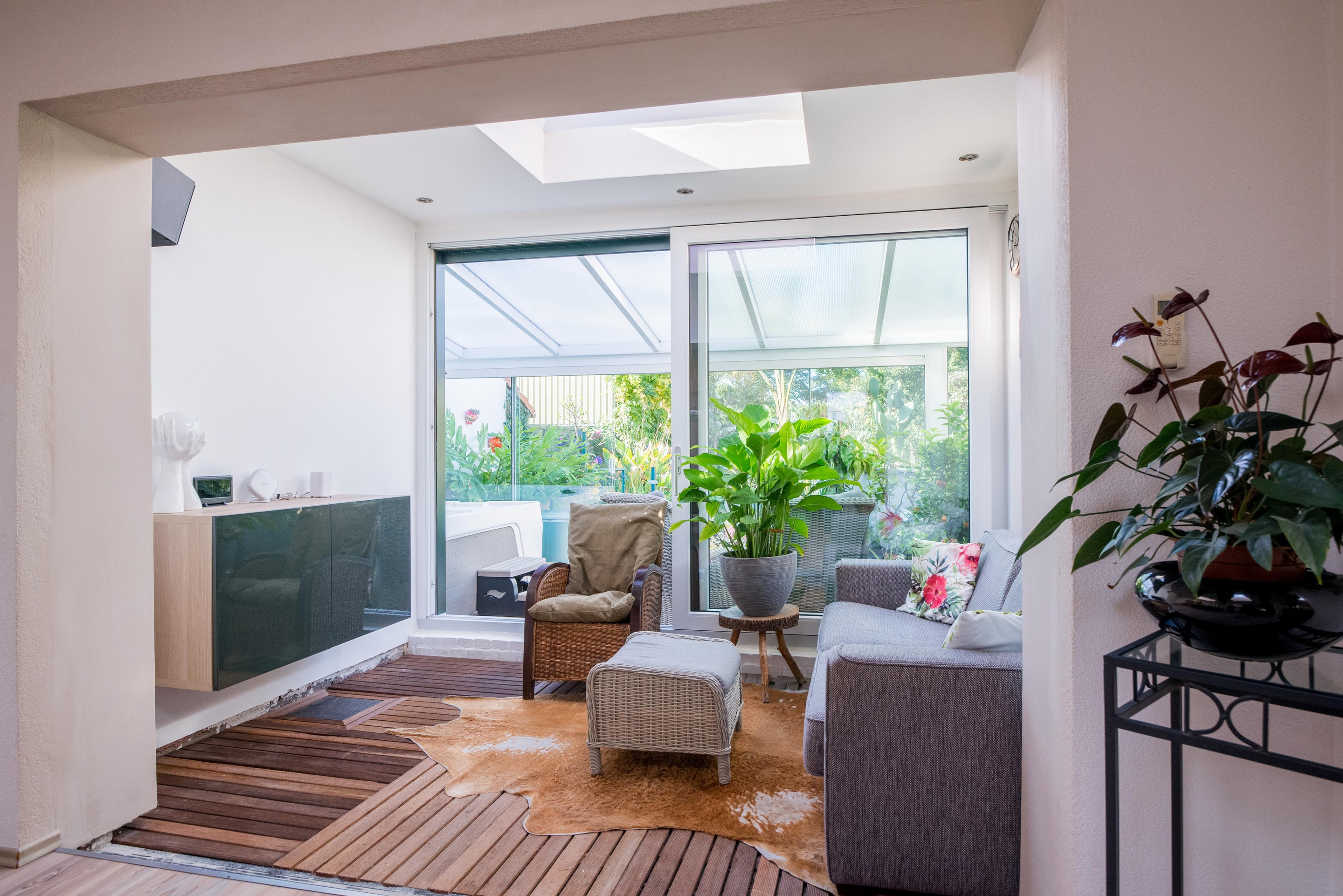 De serre met glazen schuifpui vormt een heerlijke overgang naar buiten – een lichte, beschutte ruimte die elk seizoen uitnodigt om te ontspannen. Hier vind je tevens een jacuzzi (ter overname).