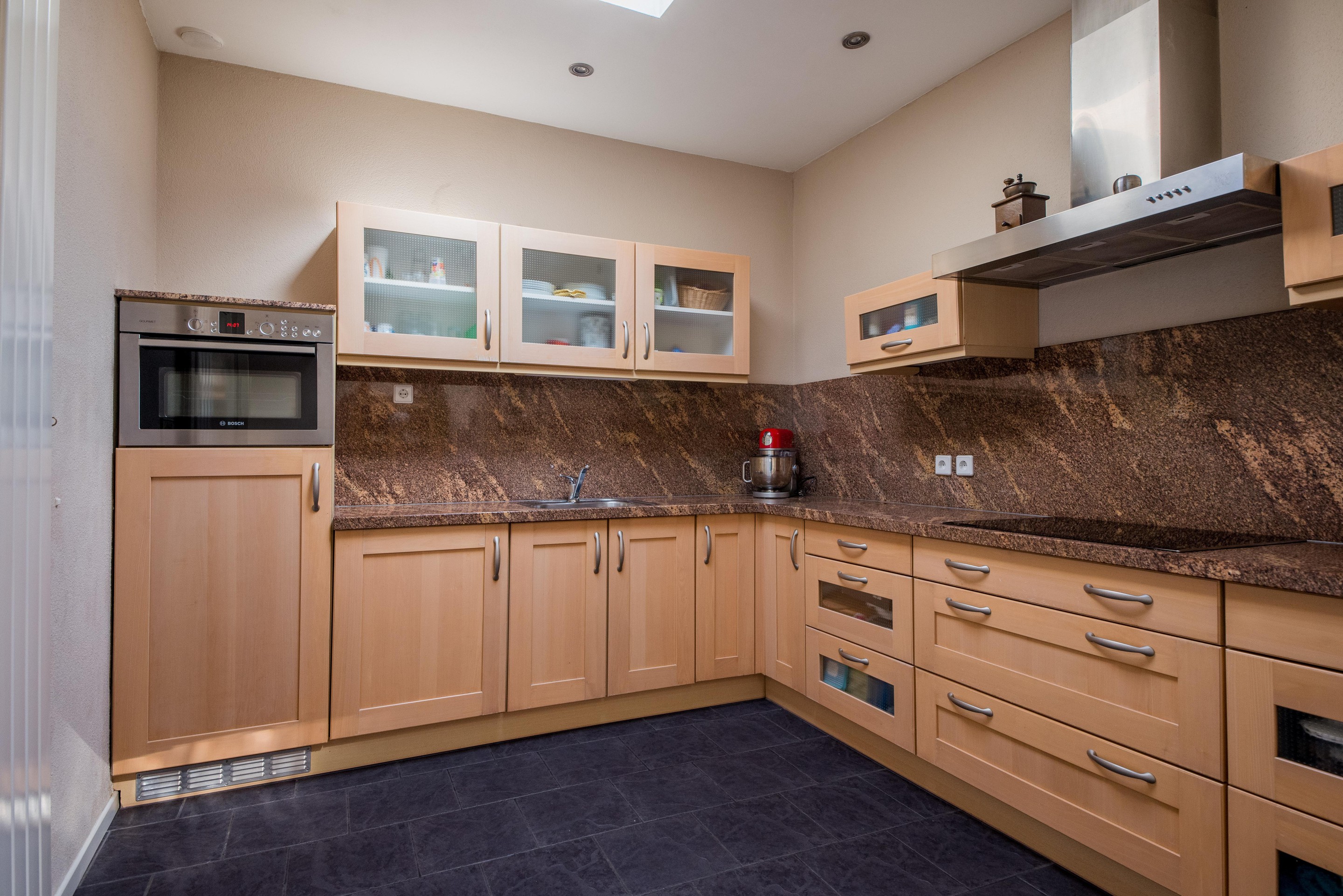 Op de begane grond bevinden zich twee slaapkamers (resp. ca. 12 m2 en ca. 17 m2), een functionele keuken (ca. 11 m2), de badkamer (ca. 9 m2) en een serre (ca. 15 m2). De keuken is voorzien van moderne inbouwapparatuur zoals een inductiekookplaat, combi-oven, vaatwasser en afzuigkap. Aan de achterzijde ligt de praktische bergruimte met witgoedaansluiting, gevolgd door de ruime badkamer met toilet, dubbele wastafel, ligbad en douche.