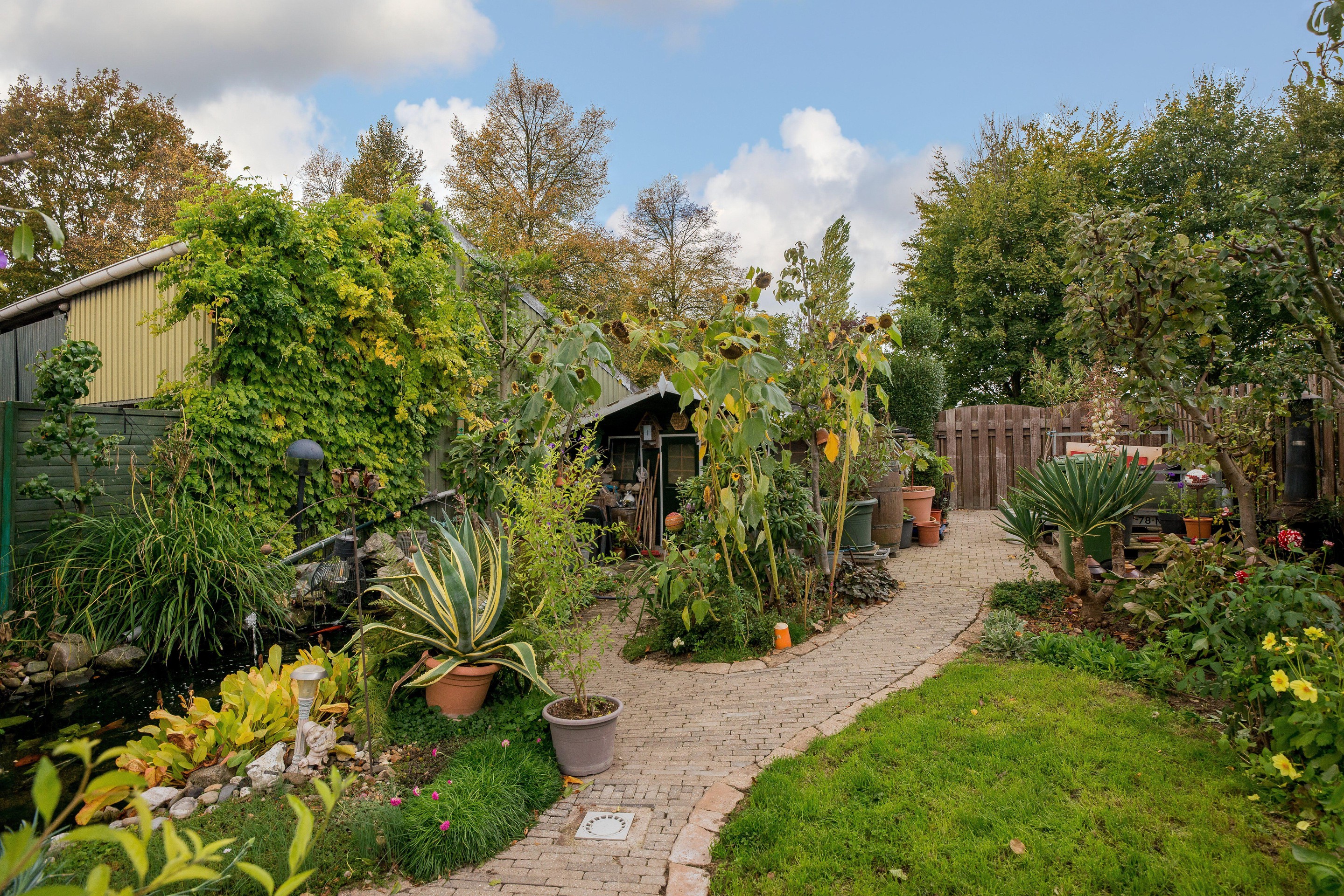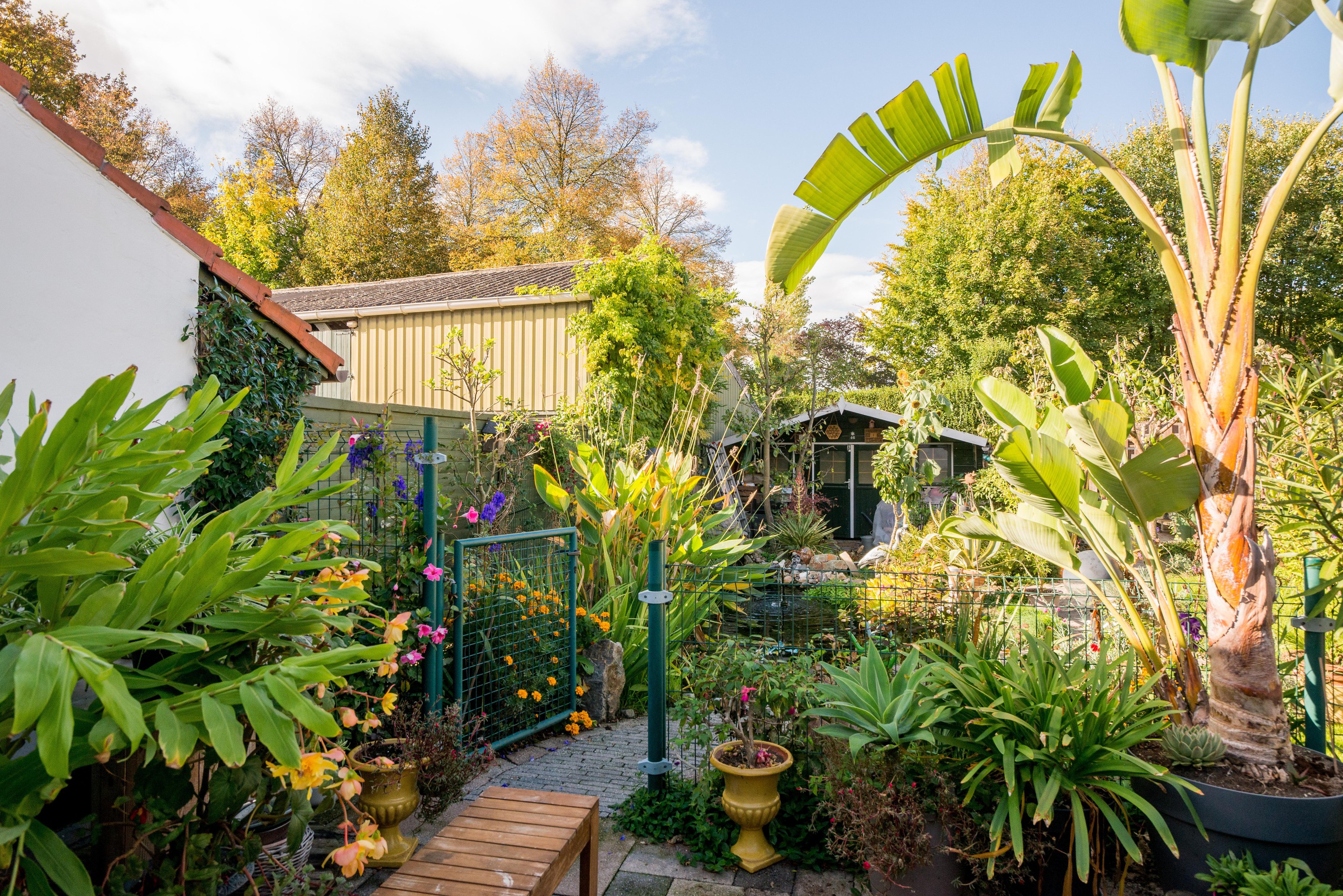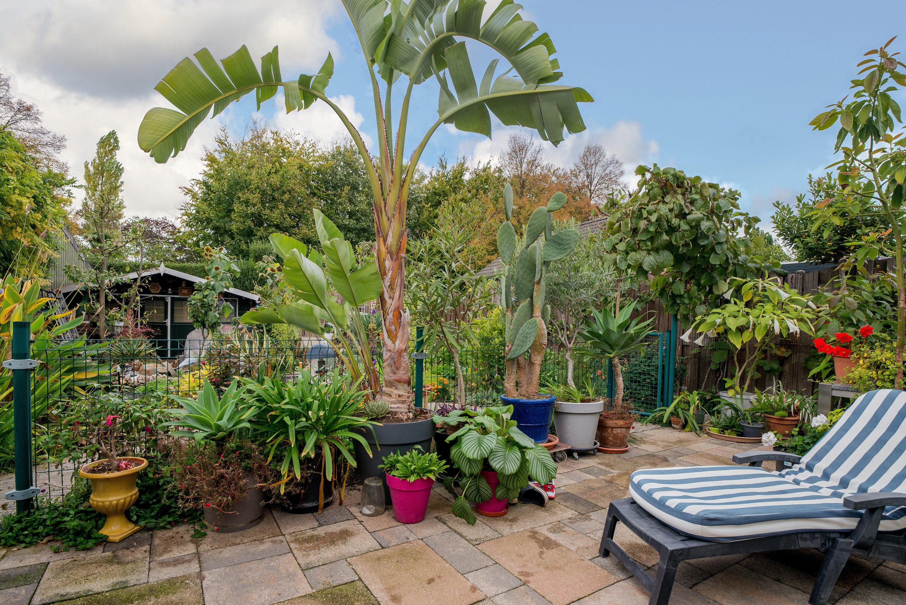 De achtertuin is een groene oase van rust, zorgvuldig aangelegd en rijk aan beplanting. Vanuit de serre loop je via een glazen schuifwand de tuin in, waar een diversiteit aan planten, een waterpartij en een fijn terras op je wachten. De tuin is ca. 17 meter diep en 8,5 meter breed, georiënteerd op het noordwesten en voorzien van een achterom. Achterin staat een berging (ca. 2,7 x 4,2 m), ideaal voor fietsen en tuingereedschap.
