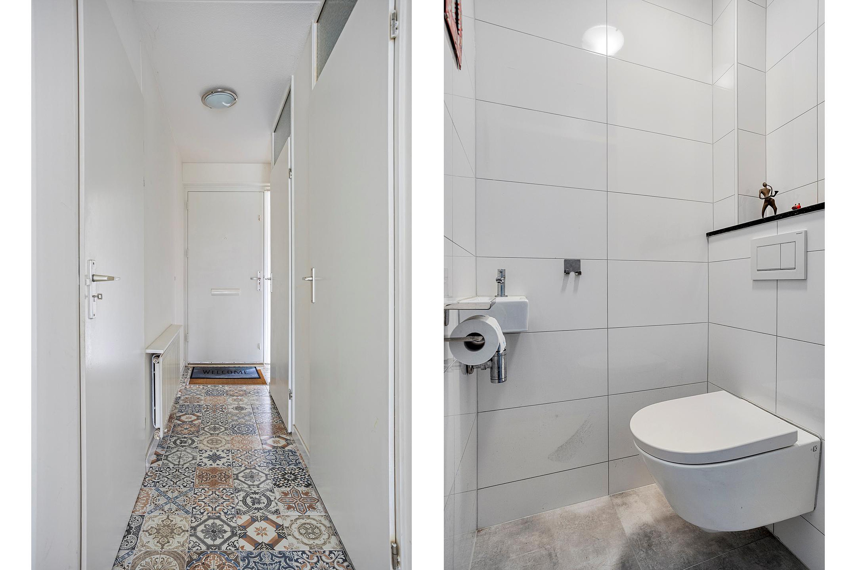 Overdekte entree (ca. 12m2). Inkomhal (ca. 3,5m2) met meterkast (automatische zekeringen, 2 aardlekschakelaars, slimme meters en watermeter), toilet, berging met de witgoedaansluitingen en toegang tot de inpandige garage en de leefkeuken. Het toilet (ca. 1m2) is geheel betegeld en voorzien van een wandcloset en een fonteintje. De garage (ca. 16m2) is voorzien van licht, elektra, watertappunt en een elektrische rolpoort. Royale woonkeuken (ca. 22,5m2) welke aan de achterzijde van de woning is gelegen en met een brede schuifpui toegang geeft tot de achtertuin. De keuken beschikt over een luxe keukeninstallatie in hoekopstelling (geplaatst in 2022), met boven- en onderkasten en de navolgende inbouwapparatuur: inductiekookplaat met 5 zones, spoelbak, vaatwasser, koelkast, vriezer, afzuiginstallatie, oven, combimagnetron en een quooker. Het geheel is mooi afgewerkt met een moderne tegelvloer voorzien van vloerverwarming. Via een vaste trap is de eerste verdieping te bereiken. De gehele begane grond (m.u.v. garage) is voorzien van moderne tegelvloeren.