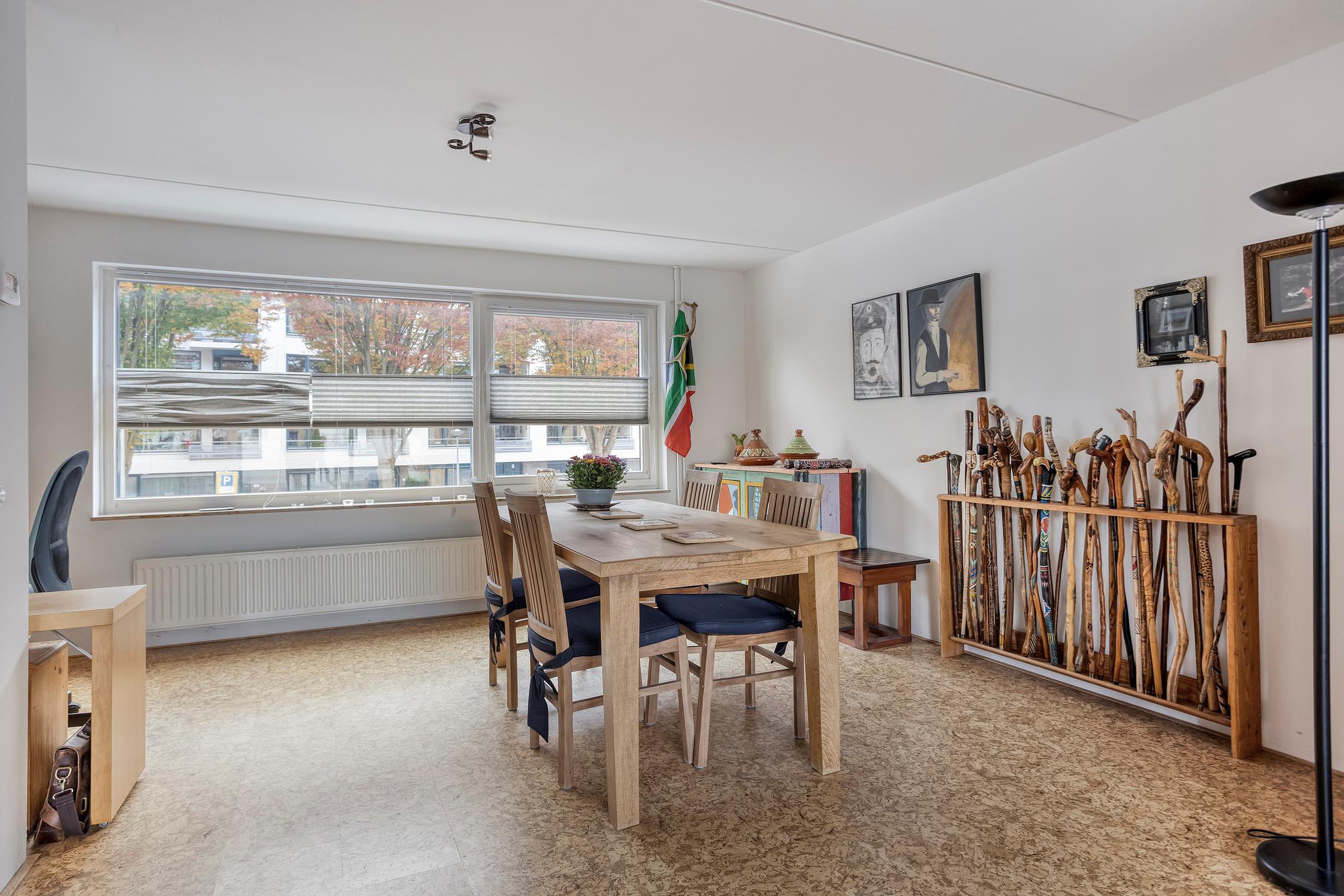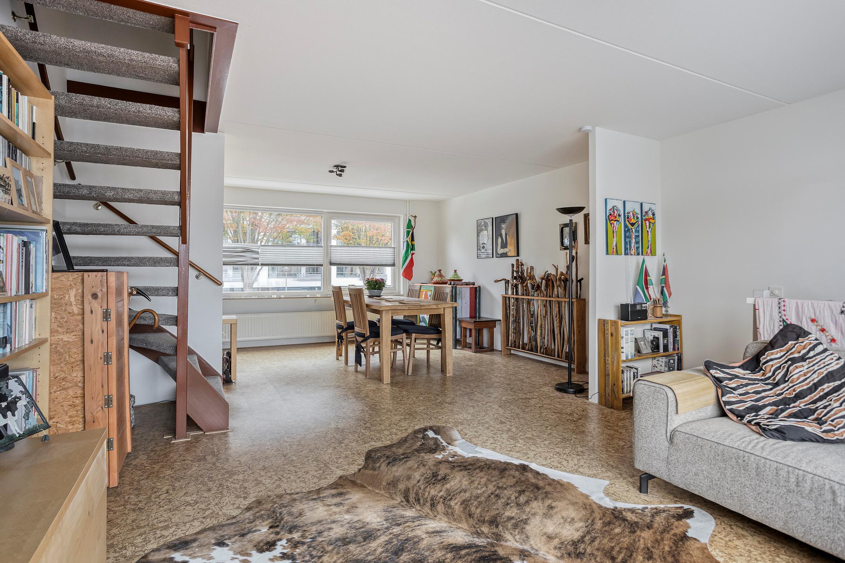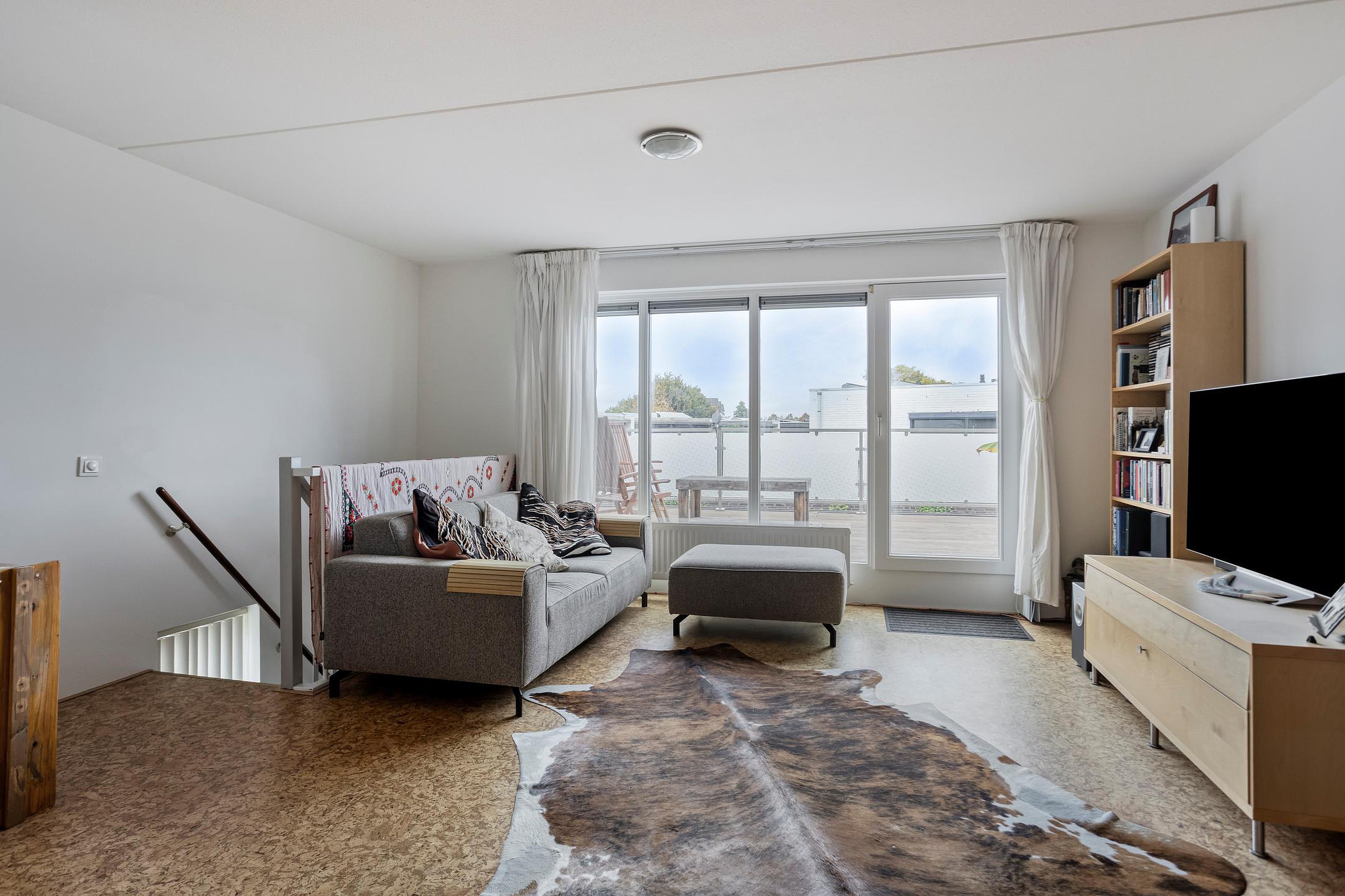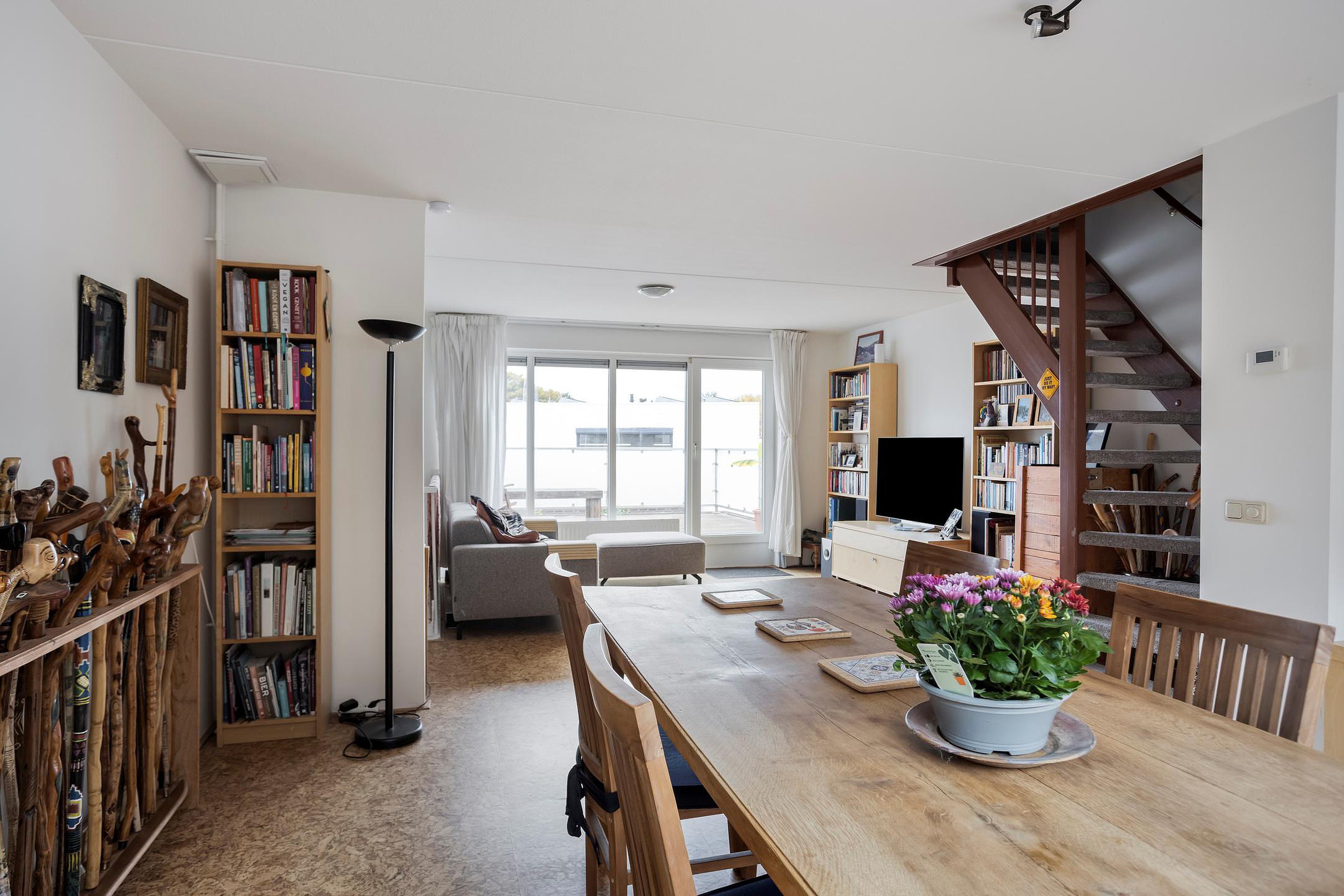 Vanuit de woonkeuken op de begane grond bereikt men middels een vaste trap de ruime, lichtovergoten woonkamer (ca. 39m2), voorzien van een lichte kurkvloer. De eetkamer is aan de straatzijde gelegen, de zithoek is aan de achterzijde gesitueerd. Aan de achterzijde van de woning is er via een openslaande tuindeur toegang tot het dakterras (ca. 19,5m2), welk boven de keuken is gesitueerd. Hier kan men heerlijk genieten in de ochtend en/of avondzon. Vanuit de woonkamer is met een vaste trap de tweede verdieping te bereiken.
