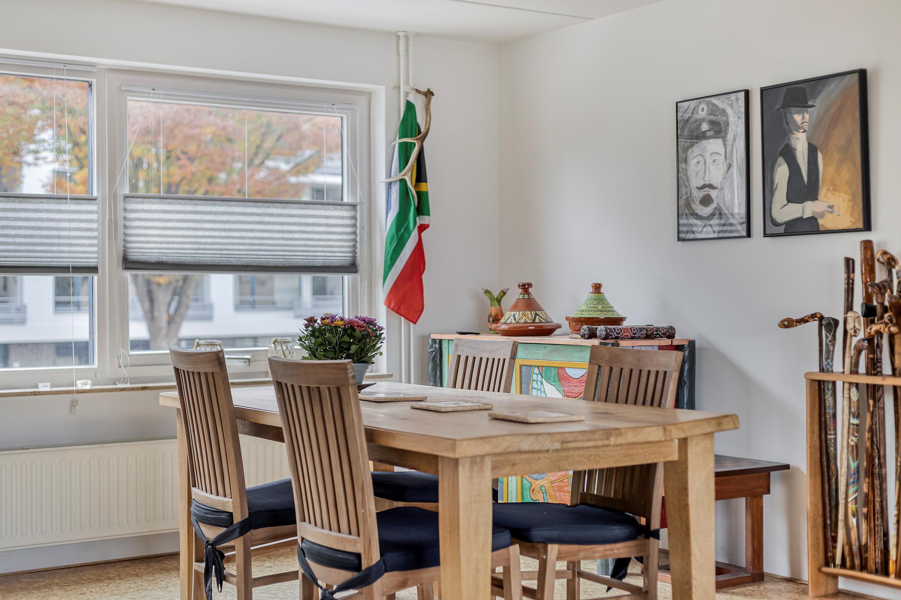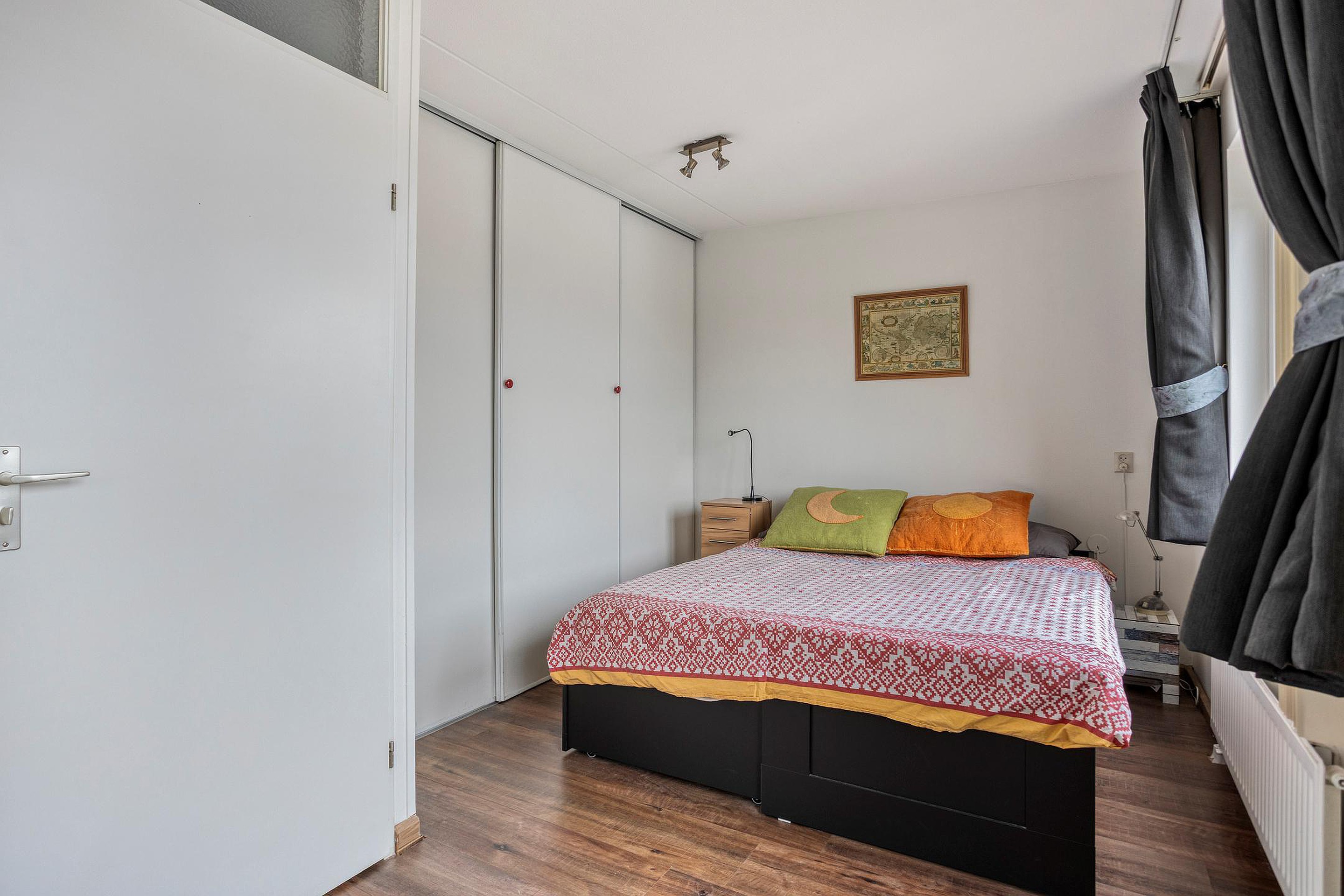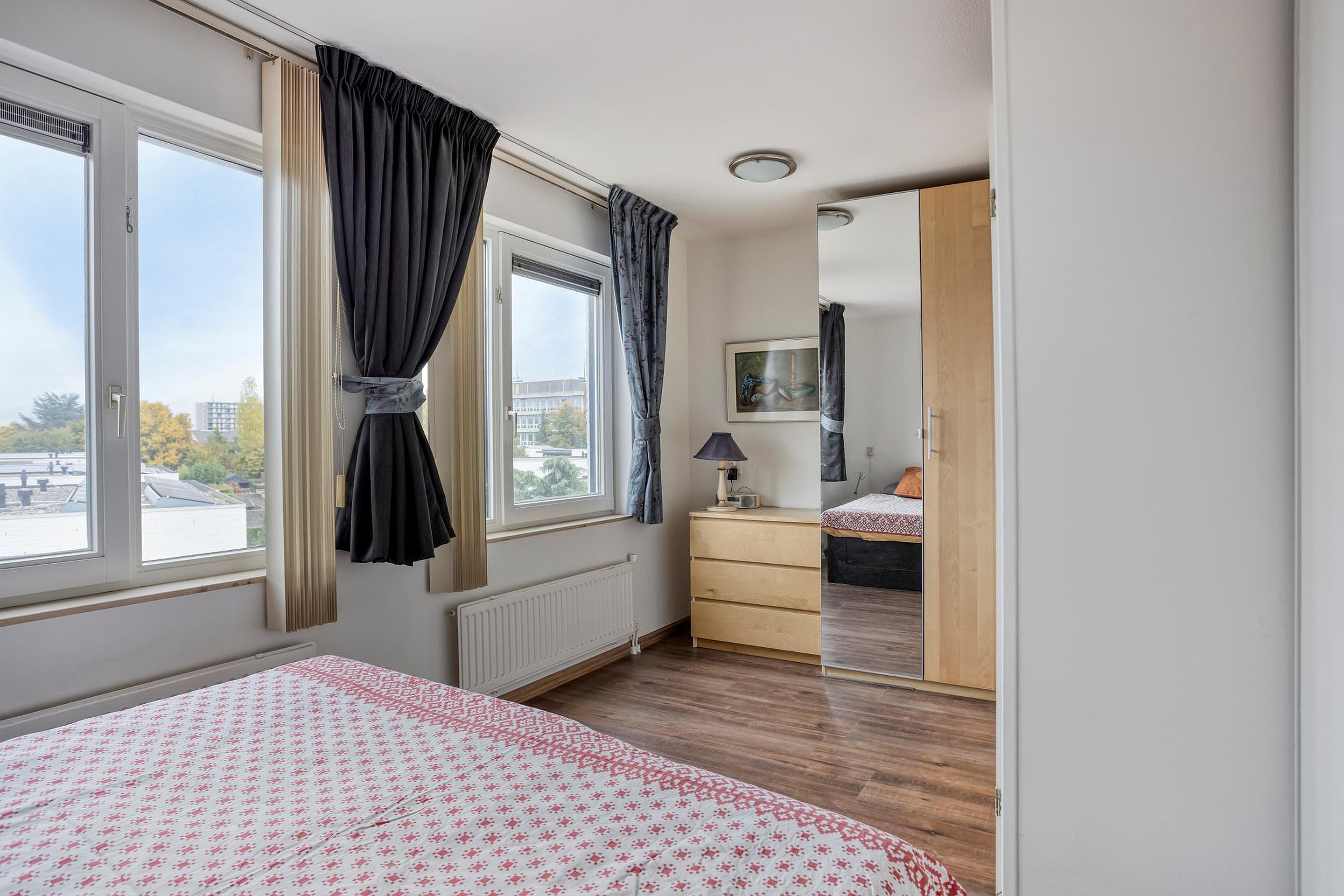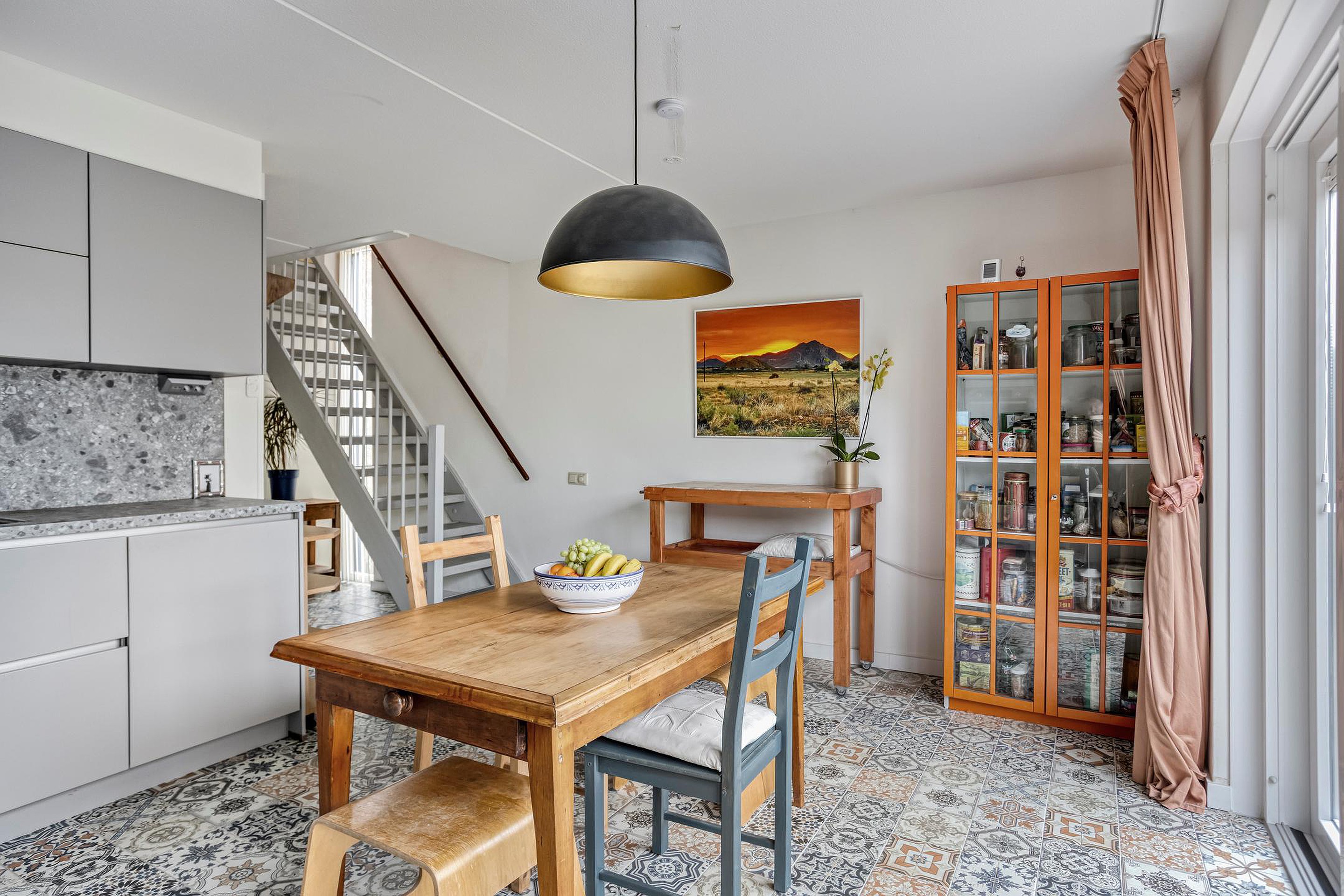 Vanuit de woonkeuken op de begane grond bereikt men middels een vaste trap de ruime, lichtovergoten woonkamer (ca. 39m2), voorzien van een lichte kurkvloer. De eetkamer is aan de straatzijde gelegen, de zithoek is aan de achterzijde gesitueerd. Aan de achterzijde van de woning is er via een openslaande tuindeur toegang tot het dakterras (ca. 19,5m2), welk boven de keuken is gesitueerd. Hier kan men heerlijk genieten in de ochtend en/of avondzon. Vanuit de woonkamer is met een vaste trap de tweede verdieping te bereiken.